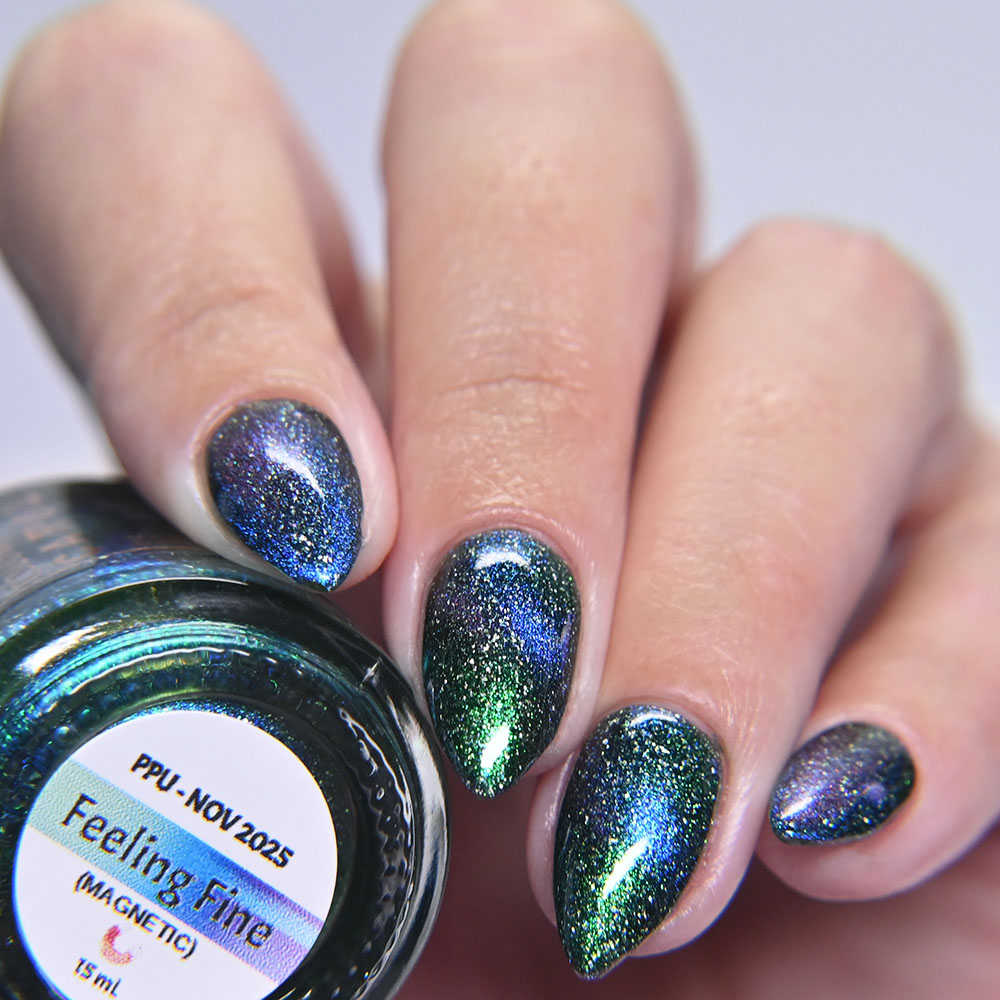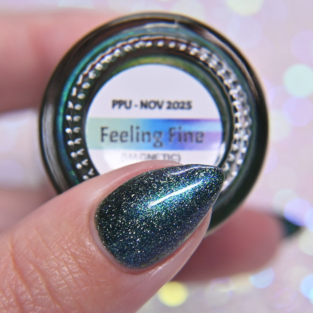 Description: Feeling Fine is a teal green with shifting shimmer, holo micro flakes and multichrome magnetic effect.