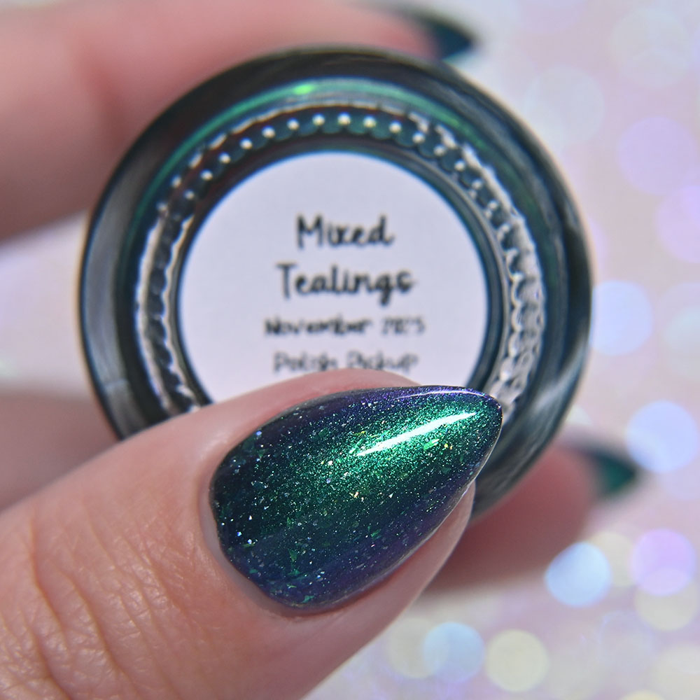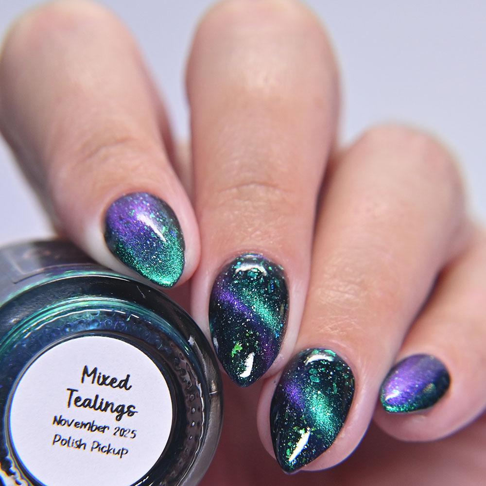 Description: Mixed Tealings is a deep teal jelly base with teal to blue to purple magnetic pigment, as well as green glass flakes and silver flakes.