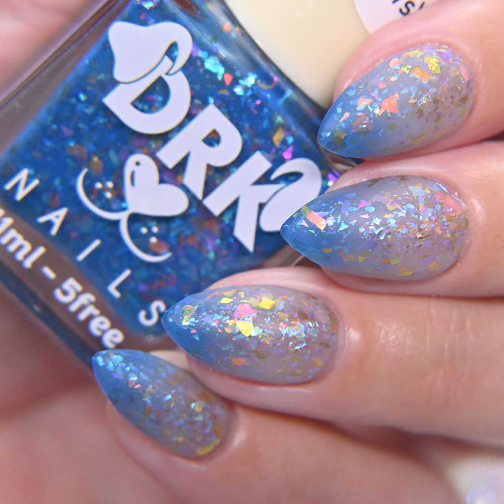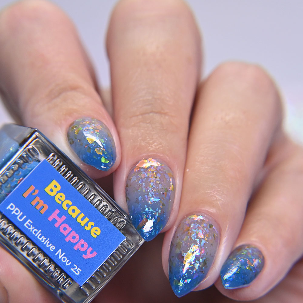 Description: Because I’m Happy is a jelly based thermal that shifts from super pale, sheer blue to medium blue, with a mix of four different flakes.