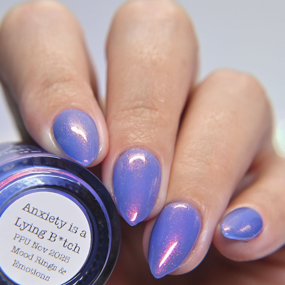 Description: Anxiety is a Lying B*tch is a sheer periwinkle with red/orange shifting shimmer.