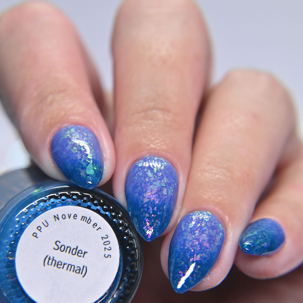 Description: Sonder is a blue-leaning teal thermal when cold that shifts to lilac when warm and is filled with pinky-purple iridescent flakes.
