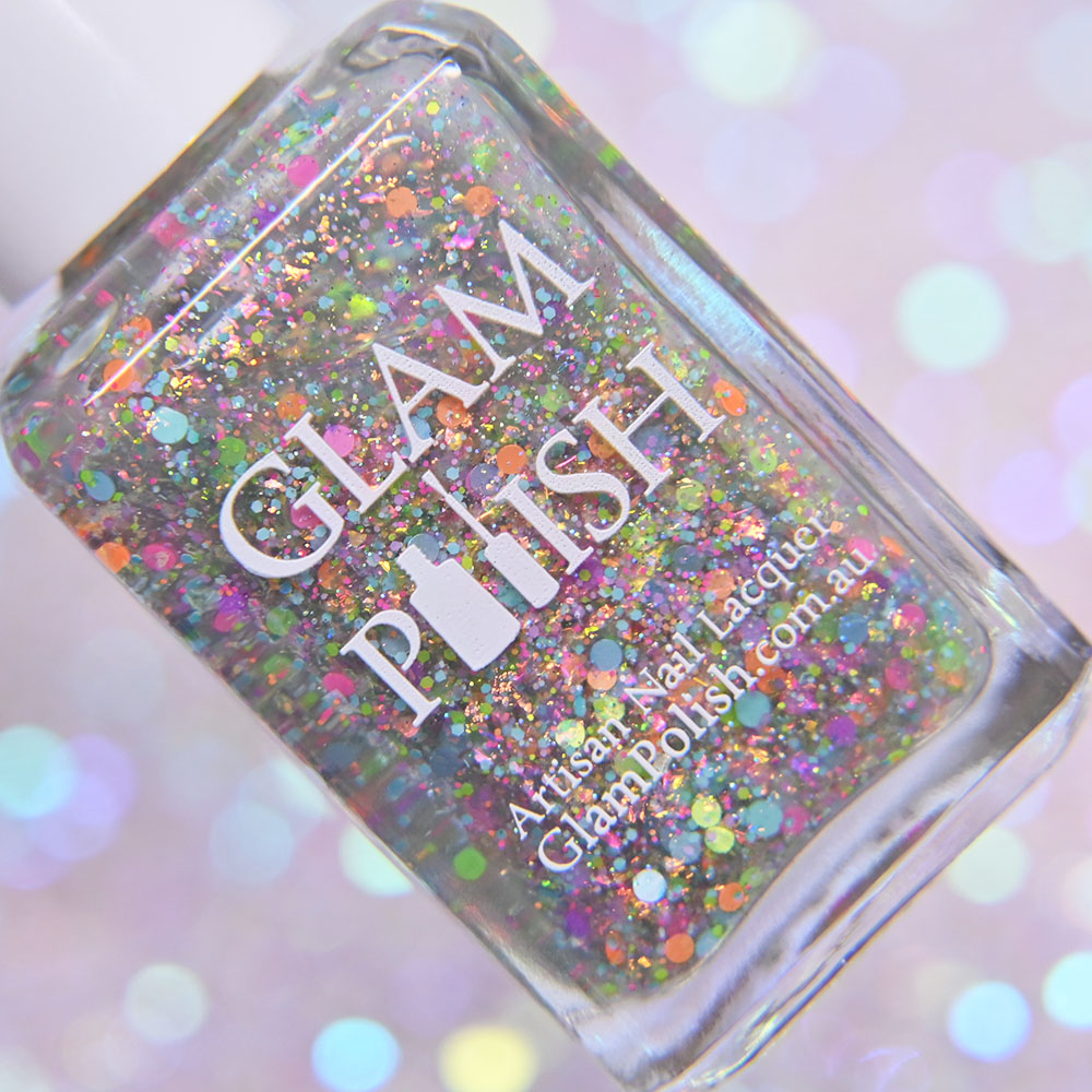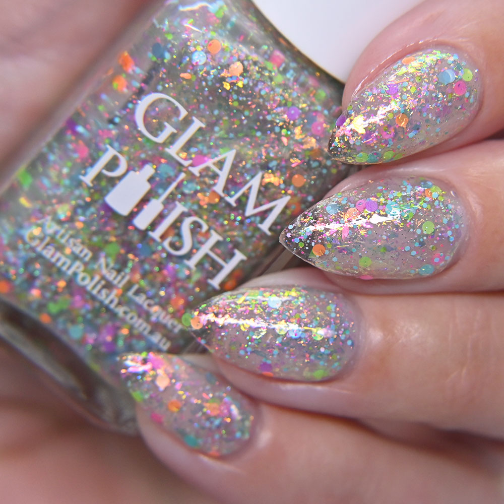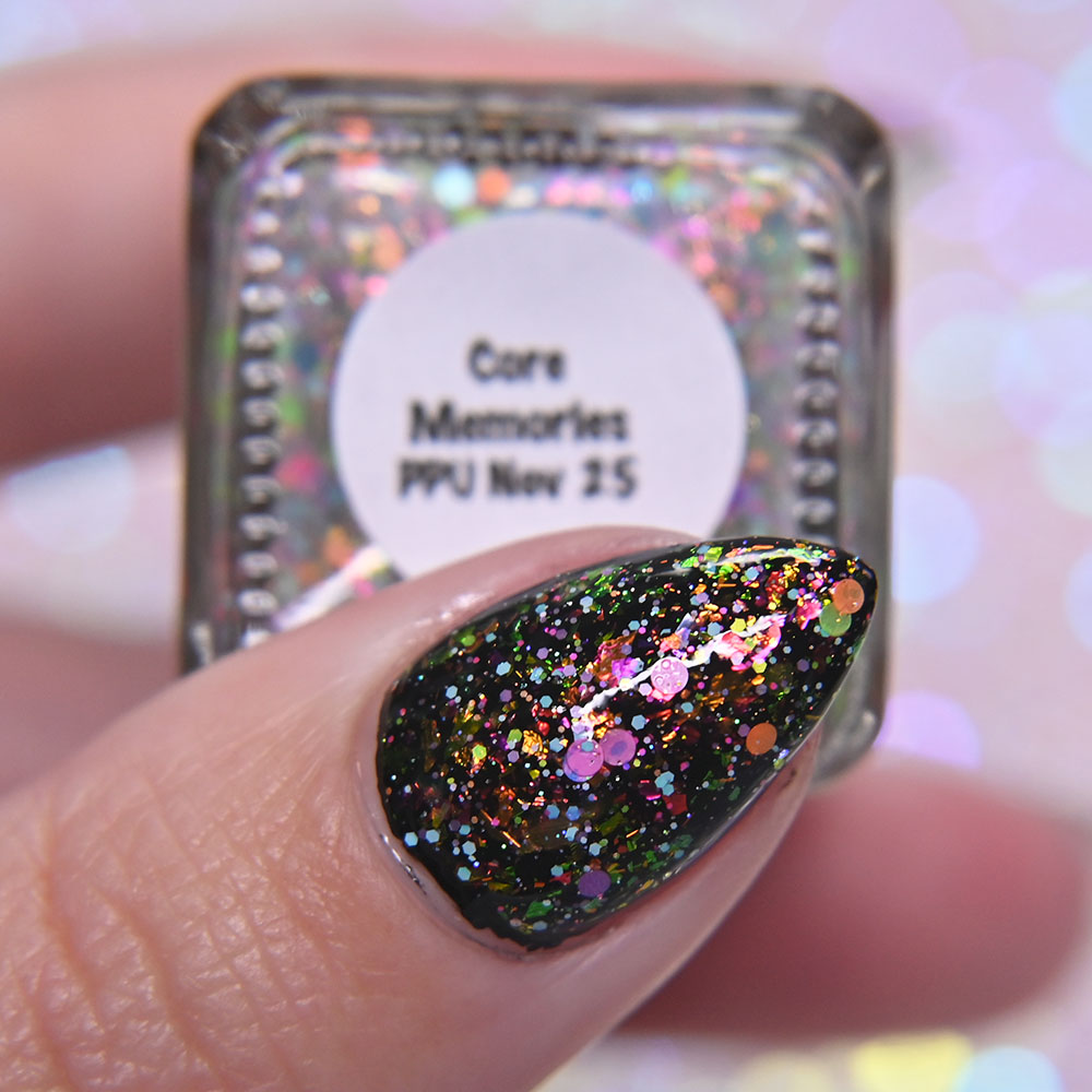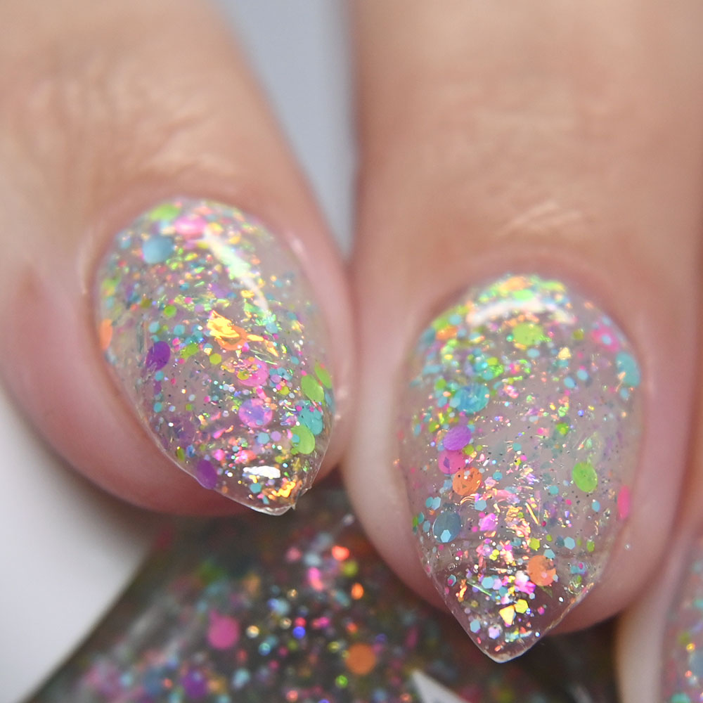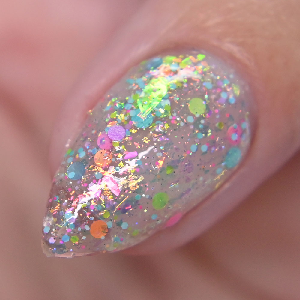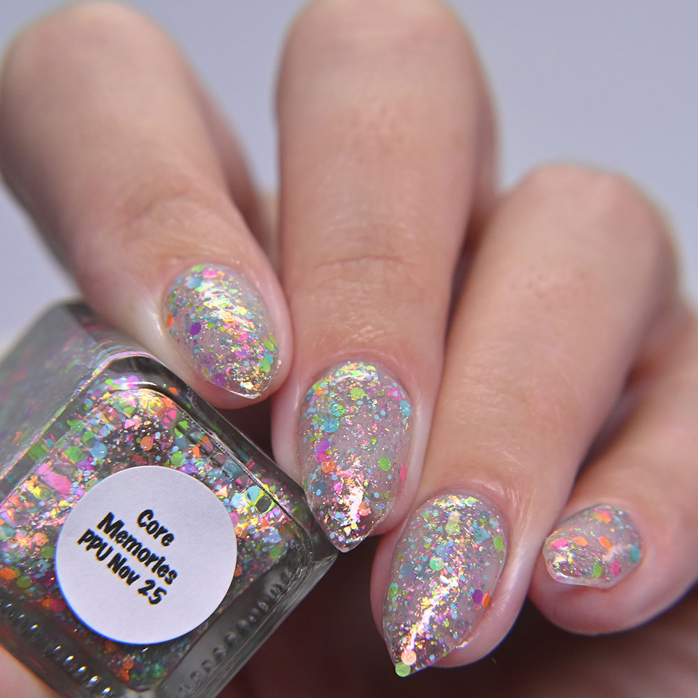 Description: Core Memories is a neon and pastel glitter mix, with a mix of shifting iridcescent flakes and holo microglitter in a clear base.