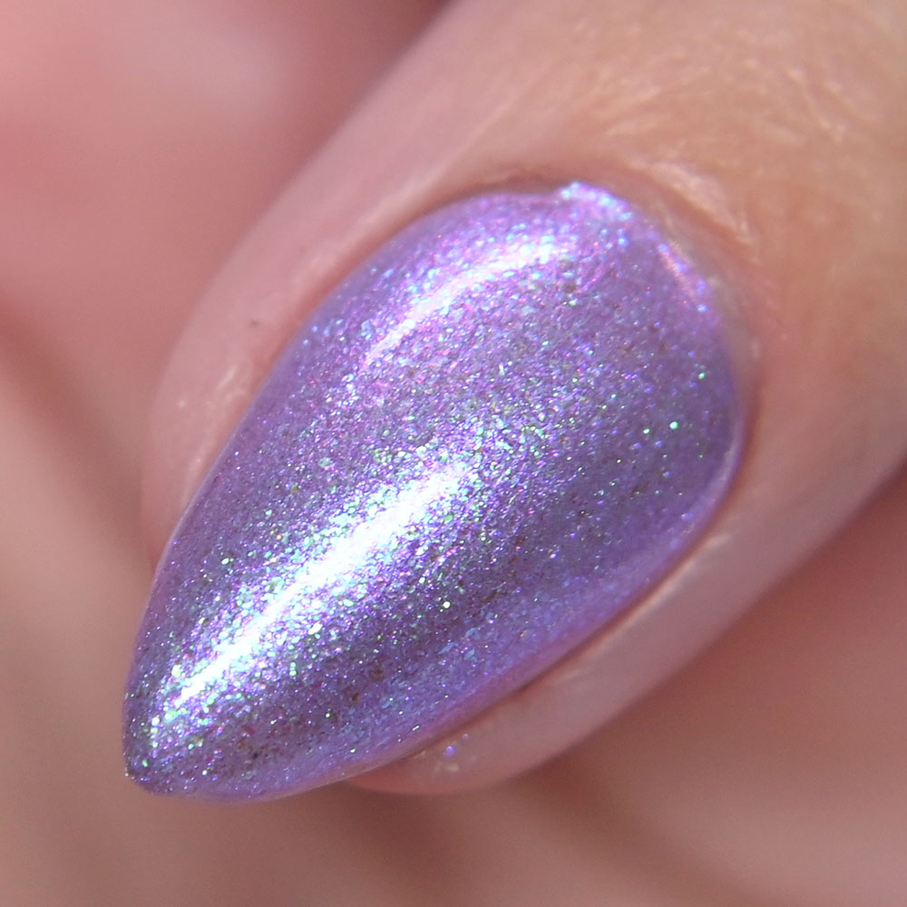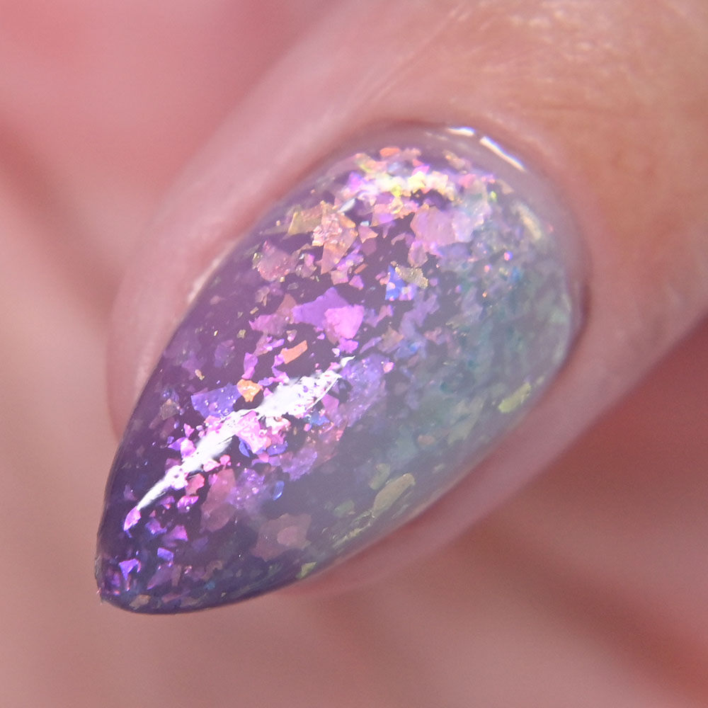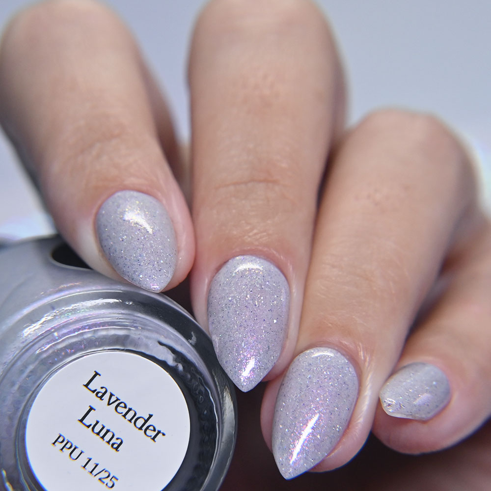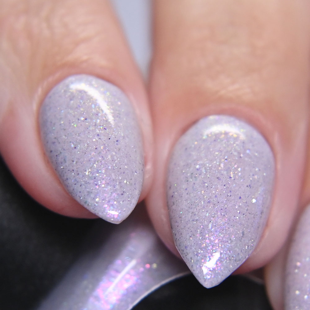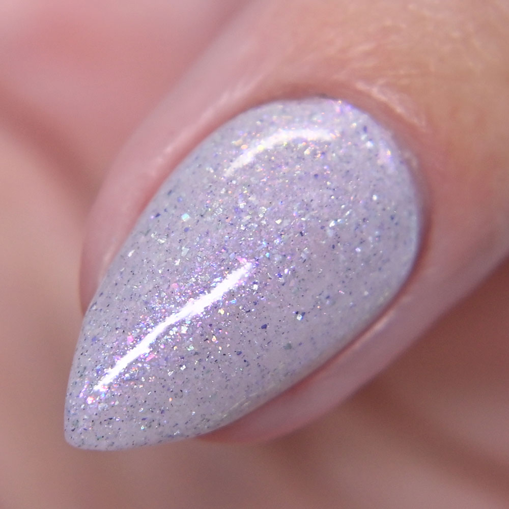 Description: Lavender Luna is an airy opal lavender, with a light grey tone, with purple to pink shifting aurora shimmers, and sprinkled with holographic micro flakes.