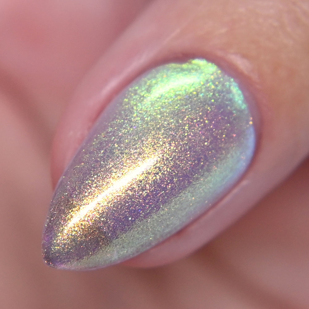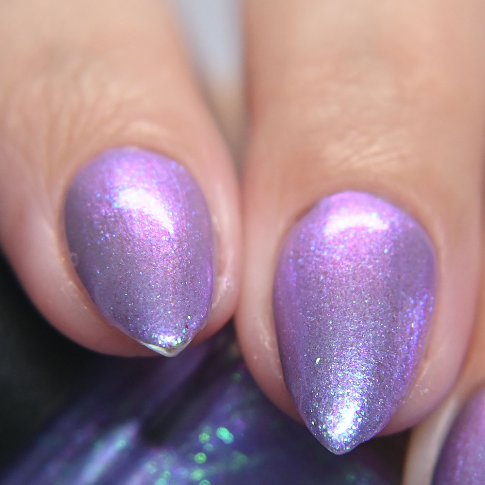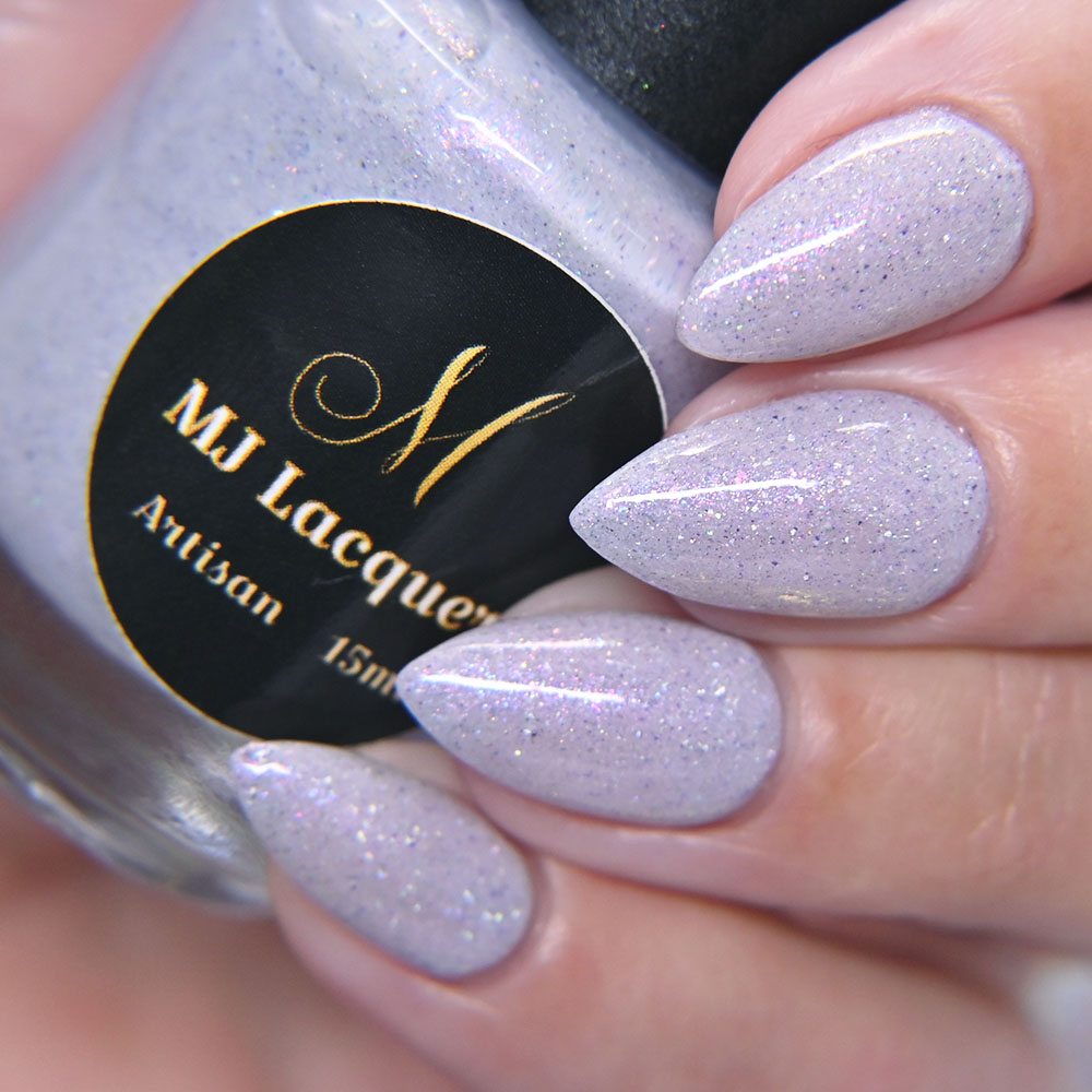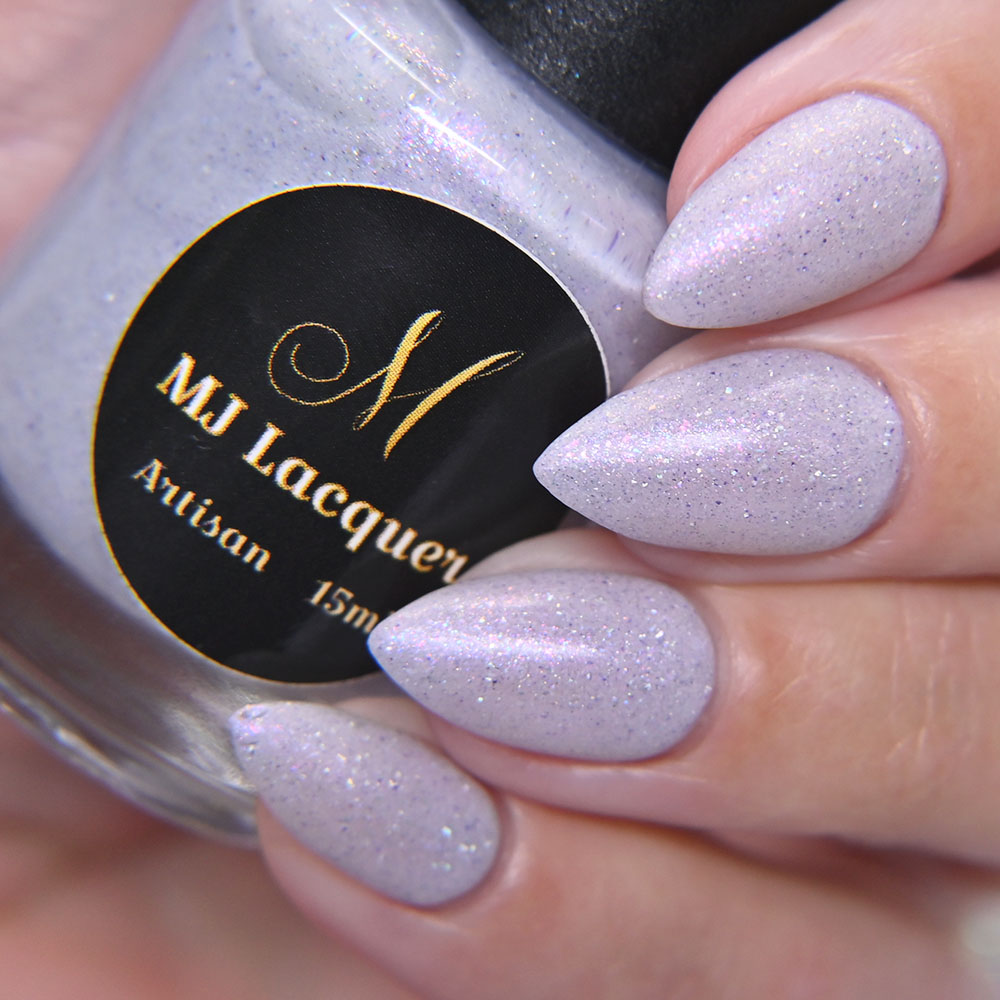 Description: Lavender Luna is an airy opal lavender, with a light grey tone, with purple to pink shifting aurora shimmers, and sprinkled with holographic micro flakes.