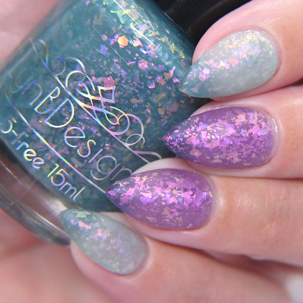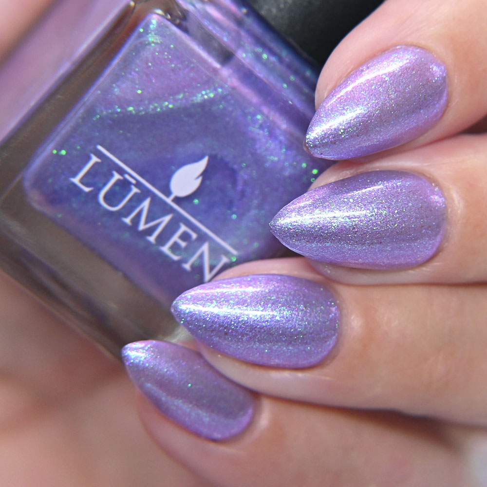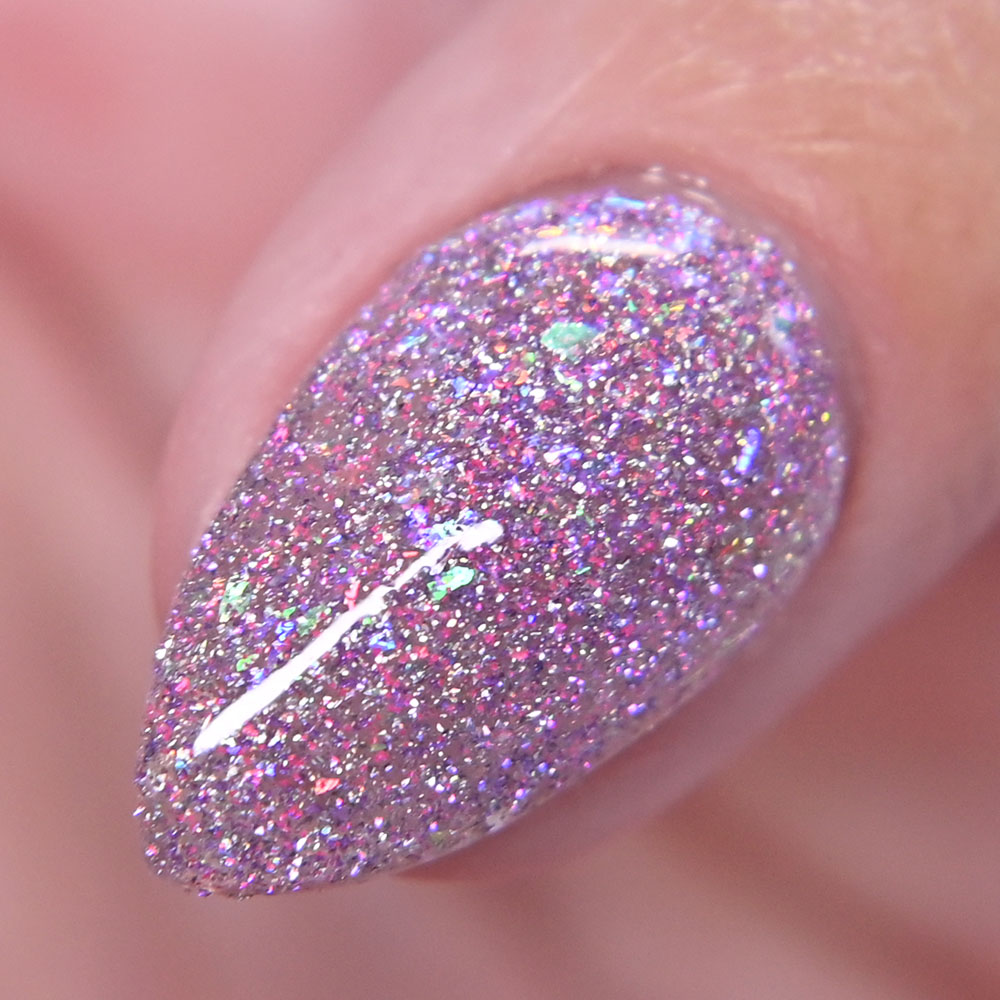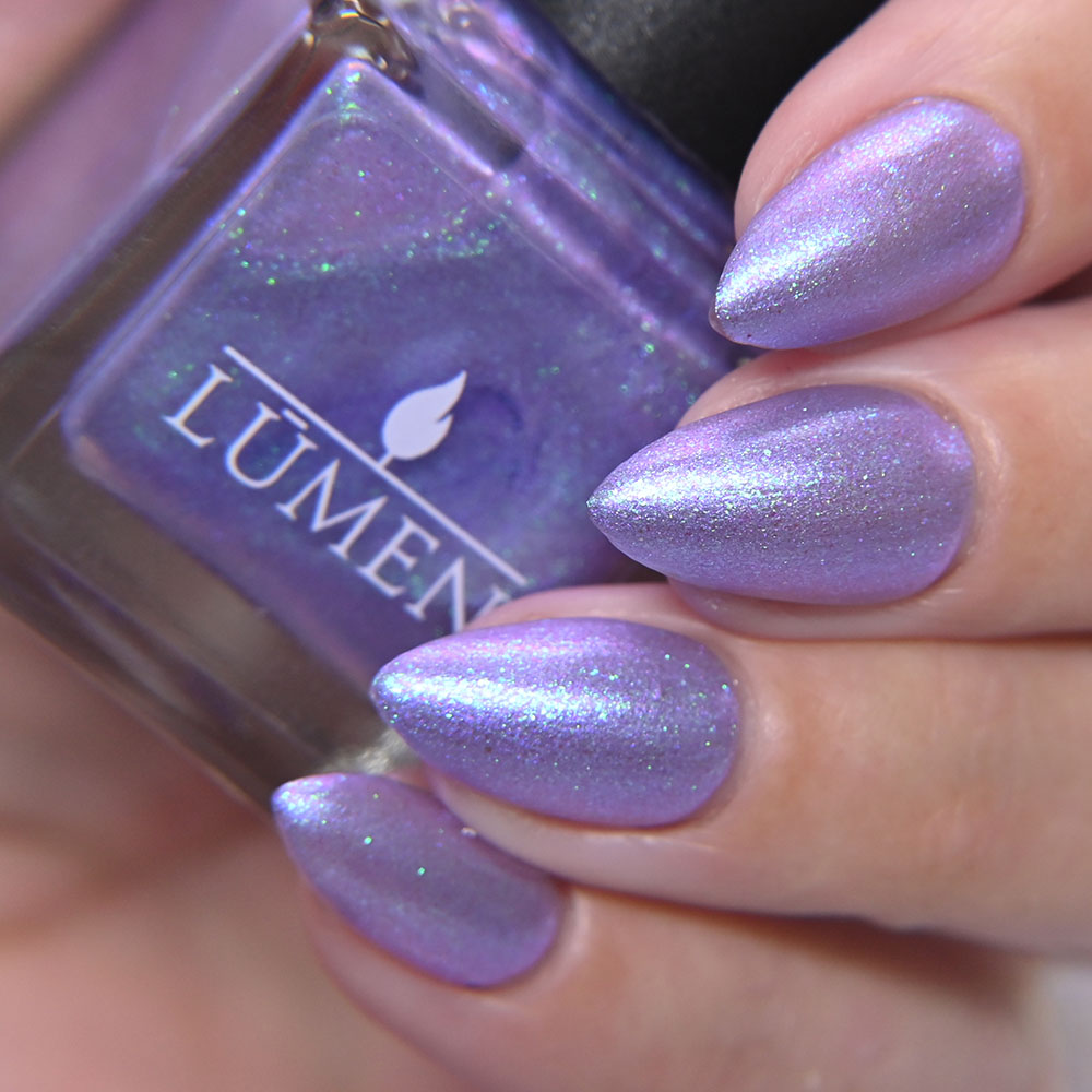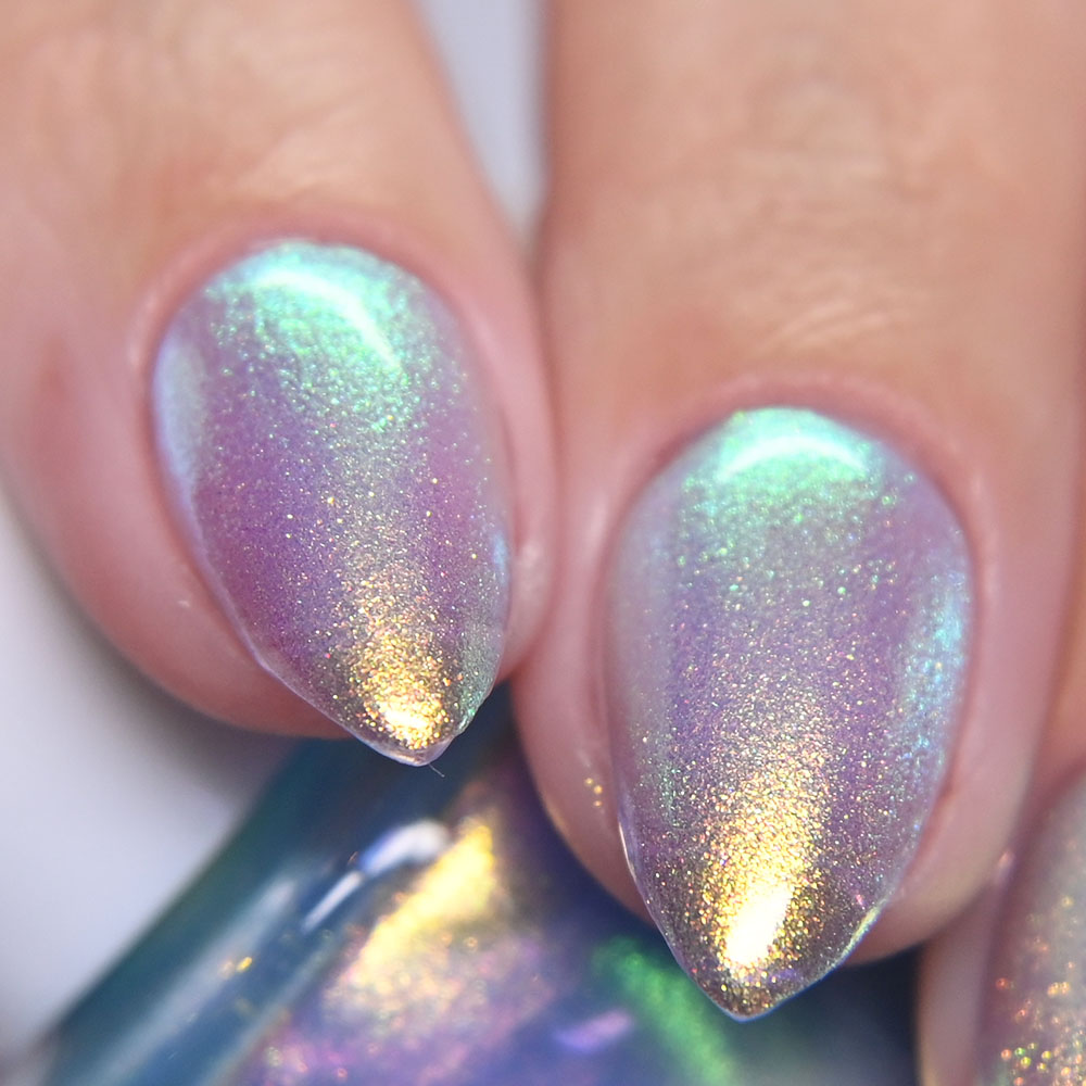 Description: Lavender Luna is an airy opal lavender, with a light grey tone, with purple to pink shifting aurora shimmers, and sprinkled with holographic micro flakes.