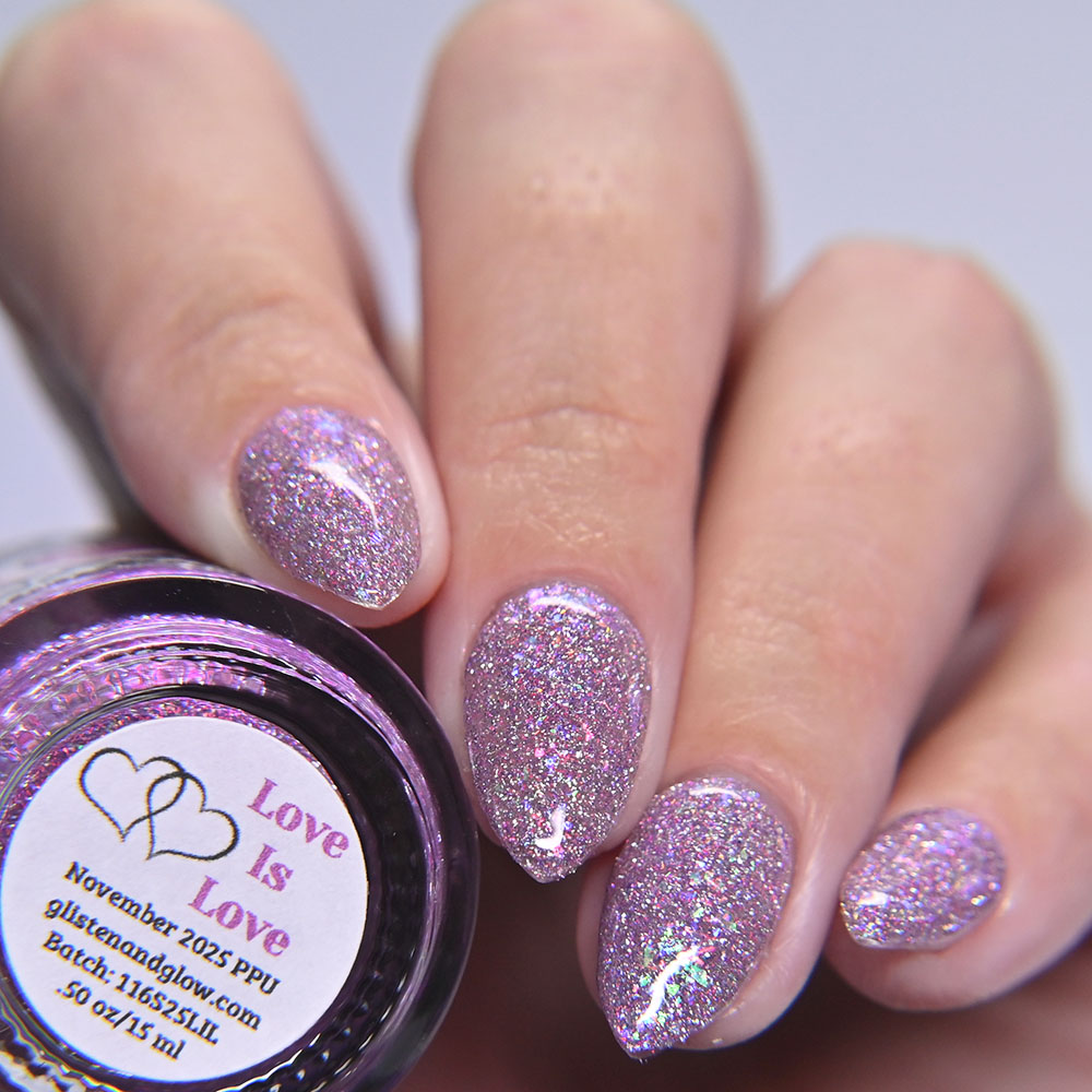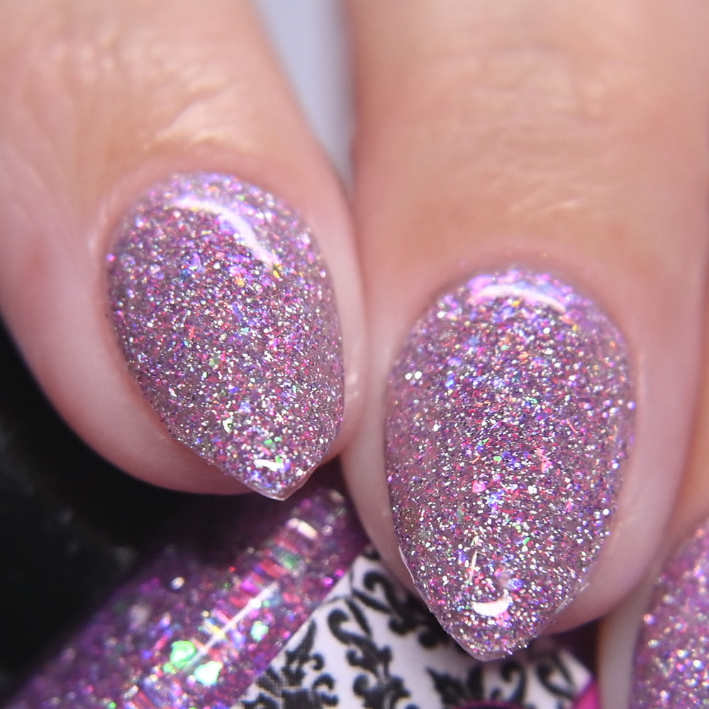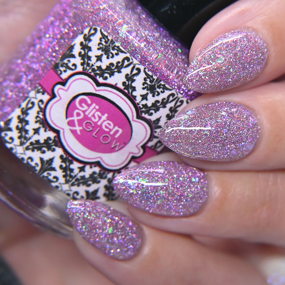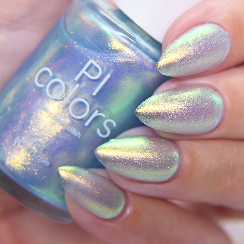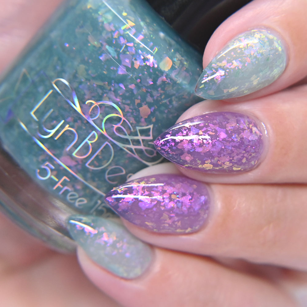 Description: Lavender Luna is an airy opal lavender, with a light grey tone, with purple to pink shifting aurora shimmers, and sprinkled with holographic micro flakes.