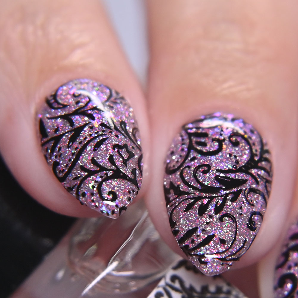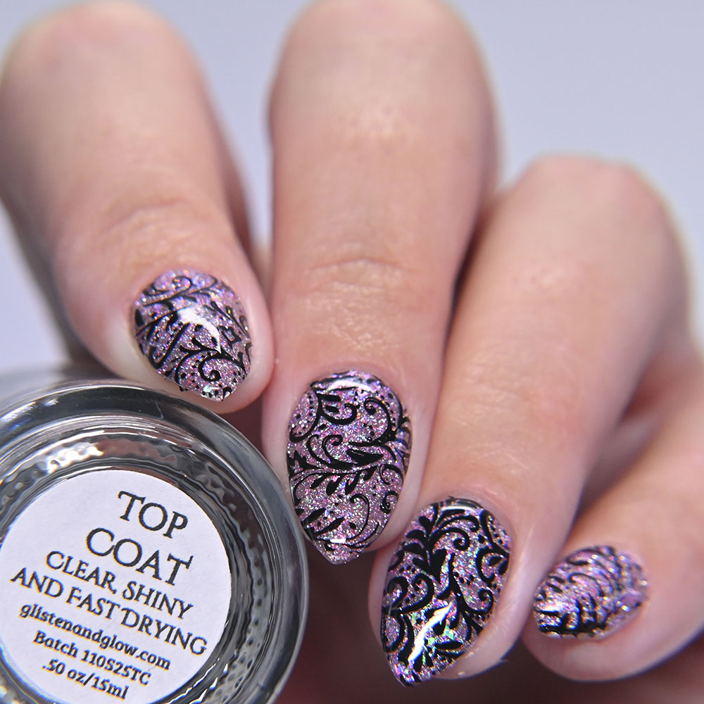 For the fine details – for all photos shown – I used a clear latex peel off base, and for the glossy photos I did Monarch Lacquer Hi-Def Shine Top coat (sent as PR and I’ve also purchased.. and that’s an affiliate link).  For all textured polishes, I did use Glisten & Glow Glitter Grabber (PR) and Monarch Lacquer top coat over it.