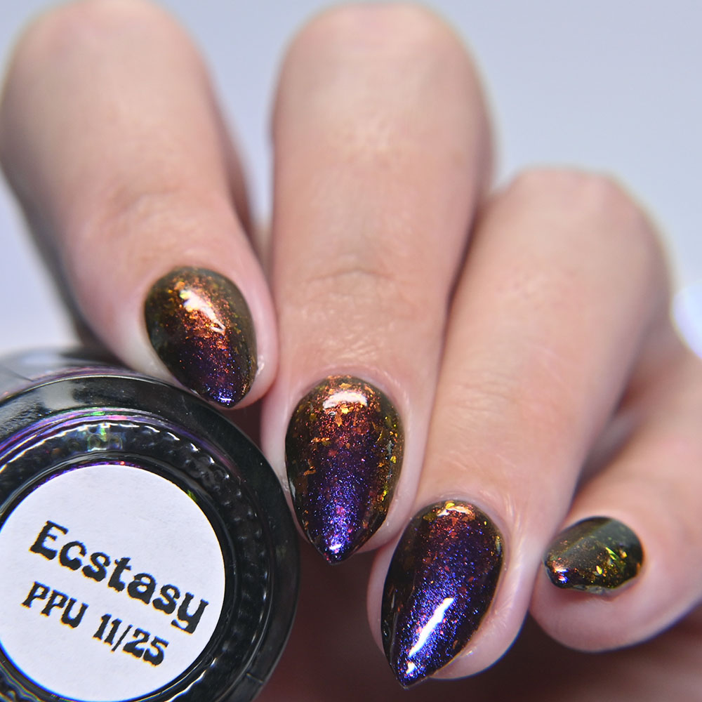 Description: Ecstasy is a black jelly with multichrome shifting purple to red to copper to gold and red to copper to gold flakes.