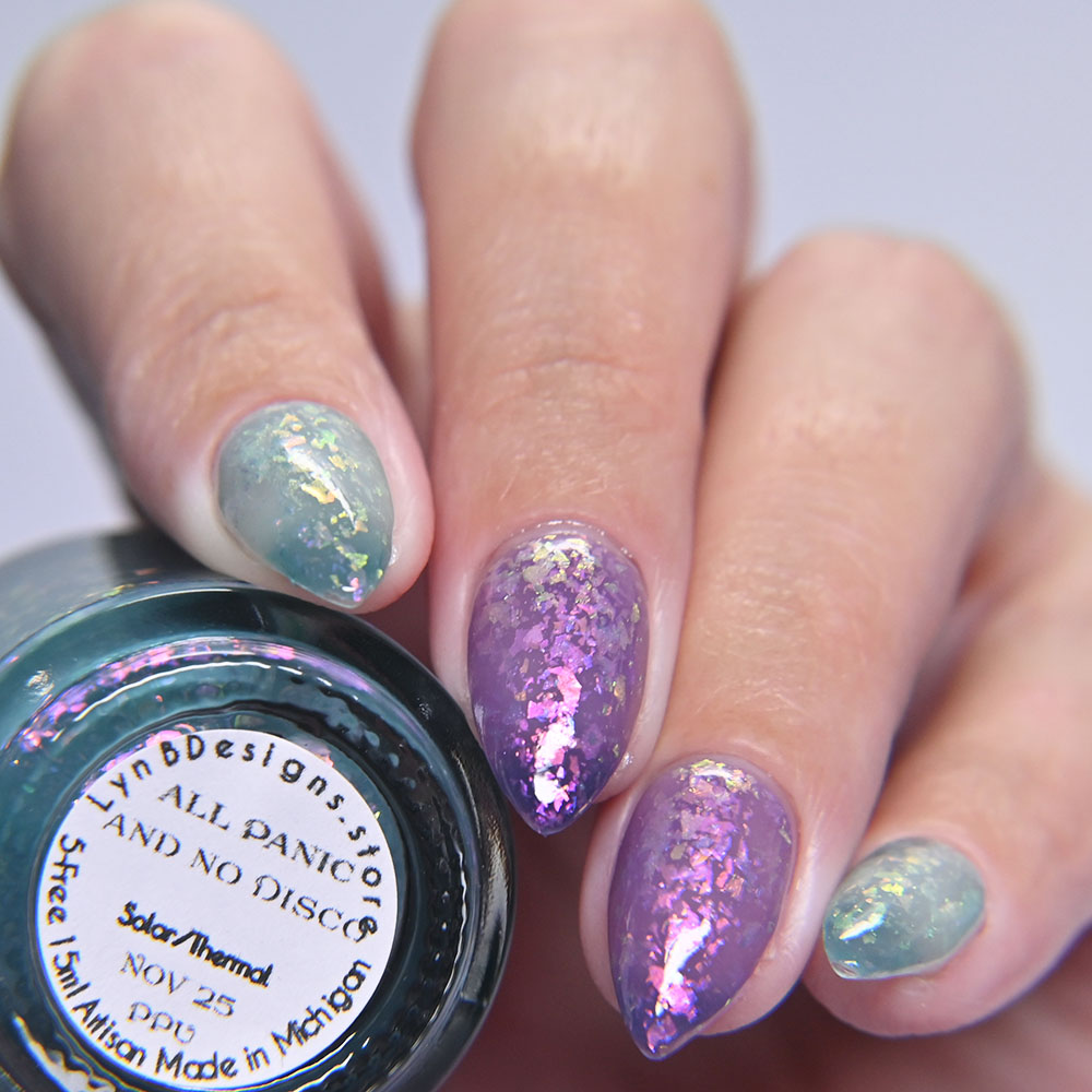 Description: All Panic and No Disco is a teal to clear thermal indoors plum to pink solar outdoors with a rainbow of shifting flakies.