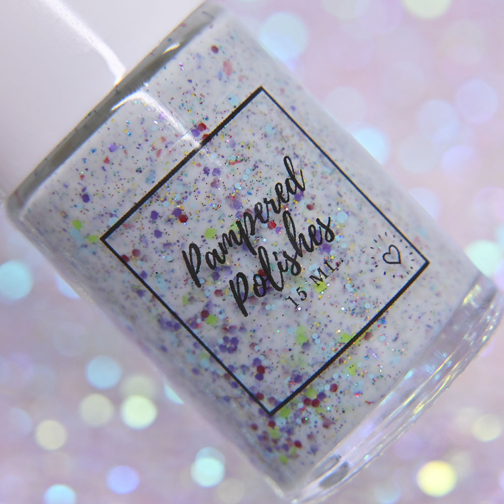 Description: For Riley is a white crelly base with a rainbow of flakes and glitter.