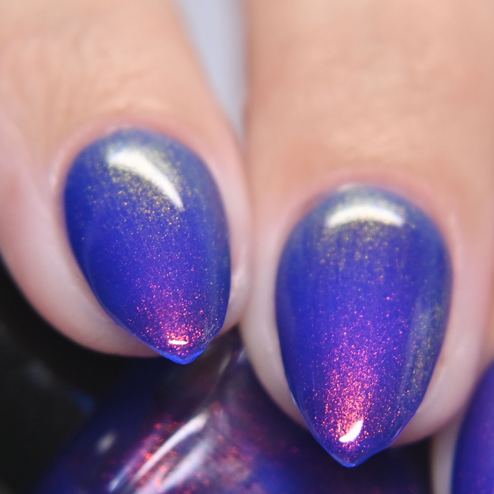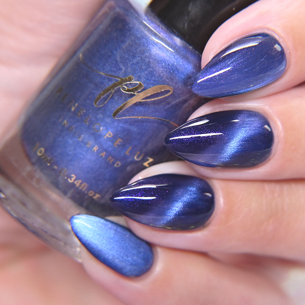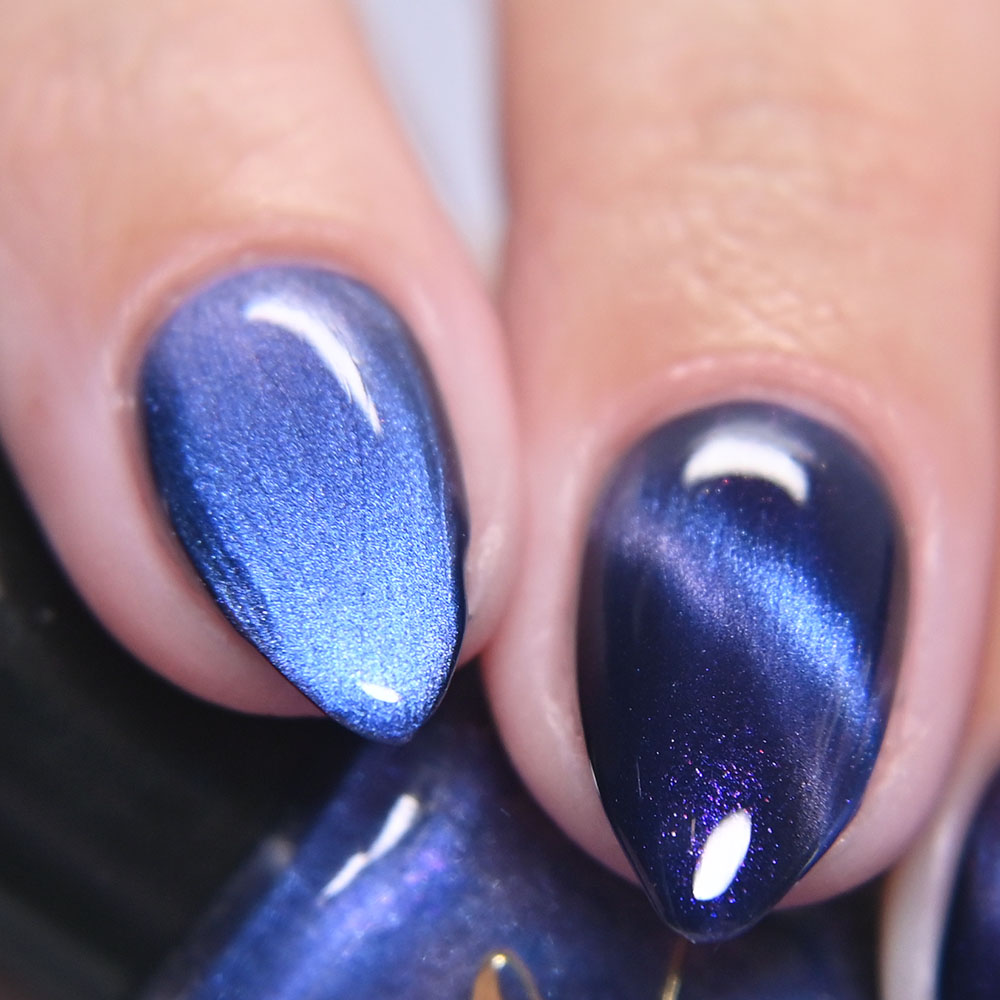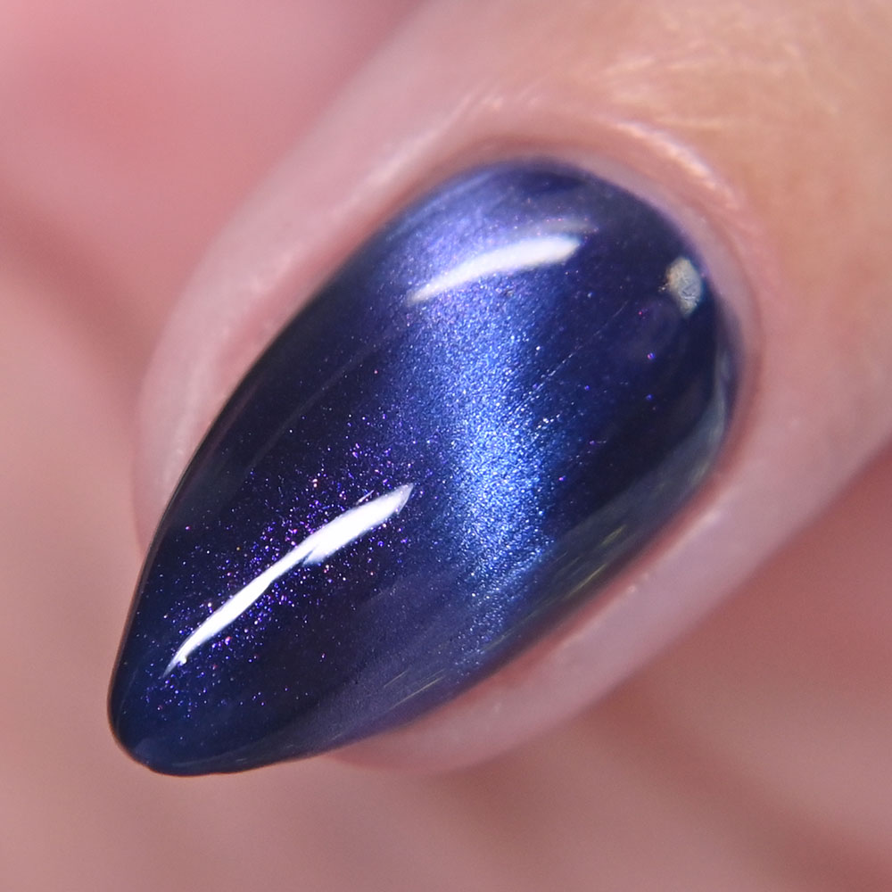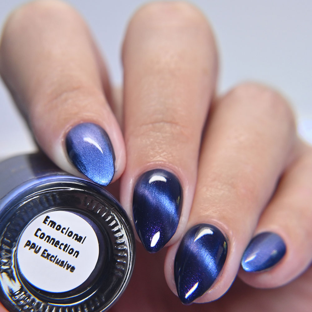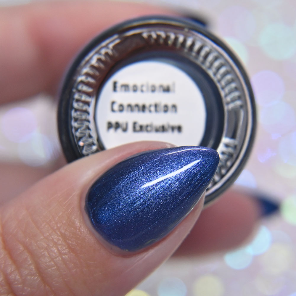 Description: Emocional Connection is a deep blue jelly base with a subtle fine purple shimmer, as well as icy blue magnetic pigment.