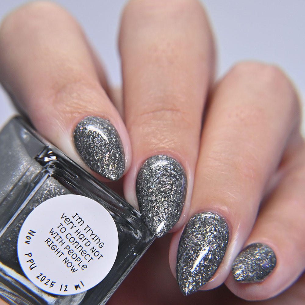Description: I’m Trying Really Hard Not To Connect To People Right Now is a dark charcoal holo flakie bomb.