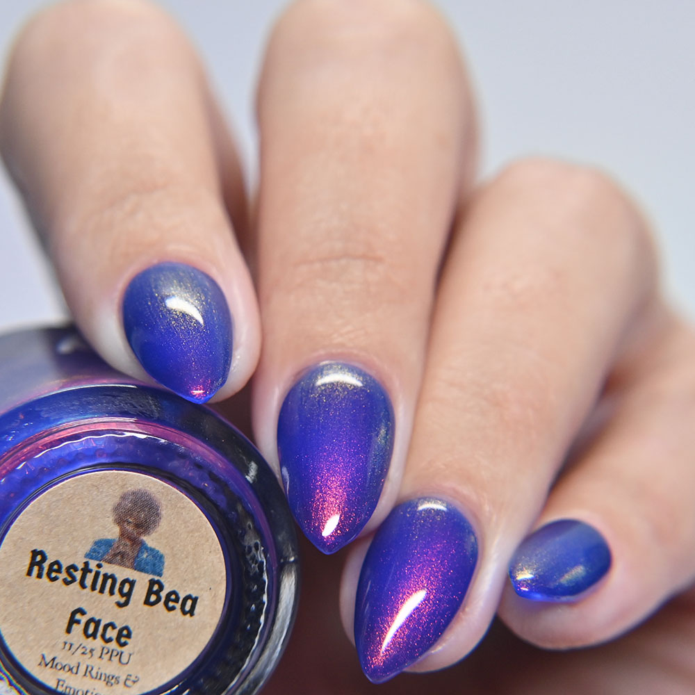 Description:  Resting Bea Face is a vivid cobalt blue with purple undertones and red to orange to copper shifting shimmer.