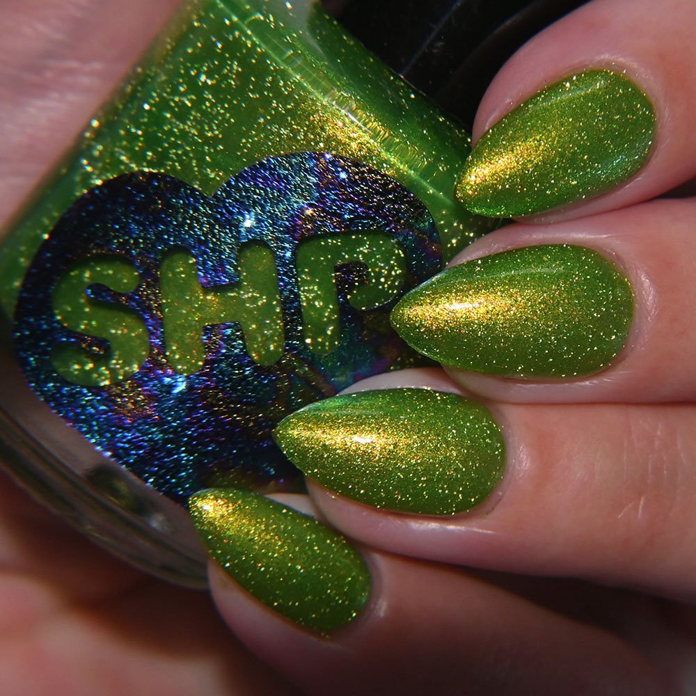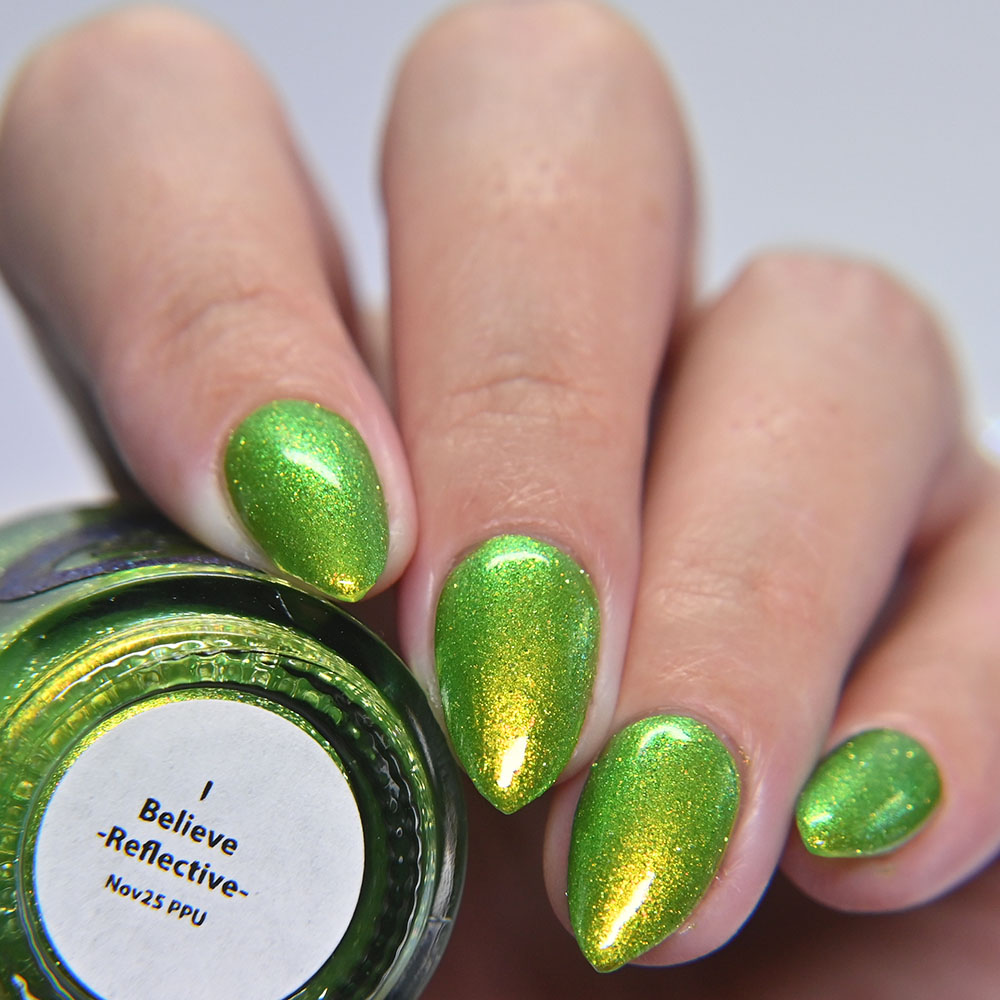 Description: I Believe is a neon green base with green to yellow to gold shimmer and yellow reflective glitter.