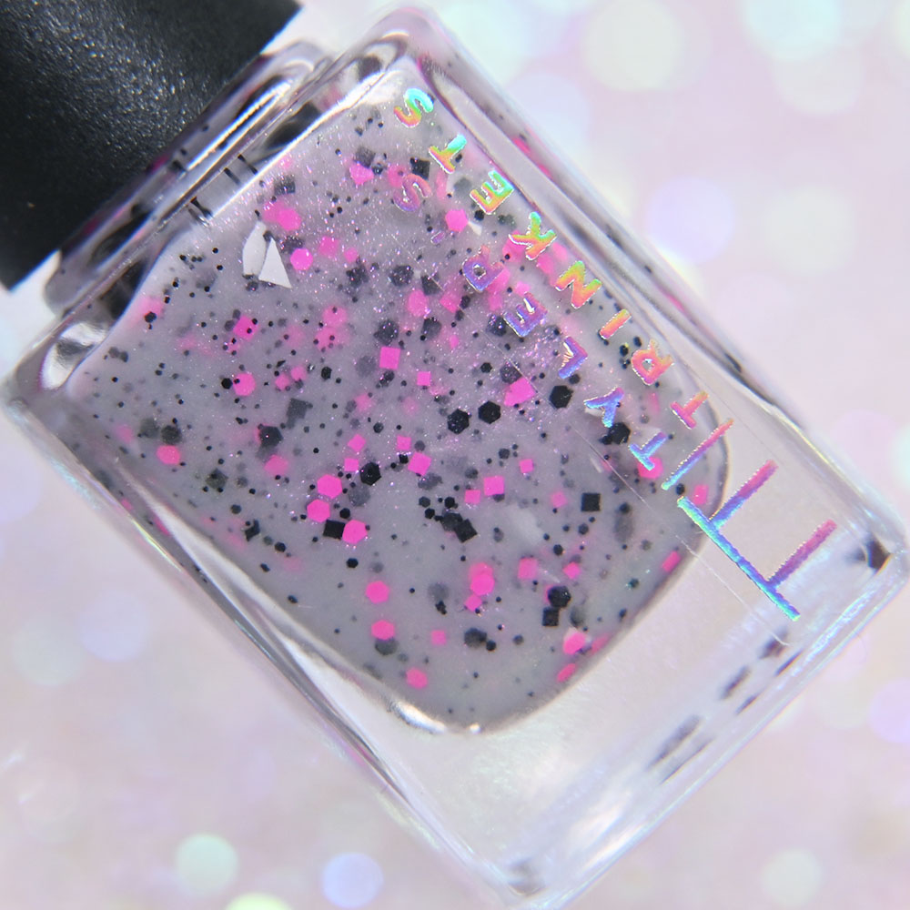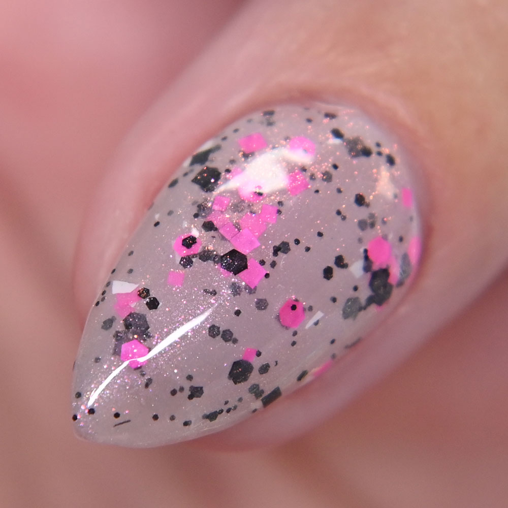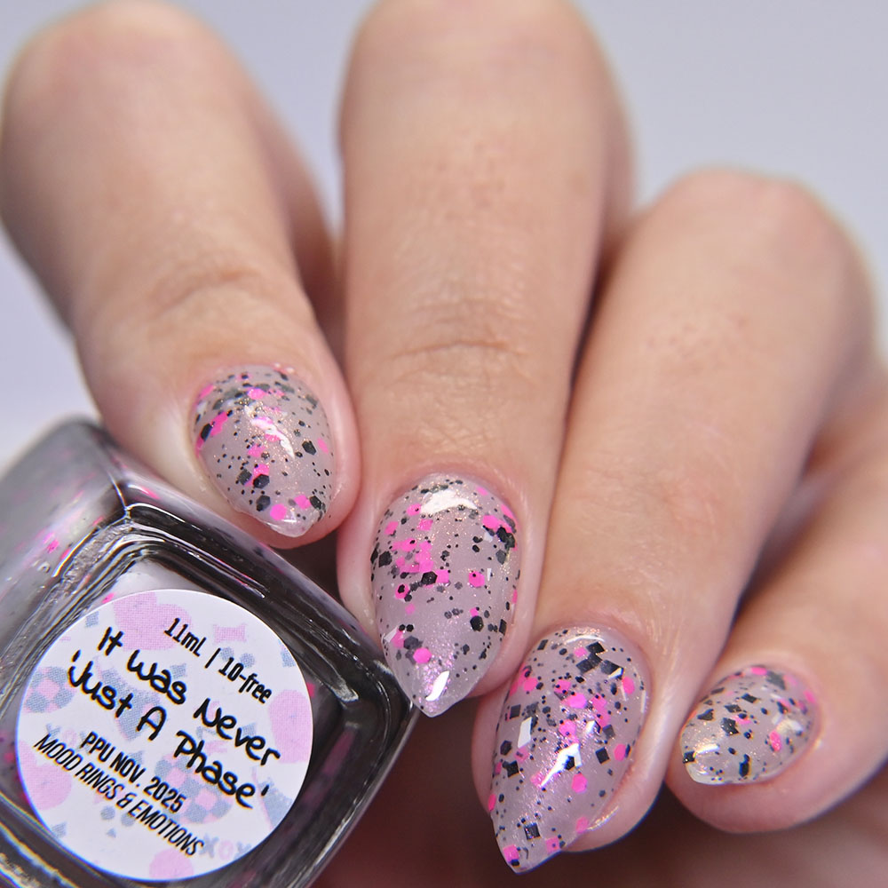 Description:  It Was Never ‘Just A Phase’ is a sheer gray pearl base with pink/orange/gold aurora shimmer and mixed glitters in neon pink, black, and white.
