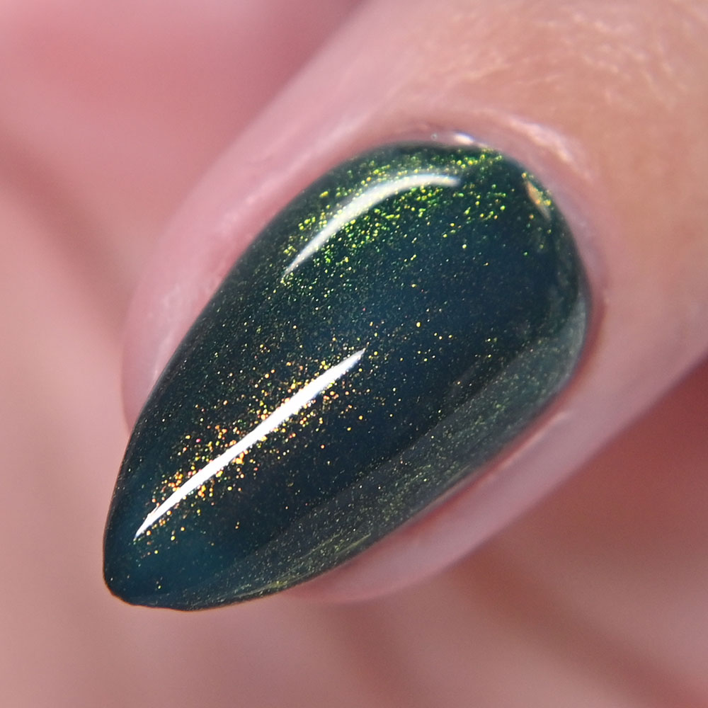 Description: Catching Tealings is a deep  turquoise base with vibrant gold-copper-red aurora shimmer.