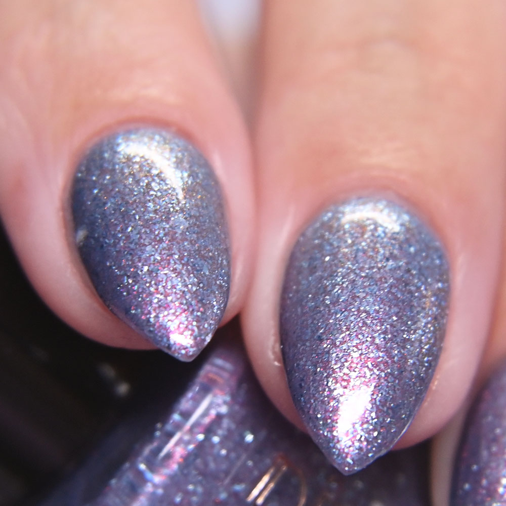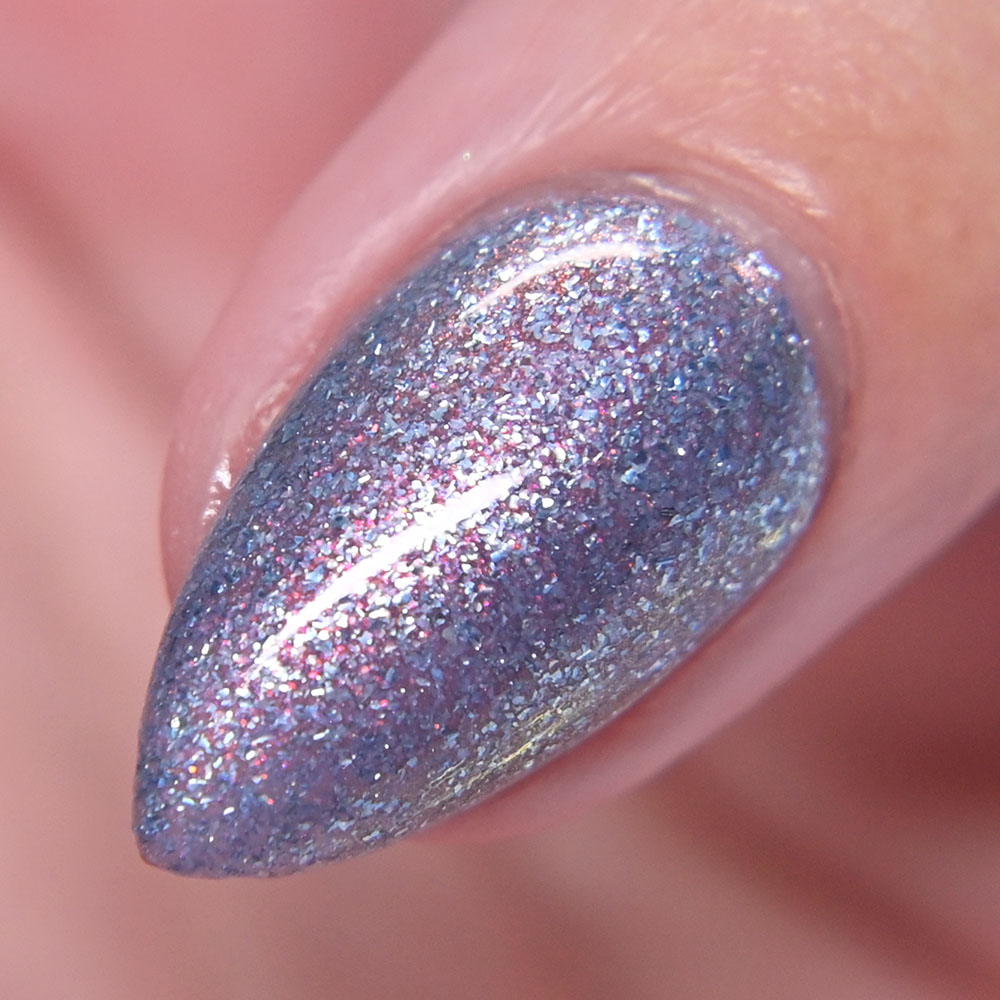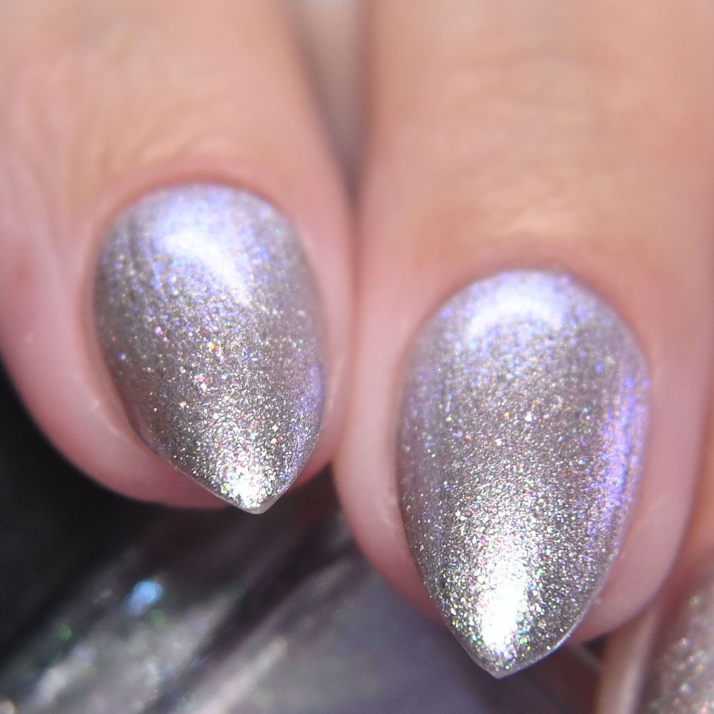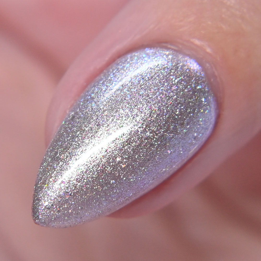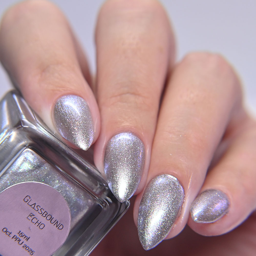 Description: Glassbound Echo is a soft silvery base with sparks of green to indigo and scattered holo.