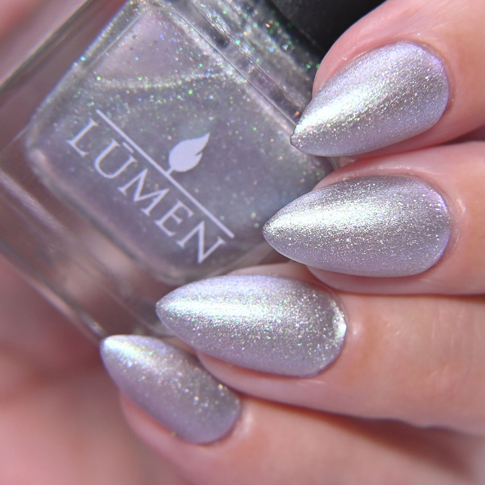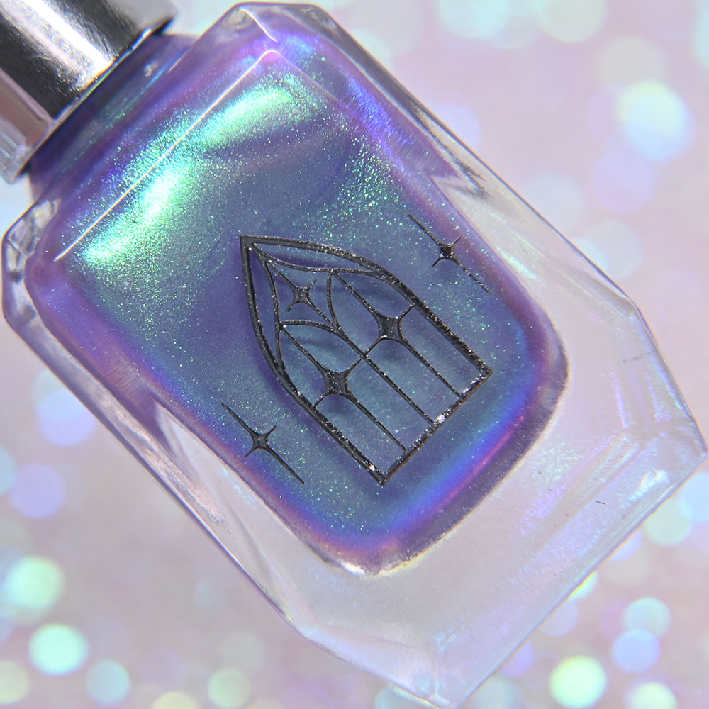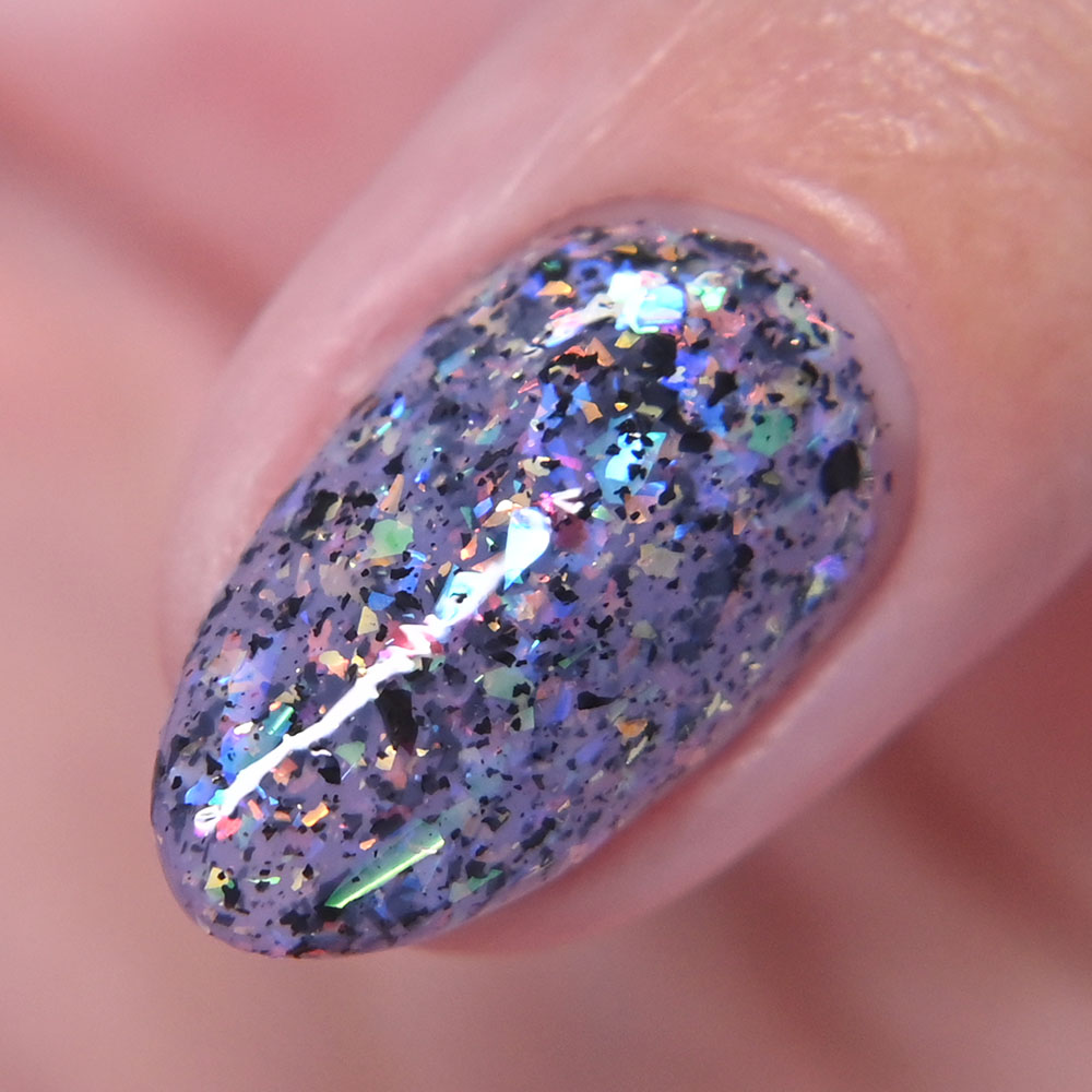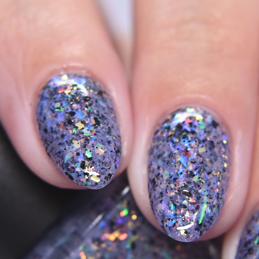 Description: Glassbound Echo is a soft silvery base with sparks of green to indigo and scattered holo.