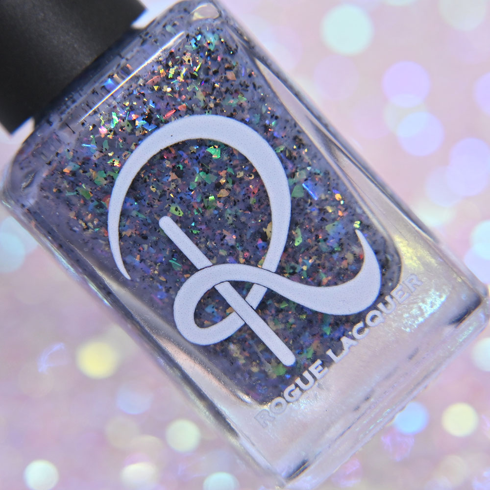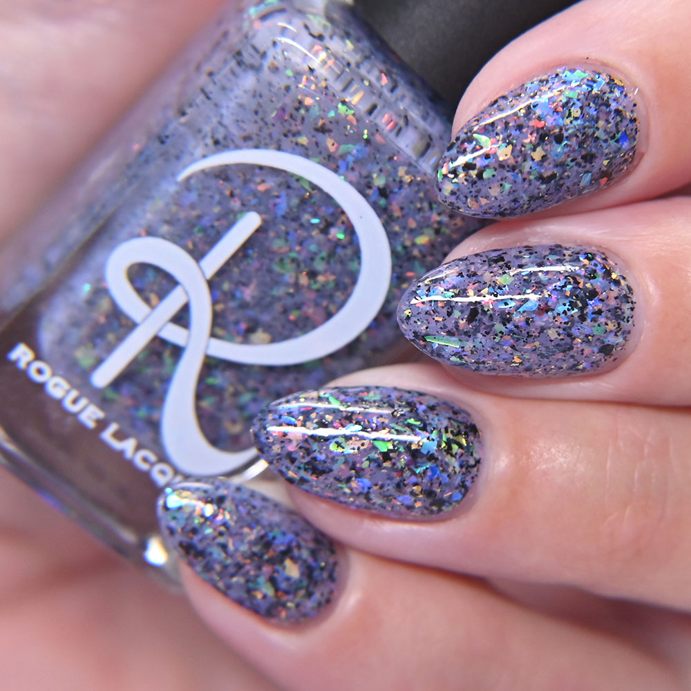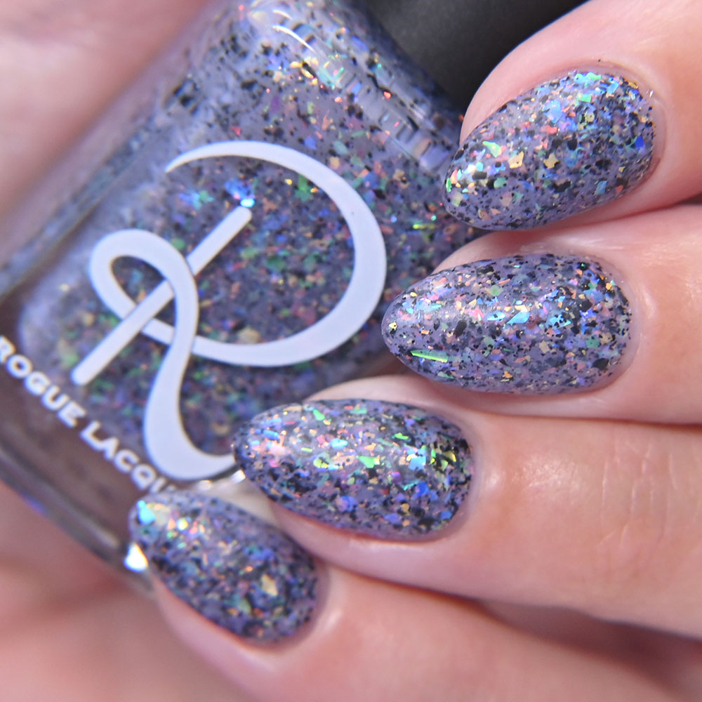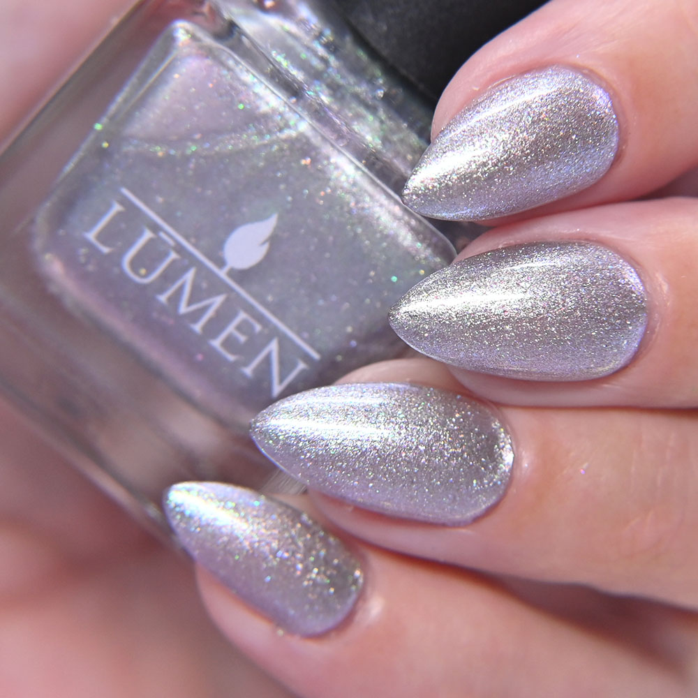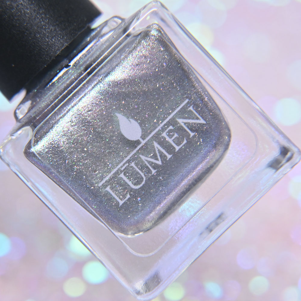 Description: Glassbound Echo is a soft silvery base with sparks of green to indigo and scattered holo.