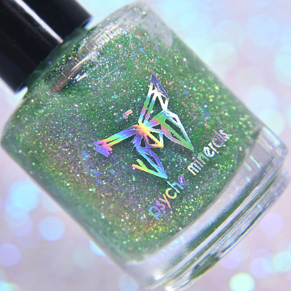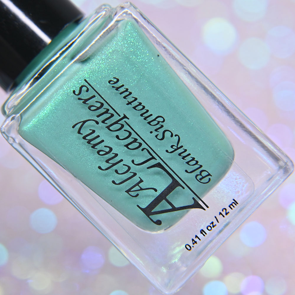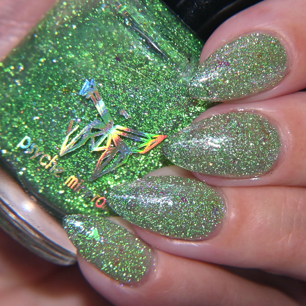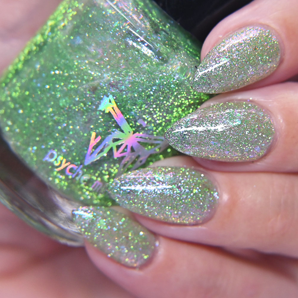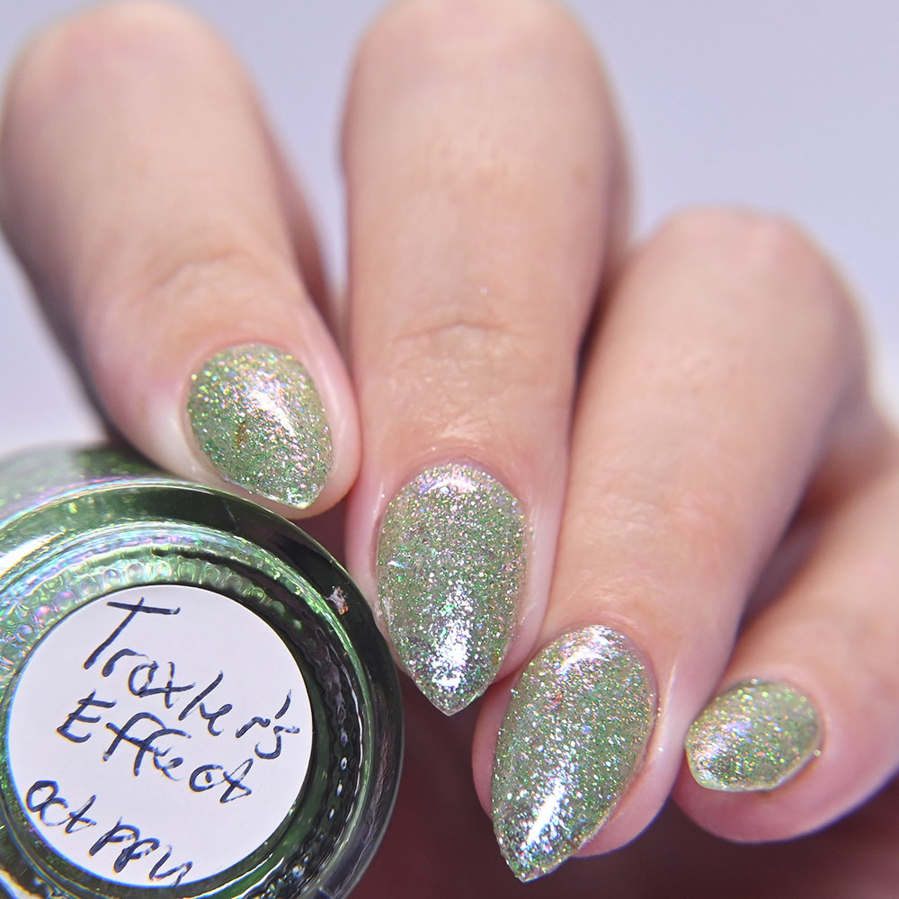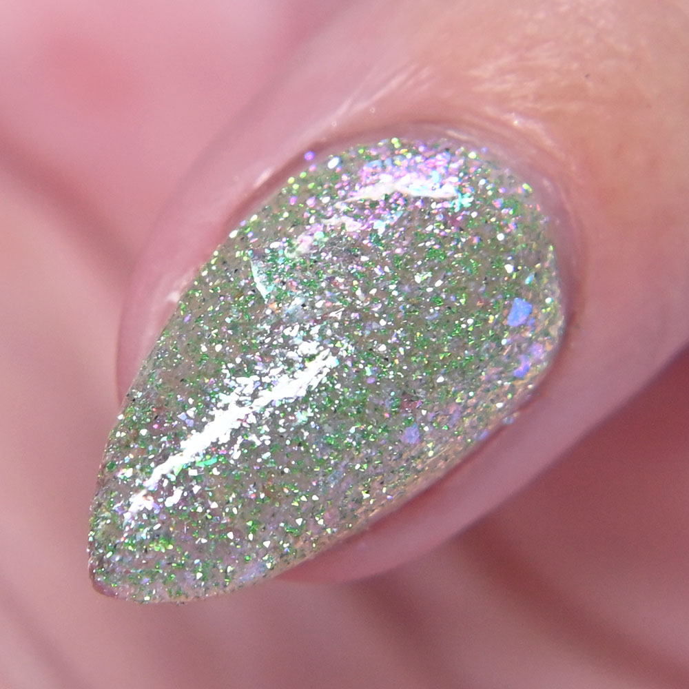 Description: Troxler’s Effect is a sheer mint green tinted base loaded with light green reflective glitters, violet to orange to green large particle aurora shimmer, and pink to blue to green iridescent flakes.