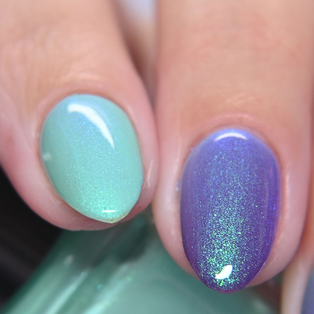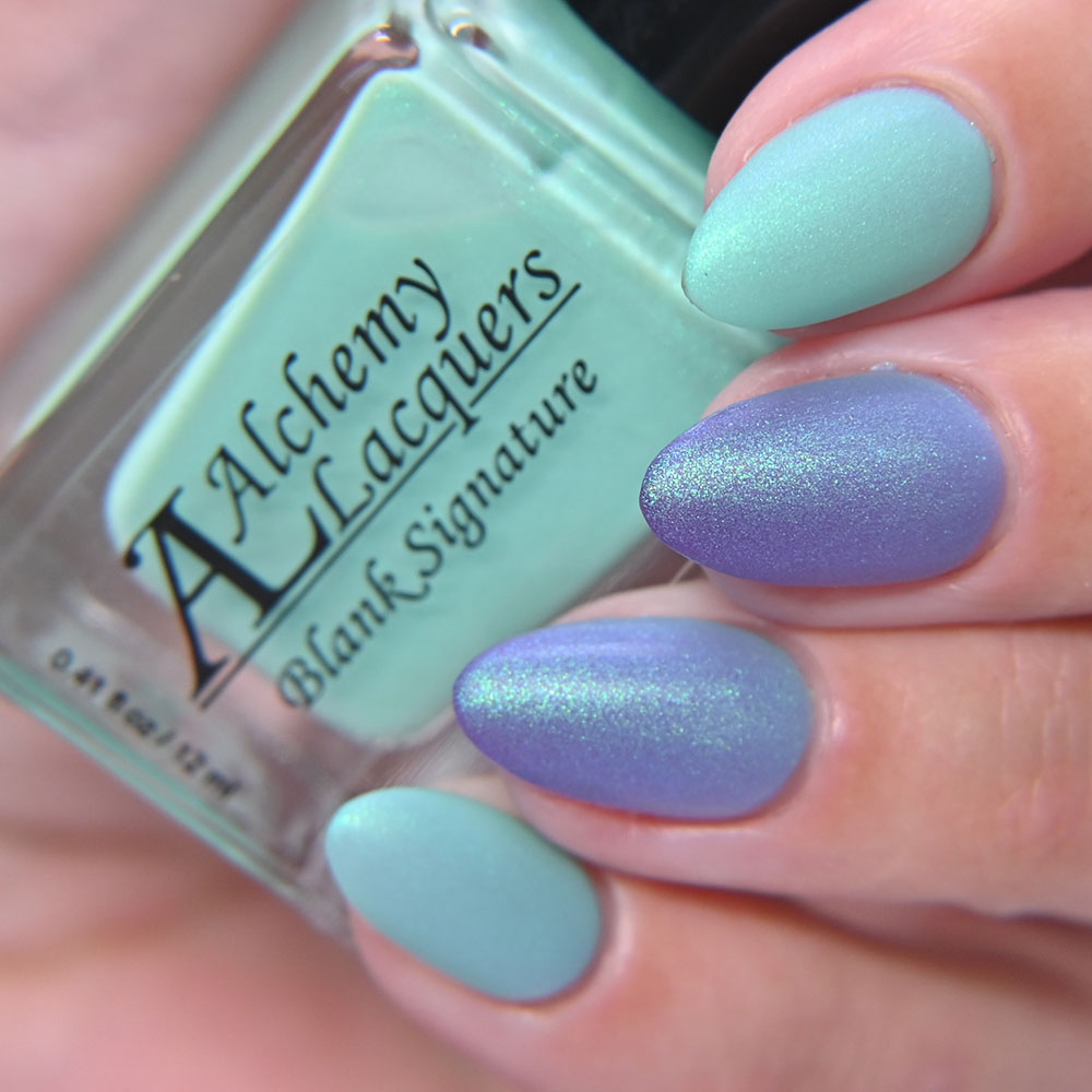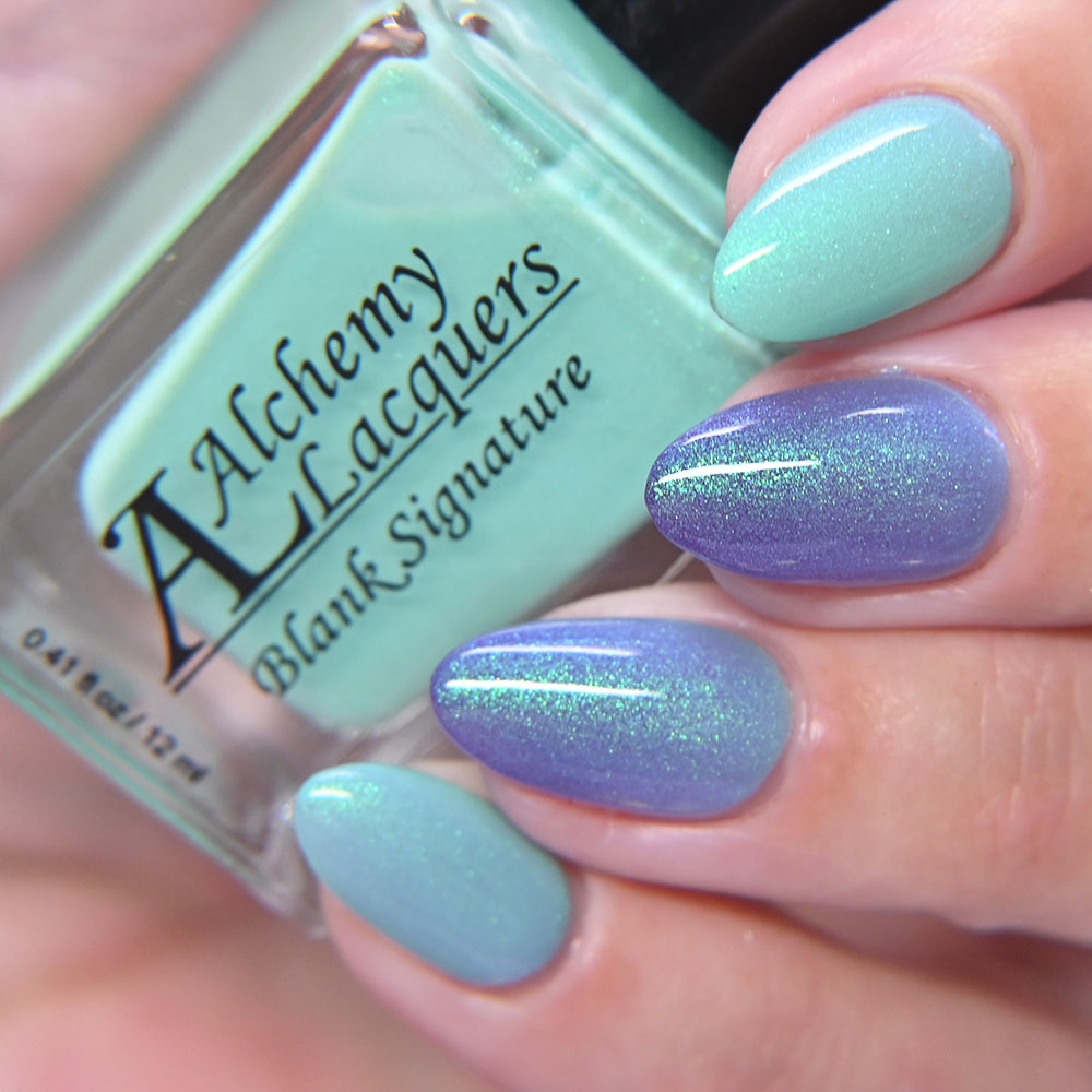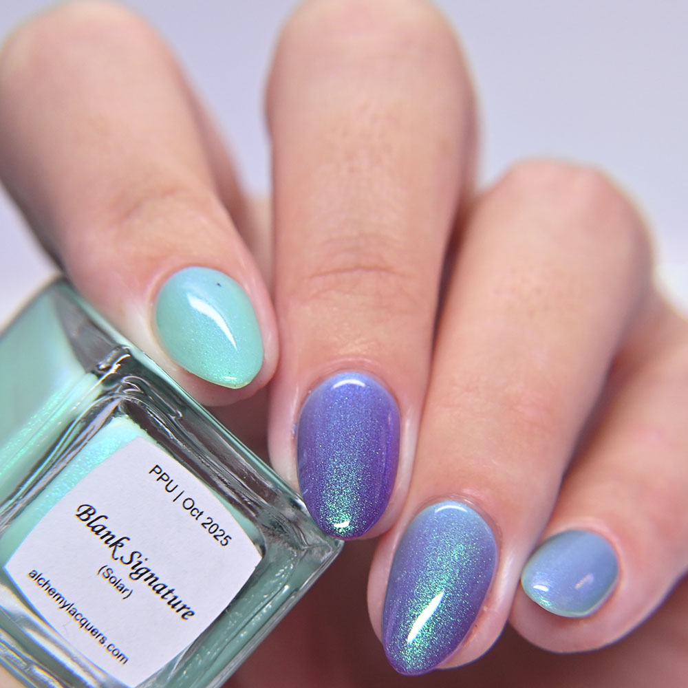 Description: Blank Signature is a solar nail lacquer that shifts from a cool minty green in the shade, to purple in the sun (or under UV light), with green to turquoise to blue shifting shimmer.
