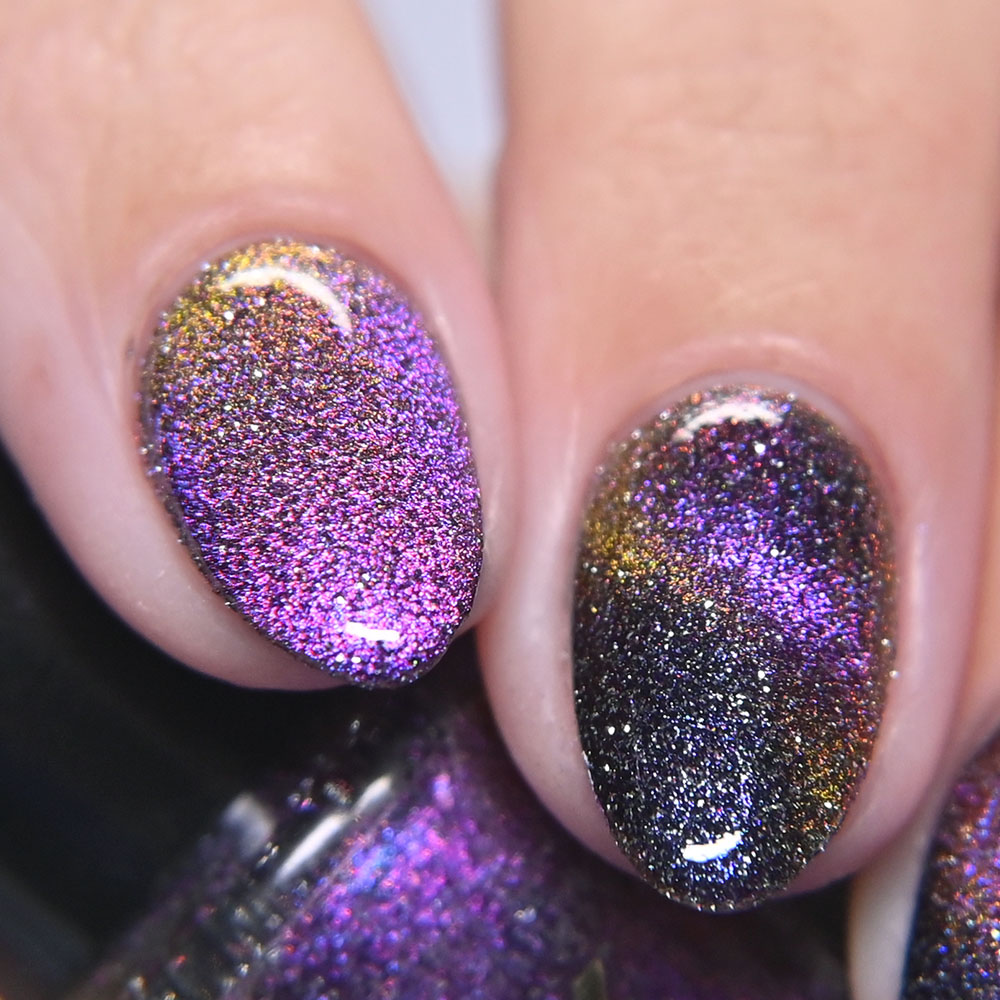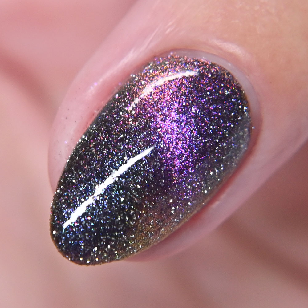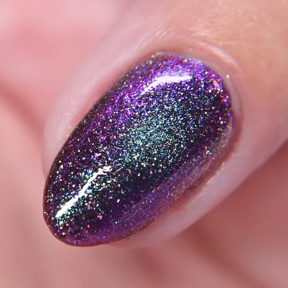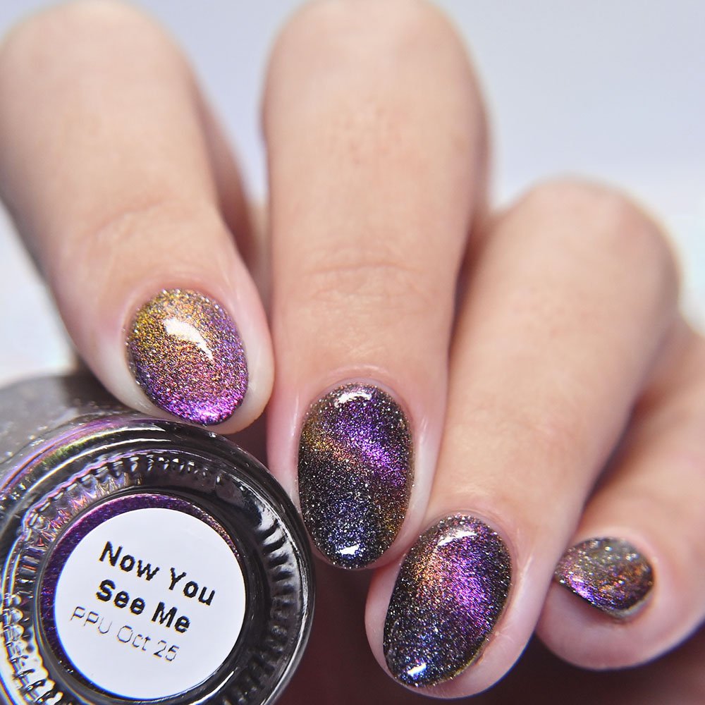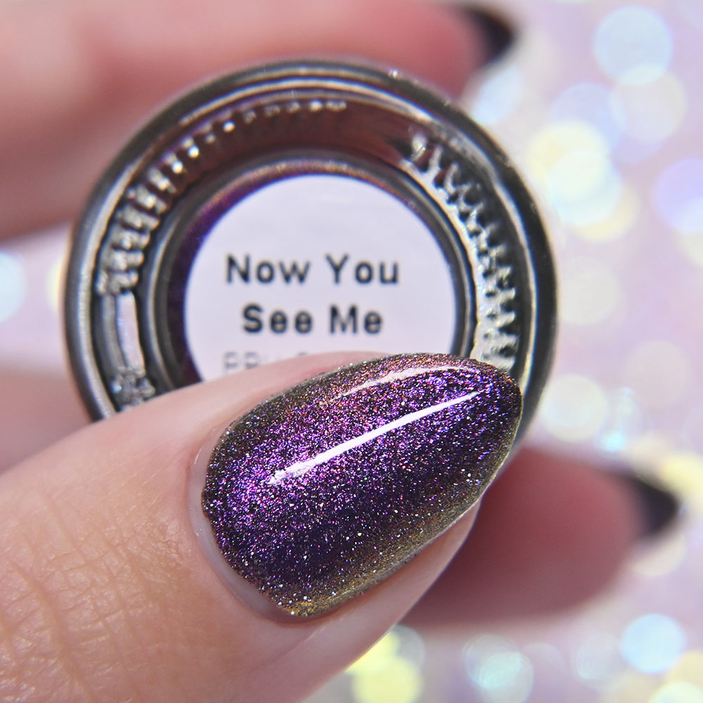Description: Now You See Me is a blackened purple base with magnetic multichrome pigment that shifts purple, pink, gold, green, and blue, with silver reflective glitter.