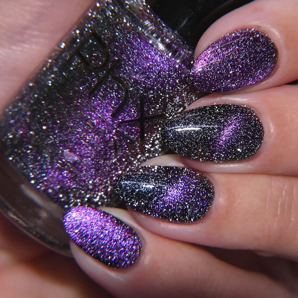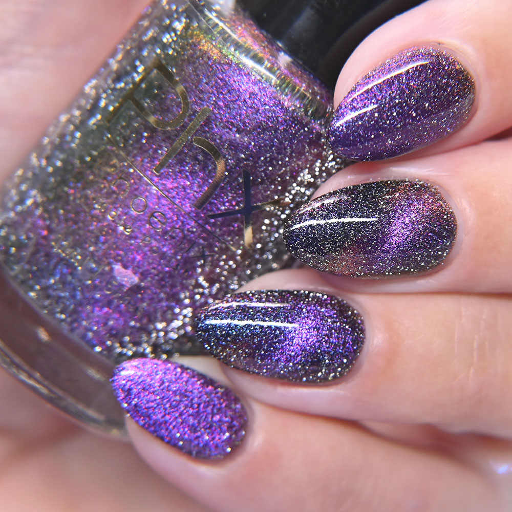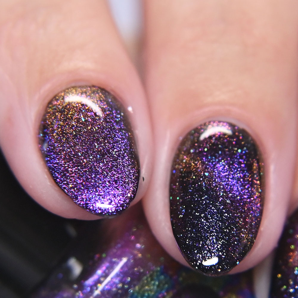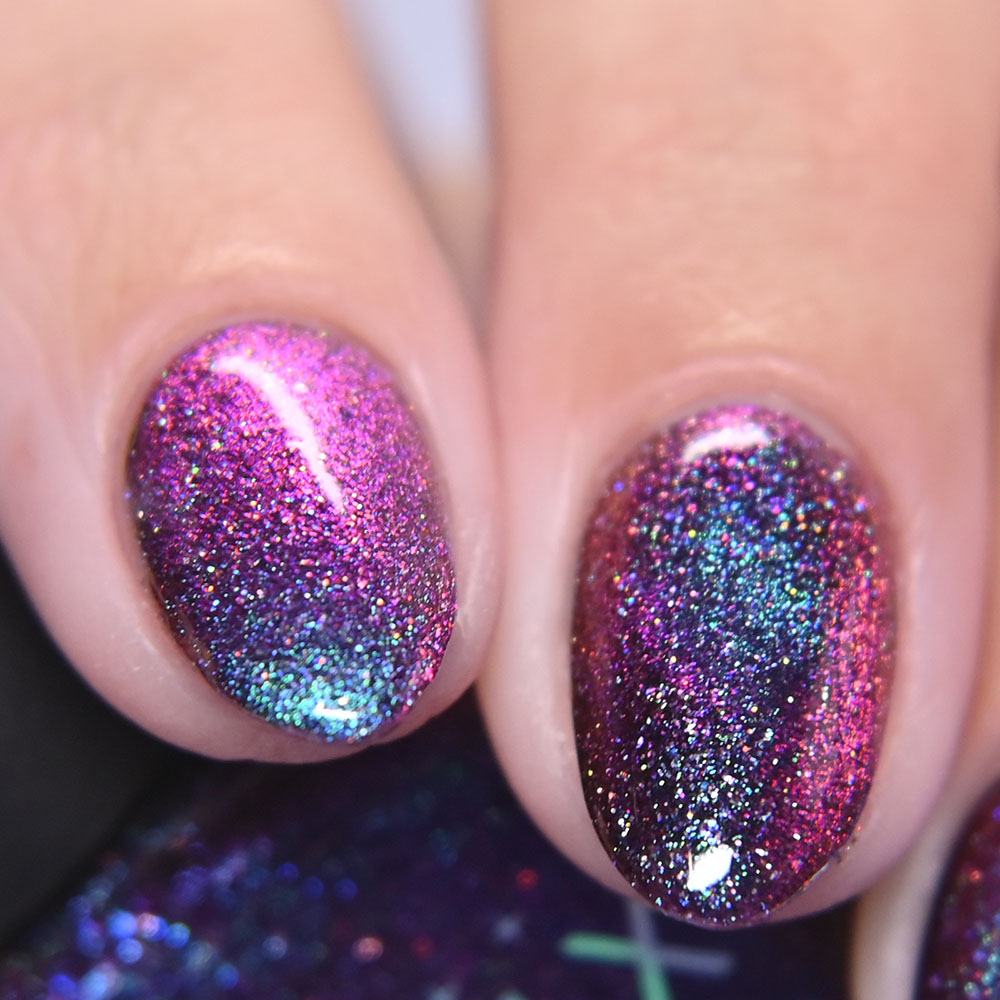 Description: Now You See Me is a blackened purple base with magnetic multichrome pigment that shifts purple, pink, gold, green, and blue, with silver reflective glitter.