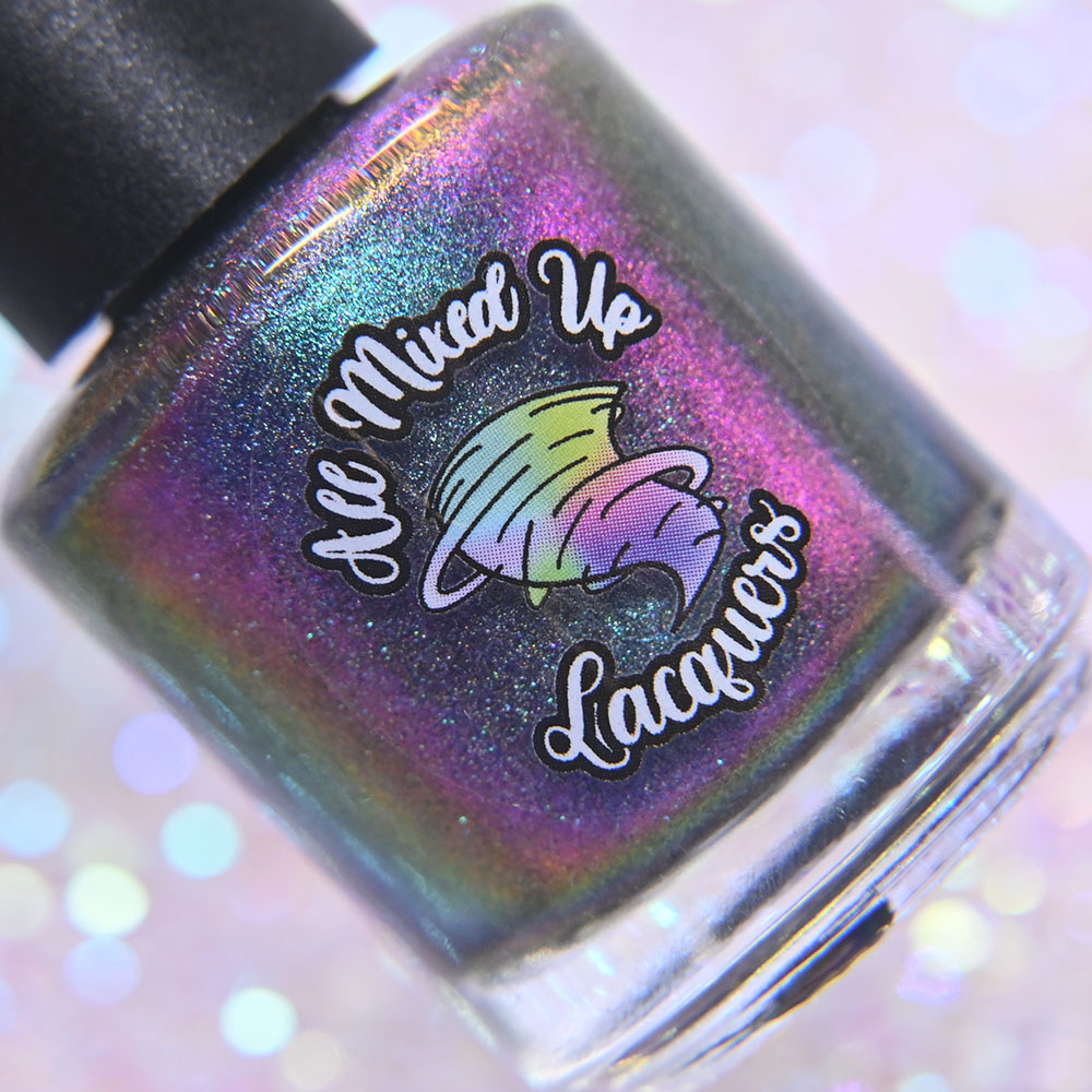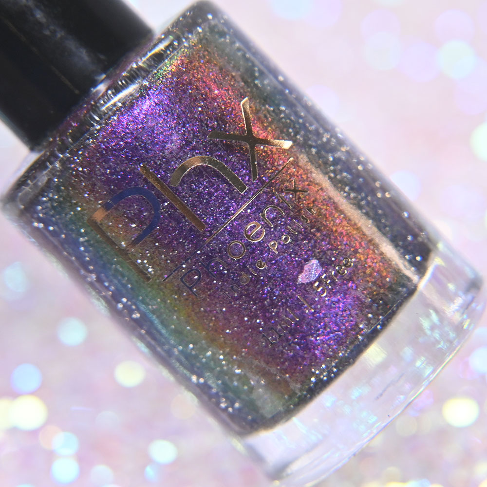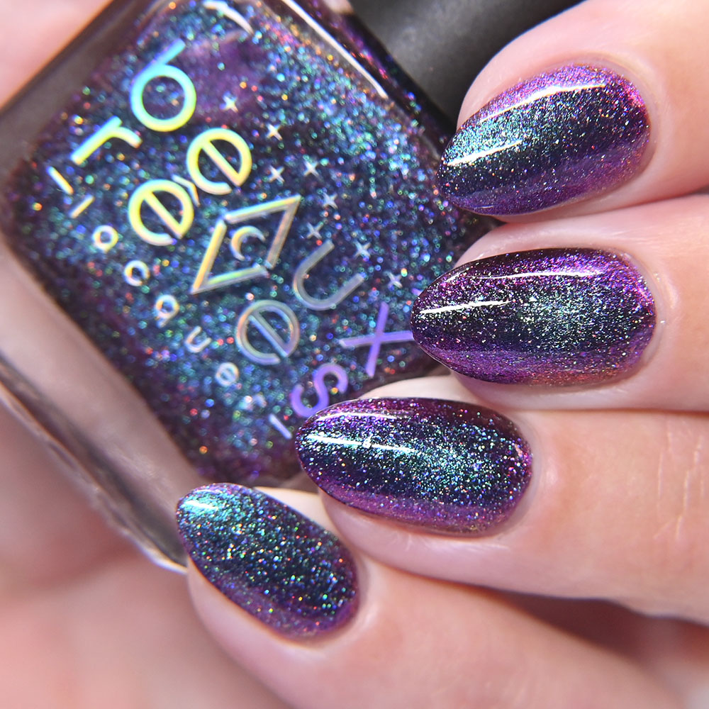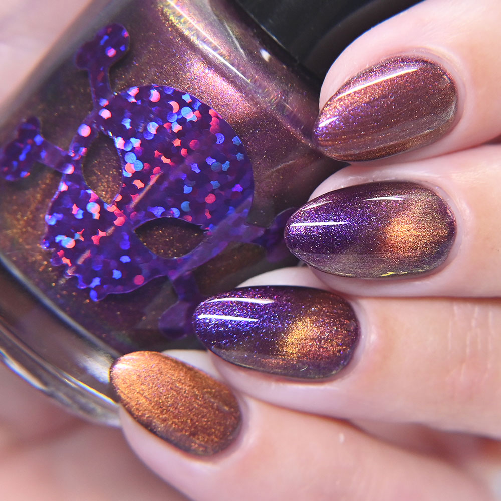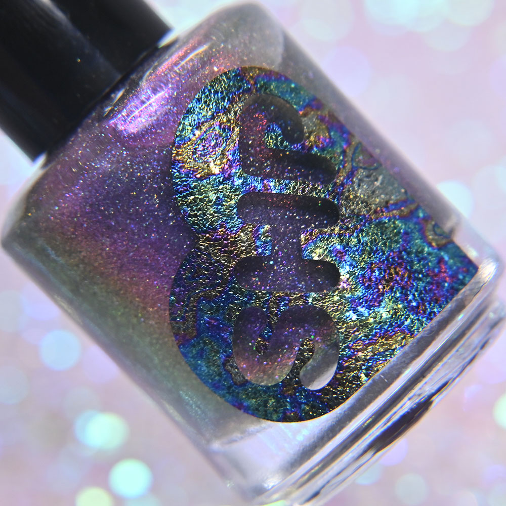 Description: Now You See Me is a blackened purple base with magnetic multichrome pigment that shifts purple, pink, gold, green, and blue, with silver reflective glitter.