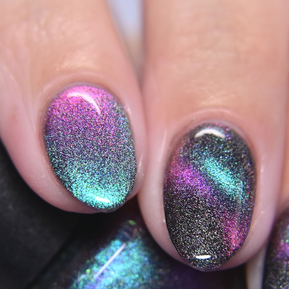 This polish is on the thick side due to both magnetic pigment and reflective glitters.