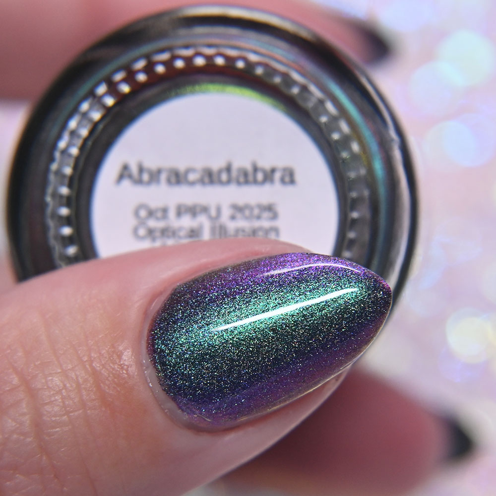 Description: Abracadabra is a darkened scattered holo with strong green to blue to purple magnetic pigment.