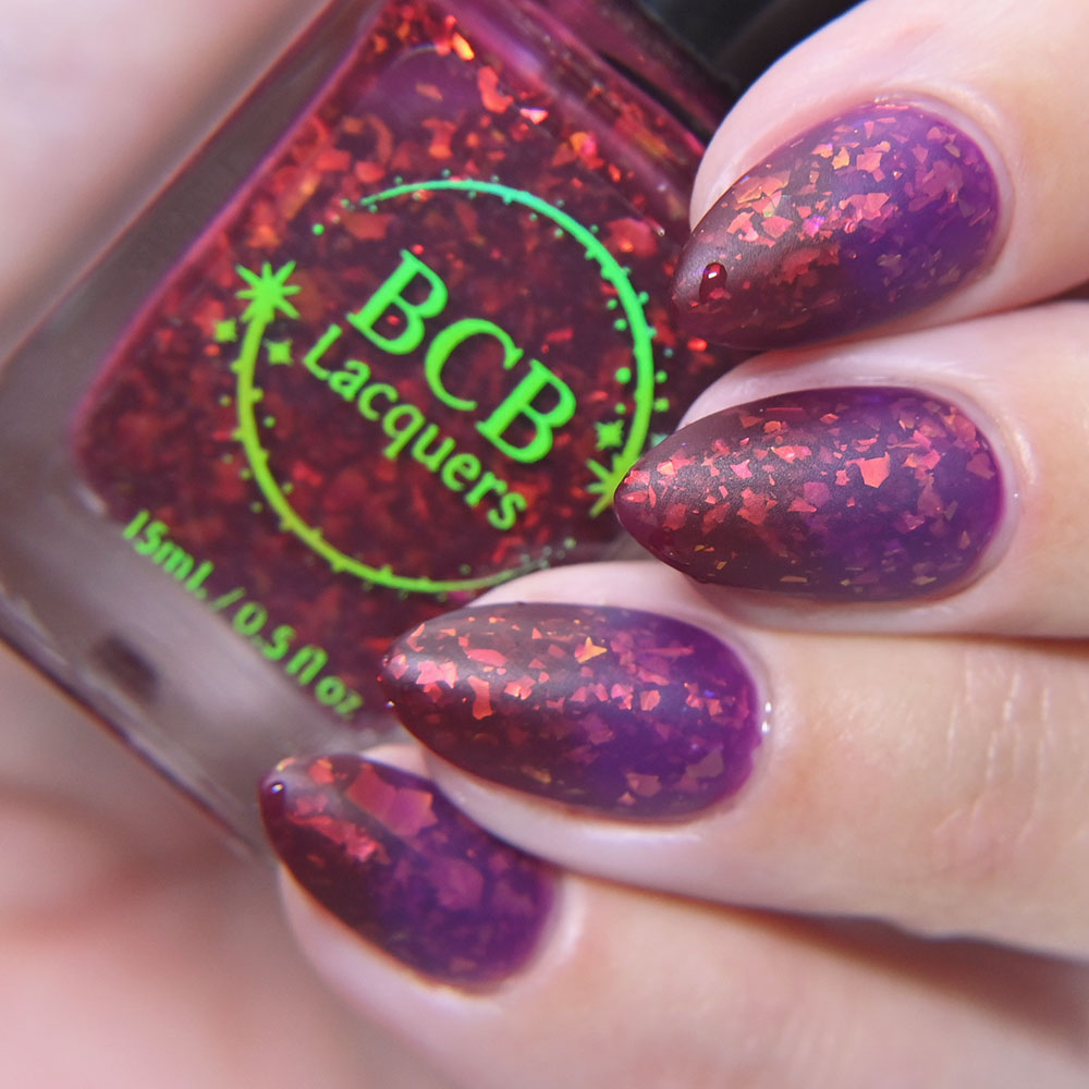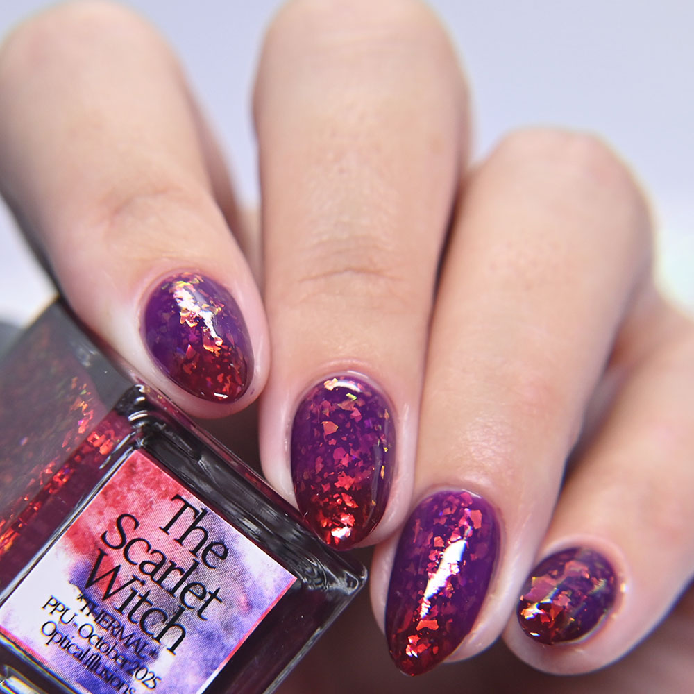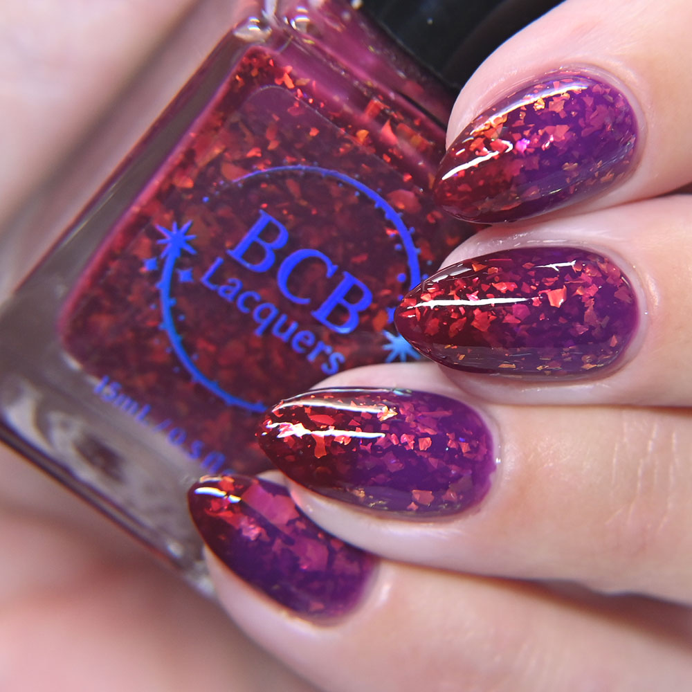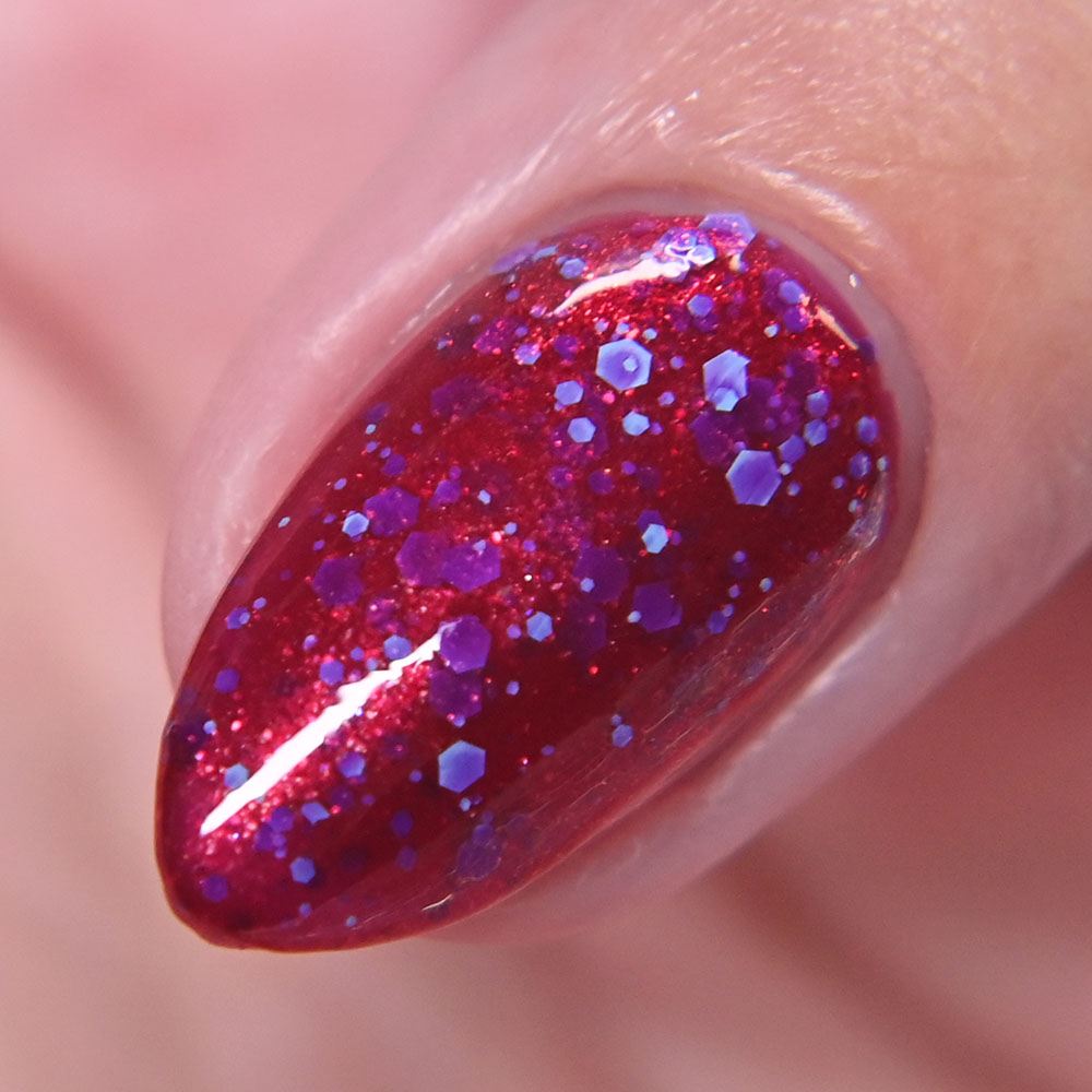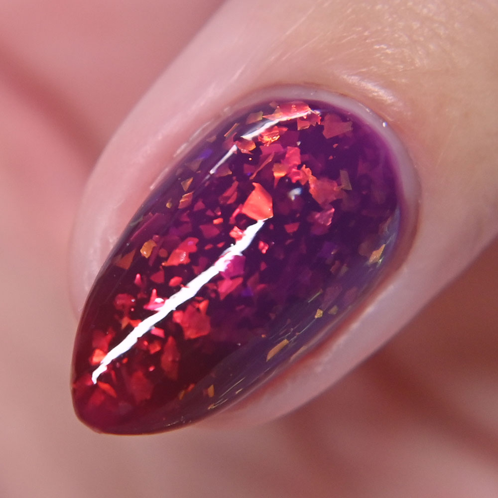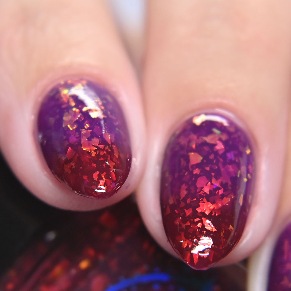 Description: Scarlet Witch is a thermal crelly polish that shifts purple (warm) to red (cold) with red to orange to gold glass flakes.