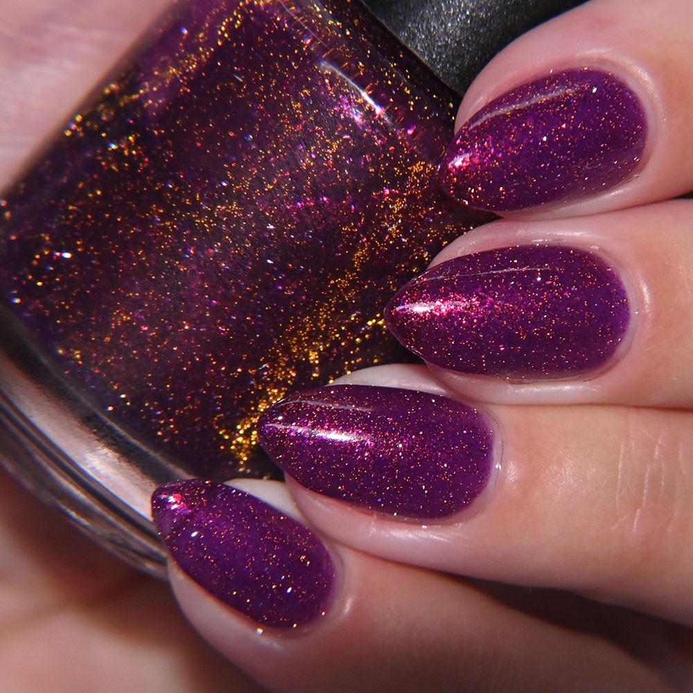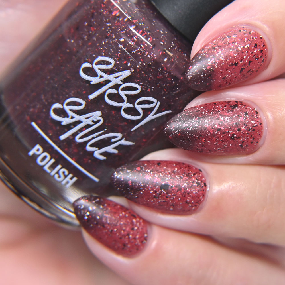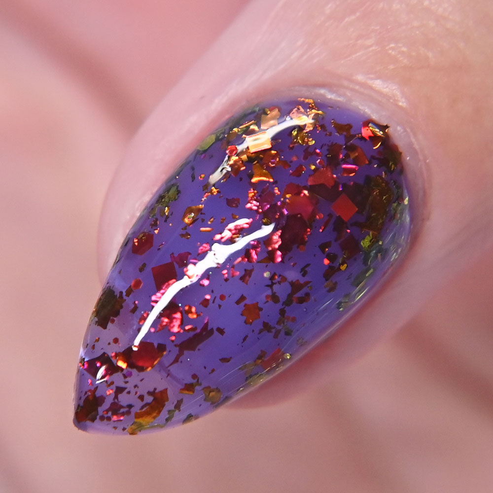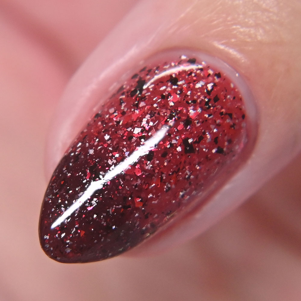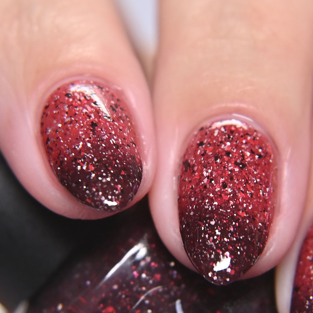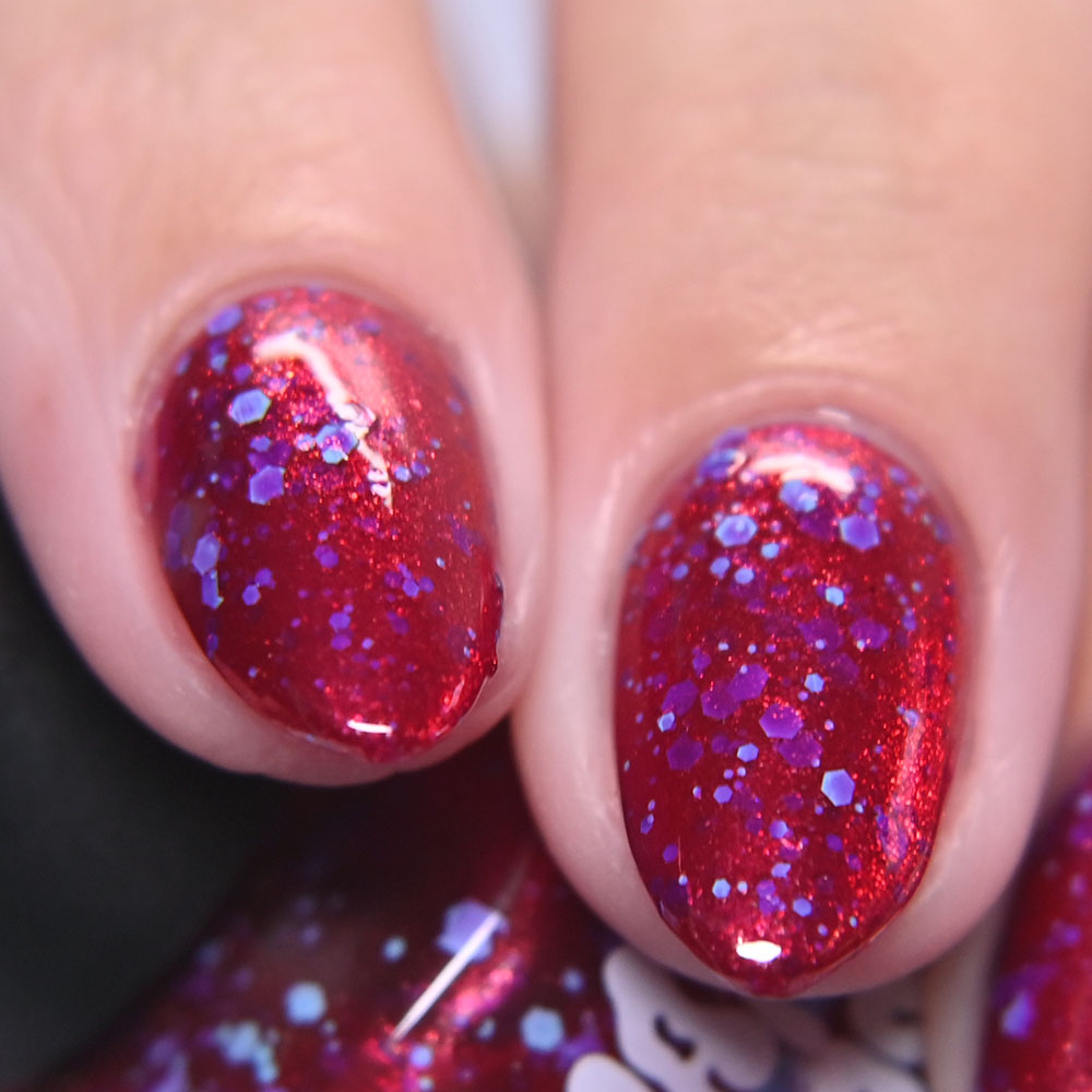 Description: Scarlet Witch is a thermal crelly polish that shifts purple (warm) to red (cold) with red to orange to gold glass flakes.