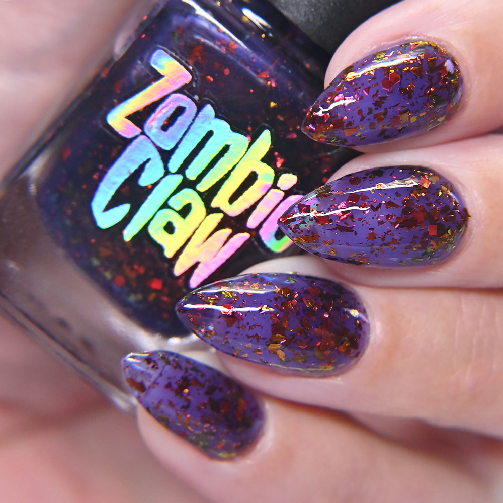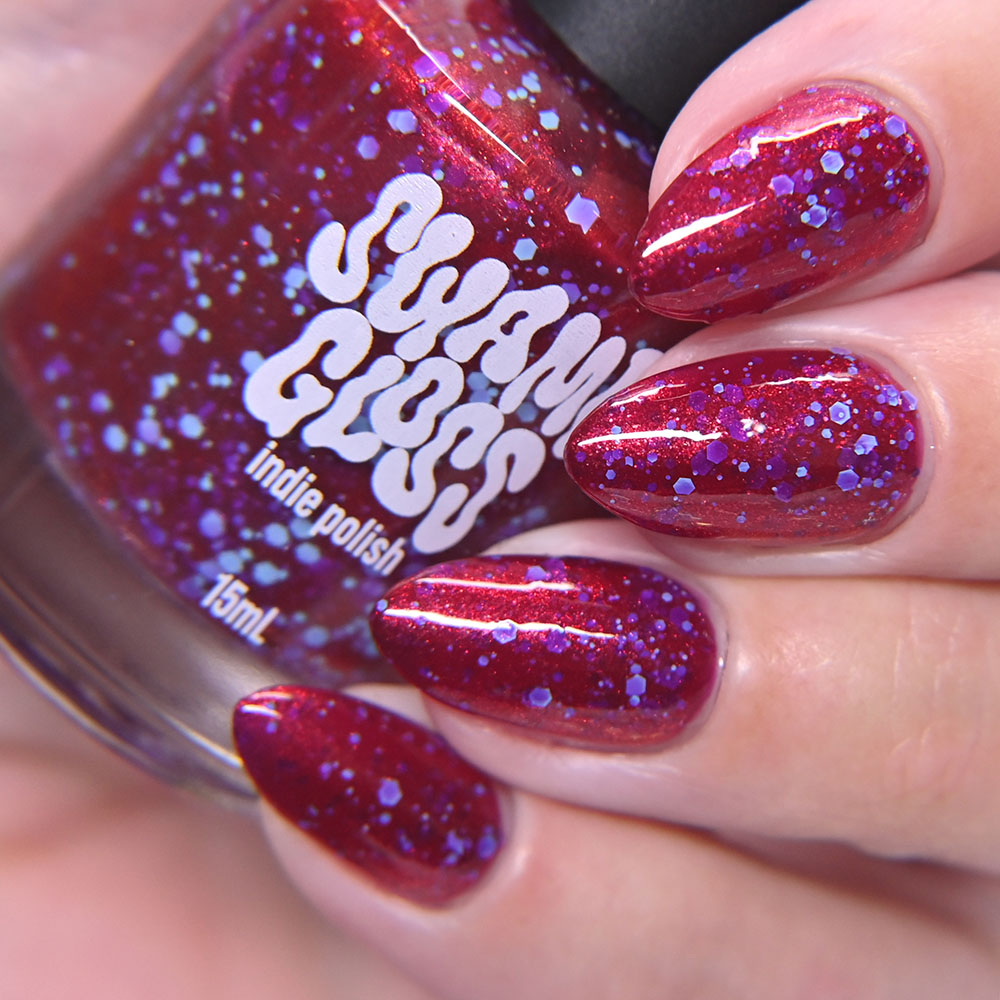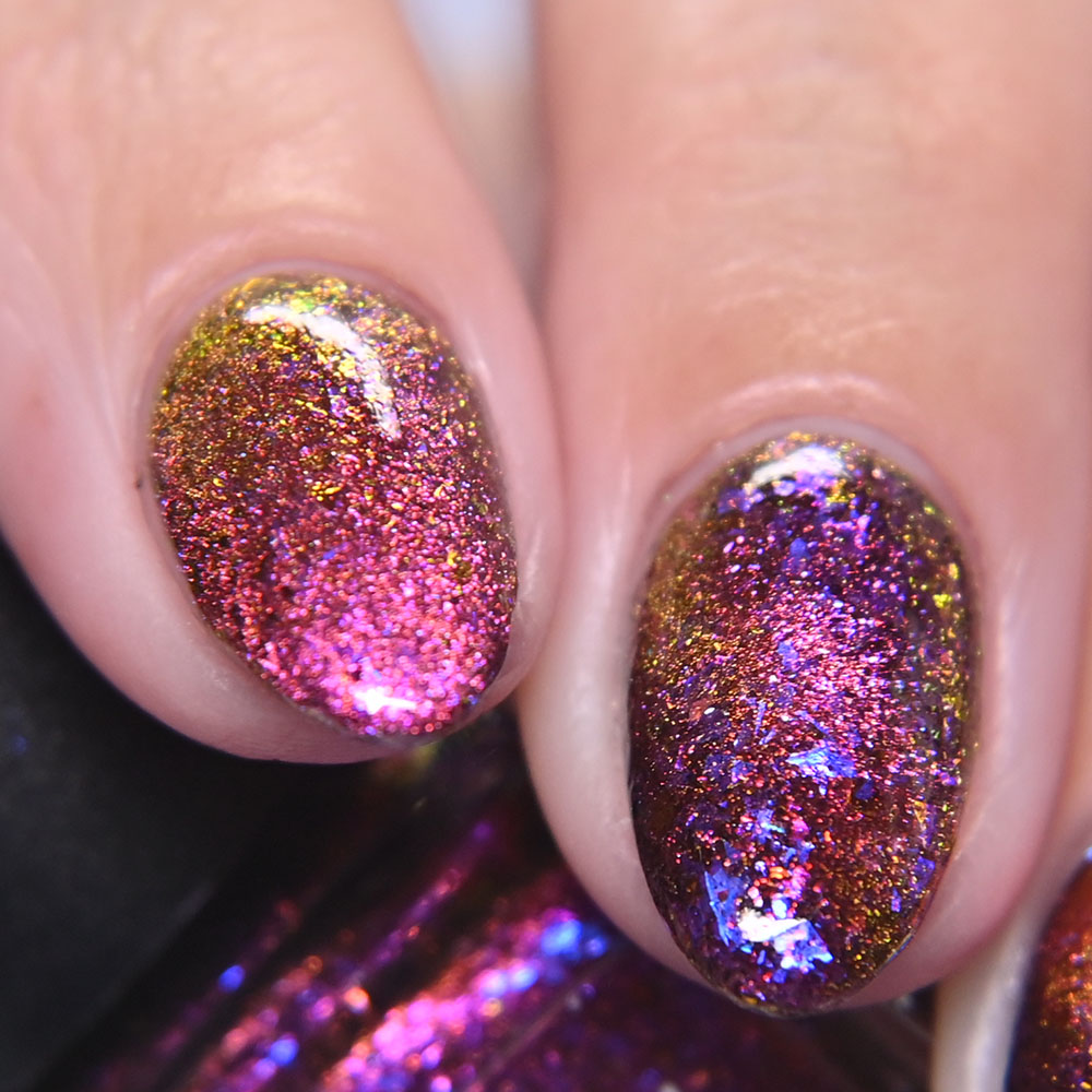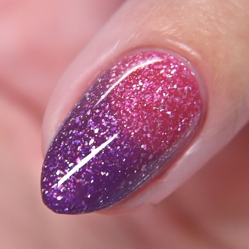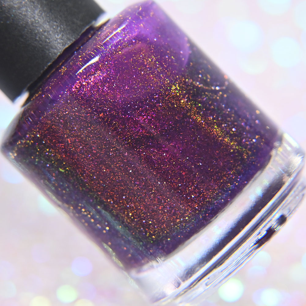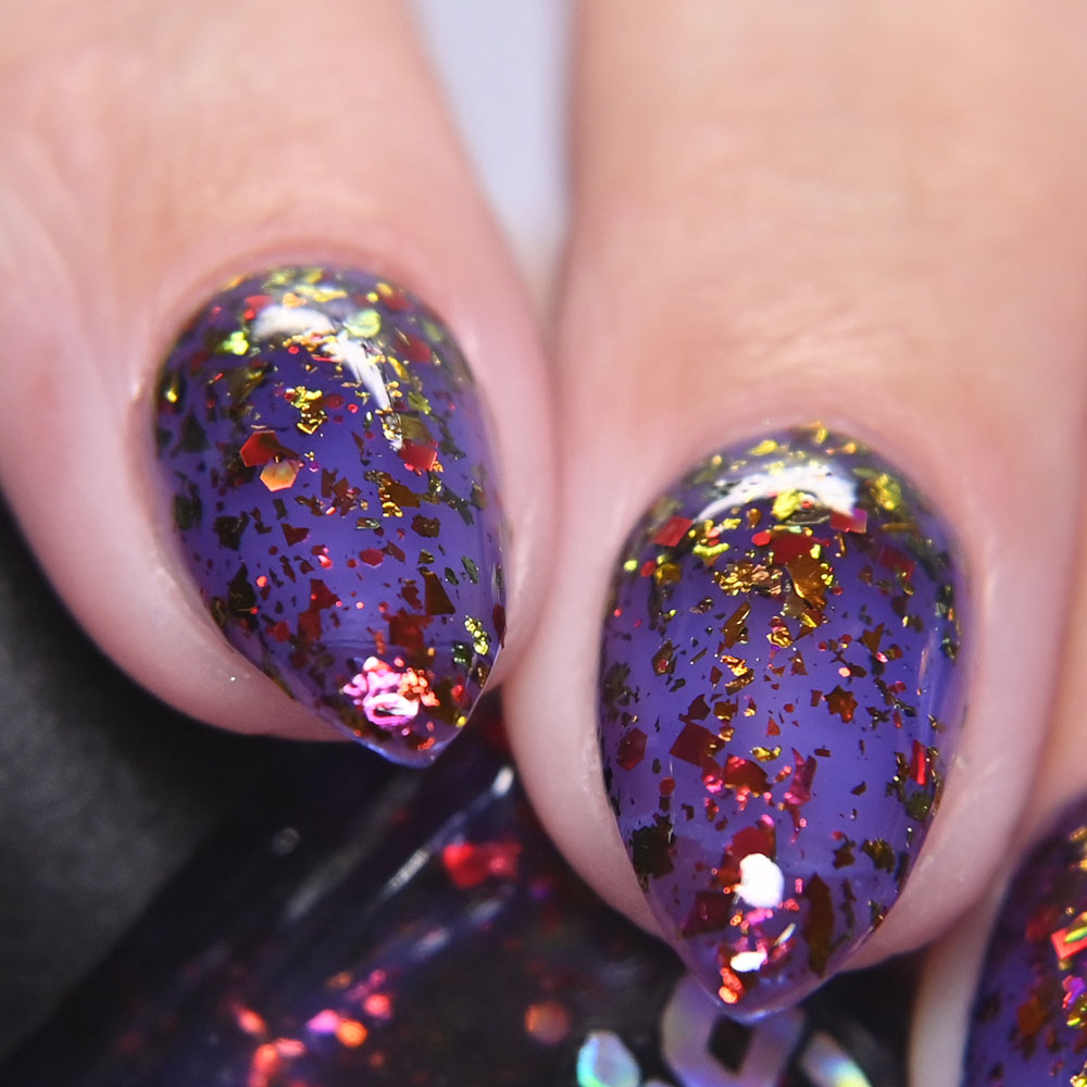 Description: Scarlet Witch is a thermal crelly polish that shifts purple (warm) to red (cold) with red to orange to gold glass flakes.