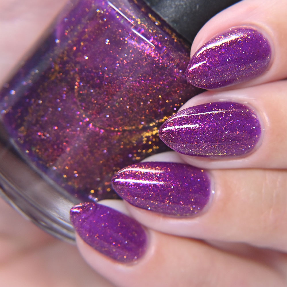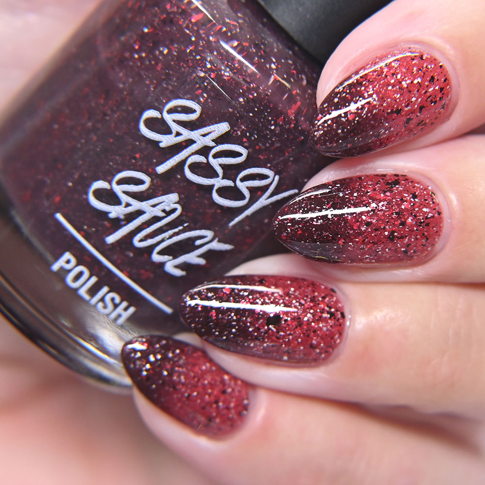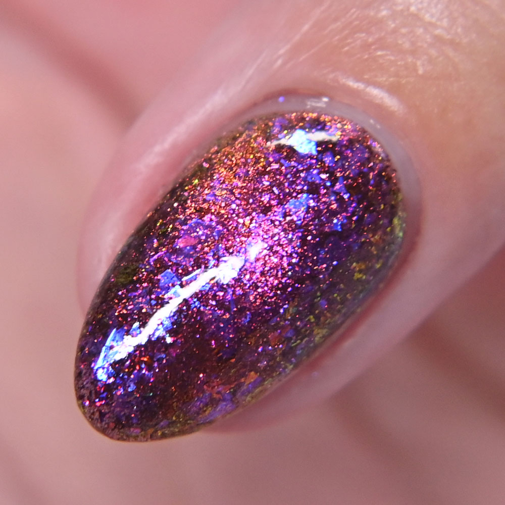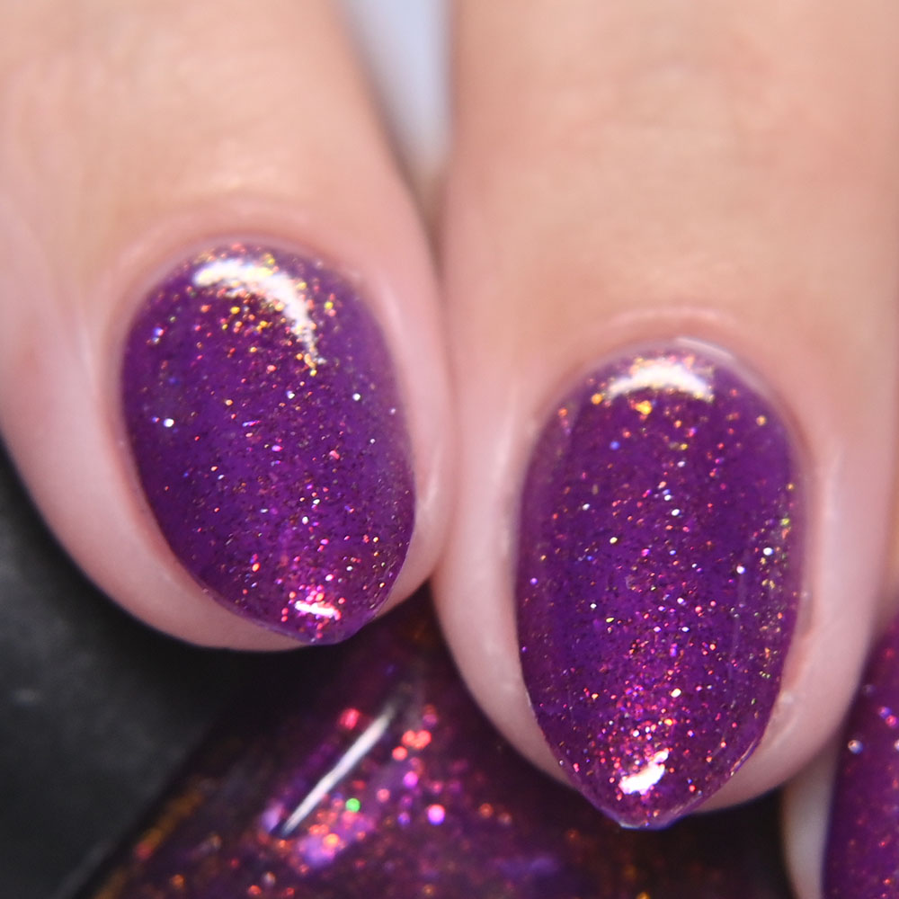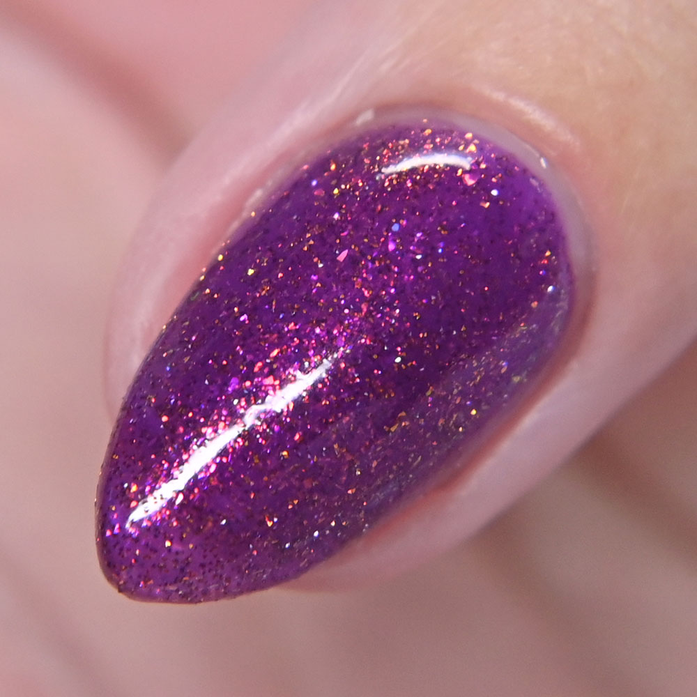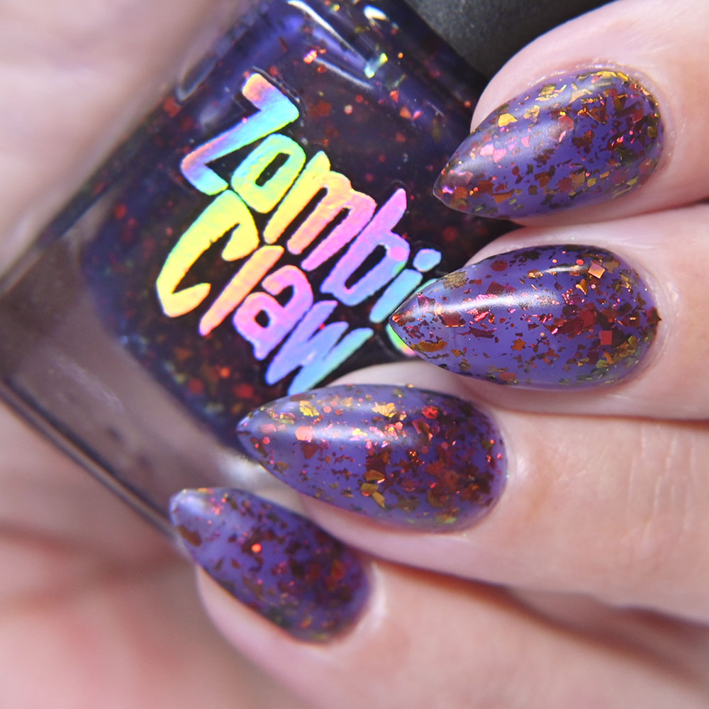 Description: Scarlet Witch is a thermal crelly polish that shifts purple (warm) to red (cold) with red to orange to gold glass flakes.