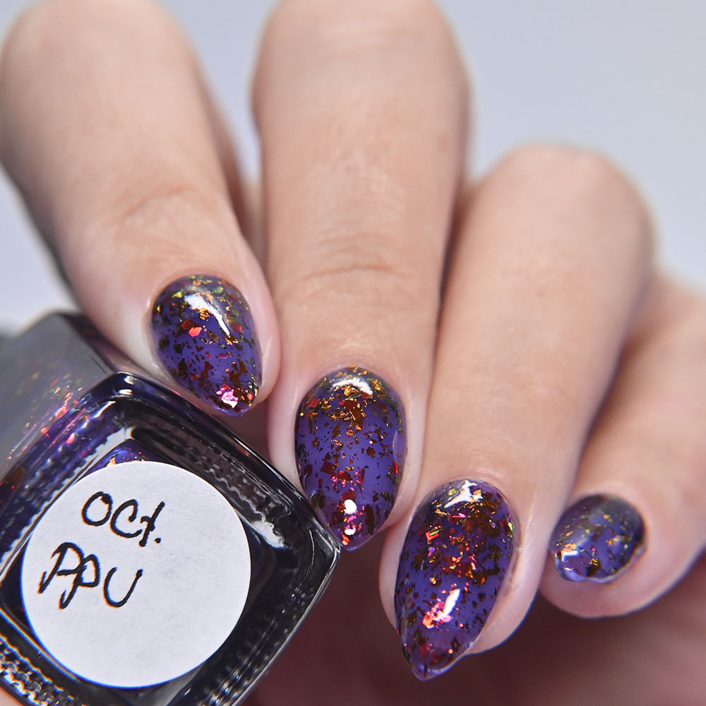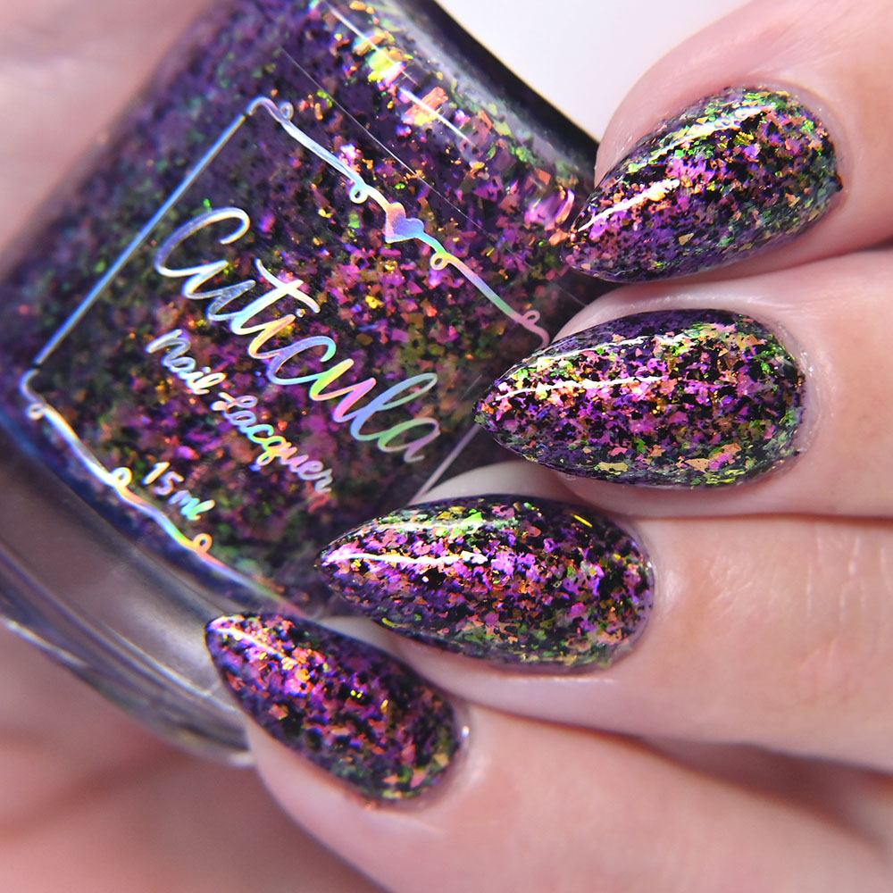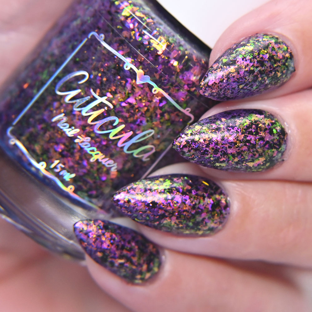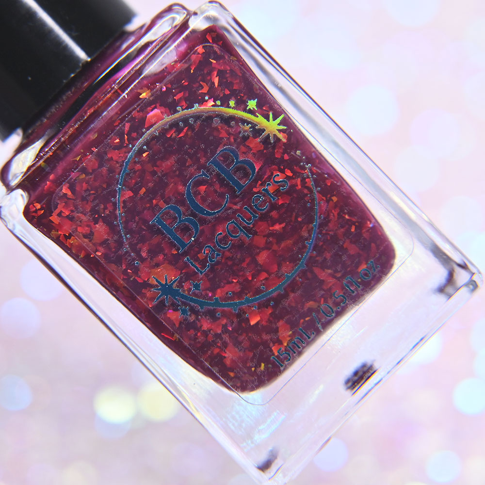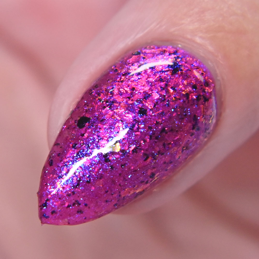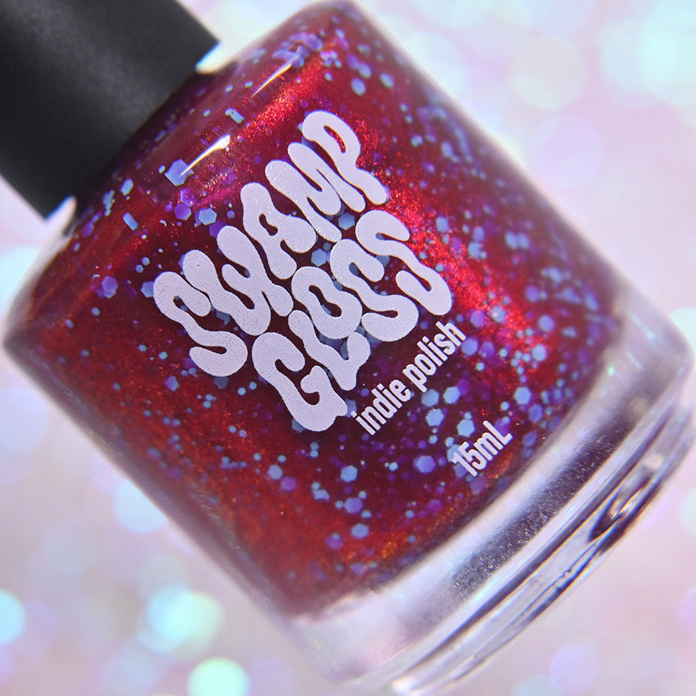 Description: Scarlet Witch is a thermal crelly polish that shifts purple (warm) to red (cold) with red to orange to gold glass flakes.