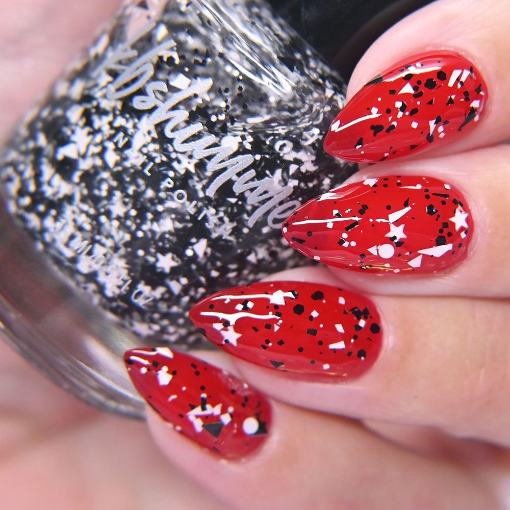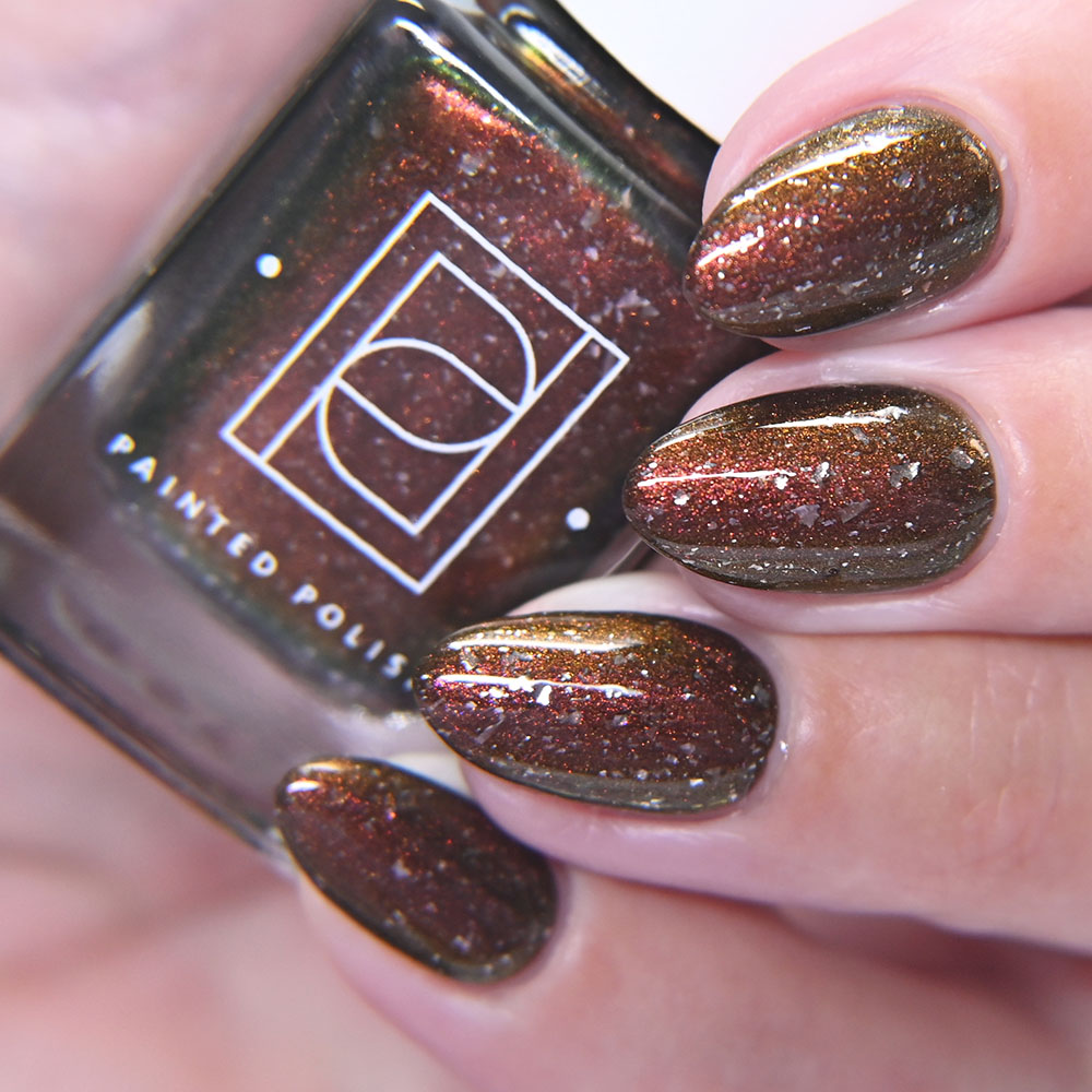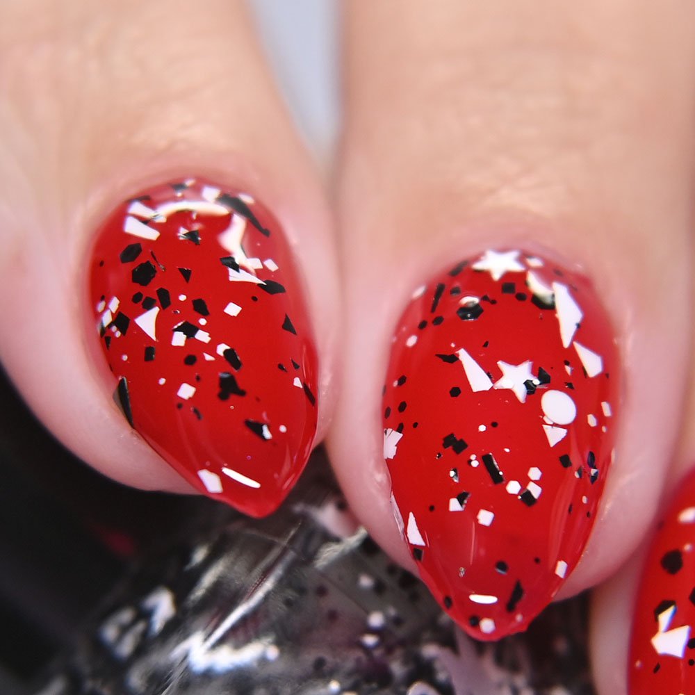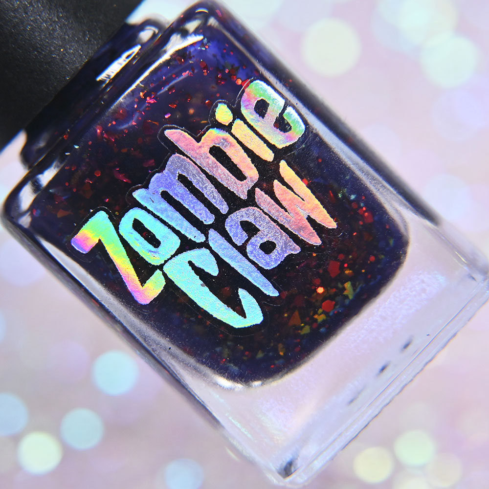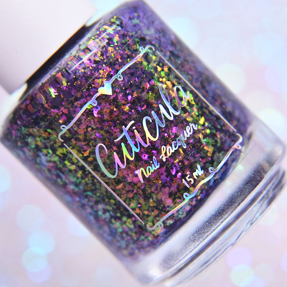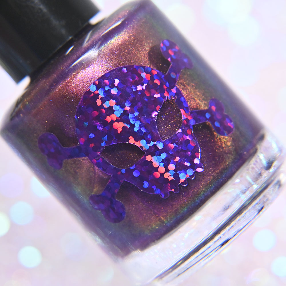 Description: Scarlet Witch is a thermal crelly polish that shifts purple (warm) to red (cold) with red to orange to gold glass flakes.