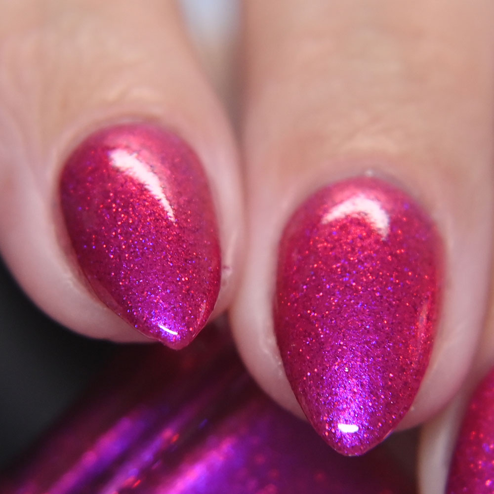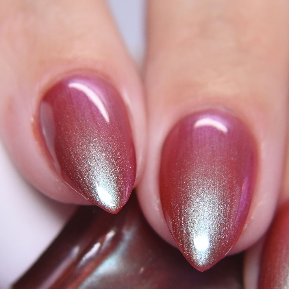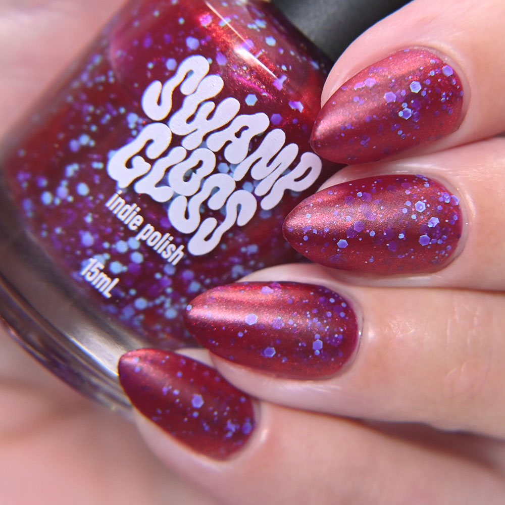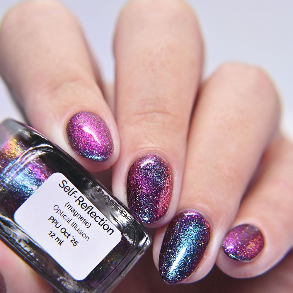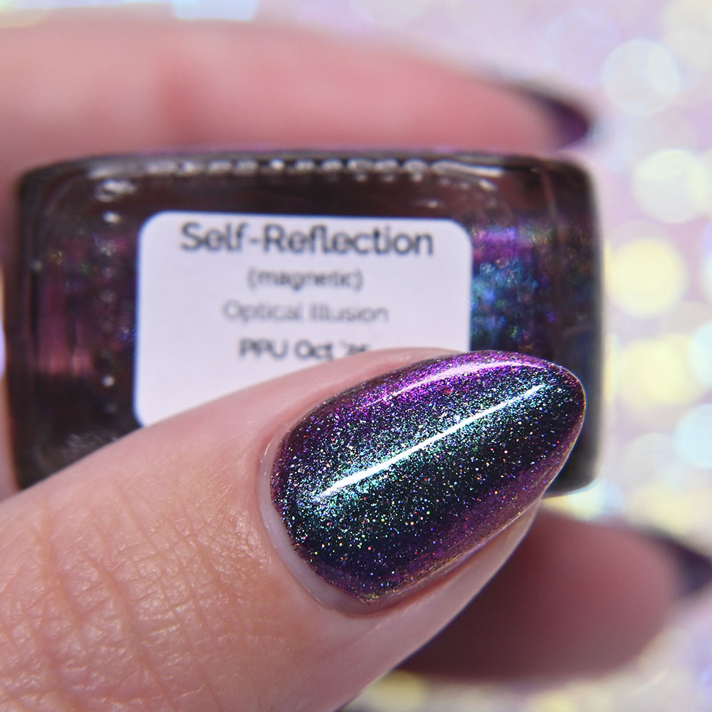 Description: Self-Reflection is a magnetic polish with a deep berry base with magnetic chroma color shifting flakes and holo glitter sparkle