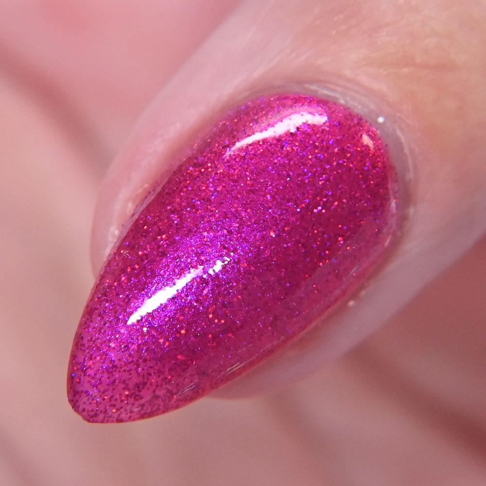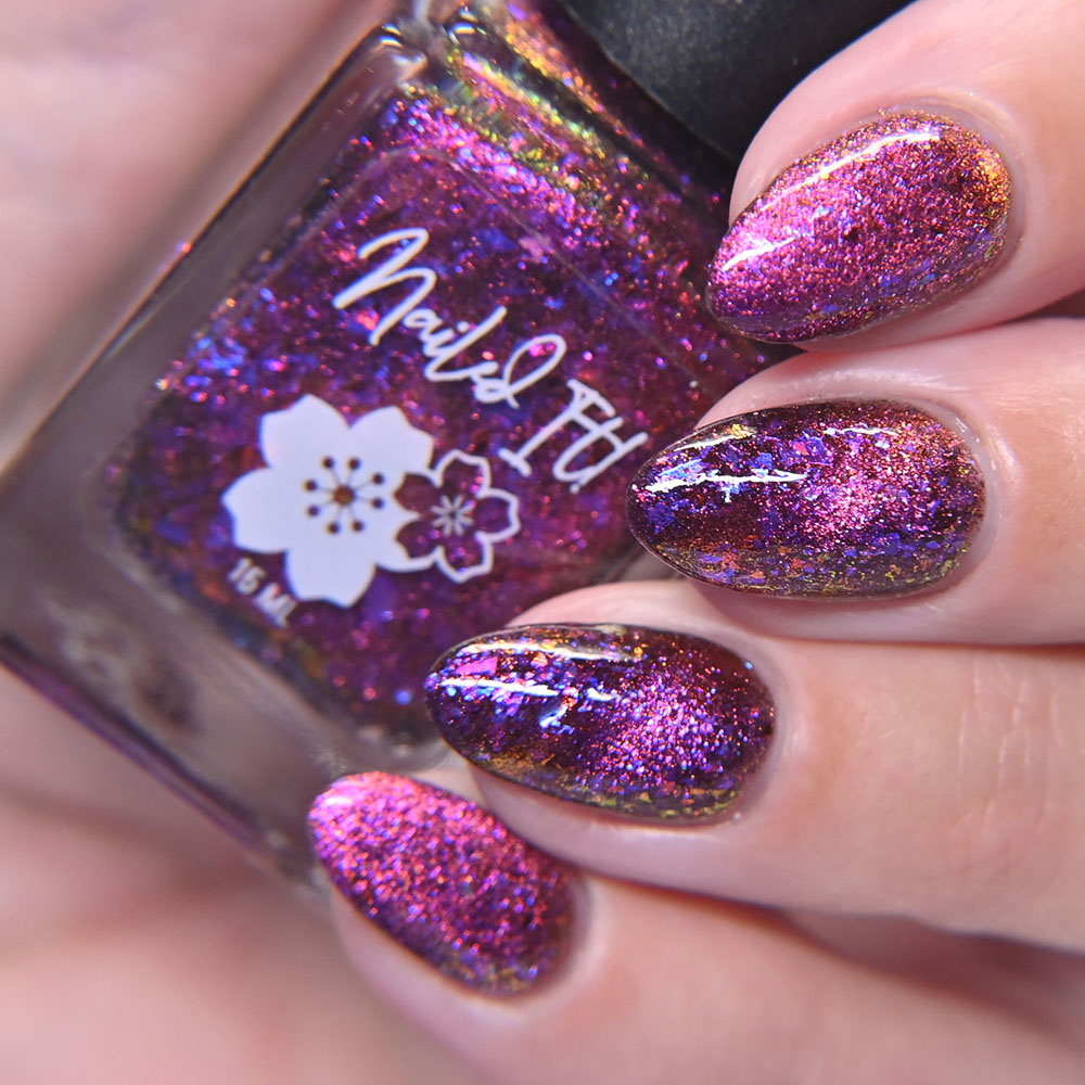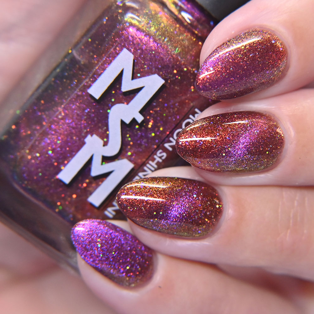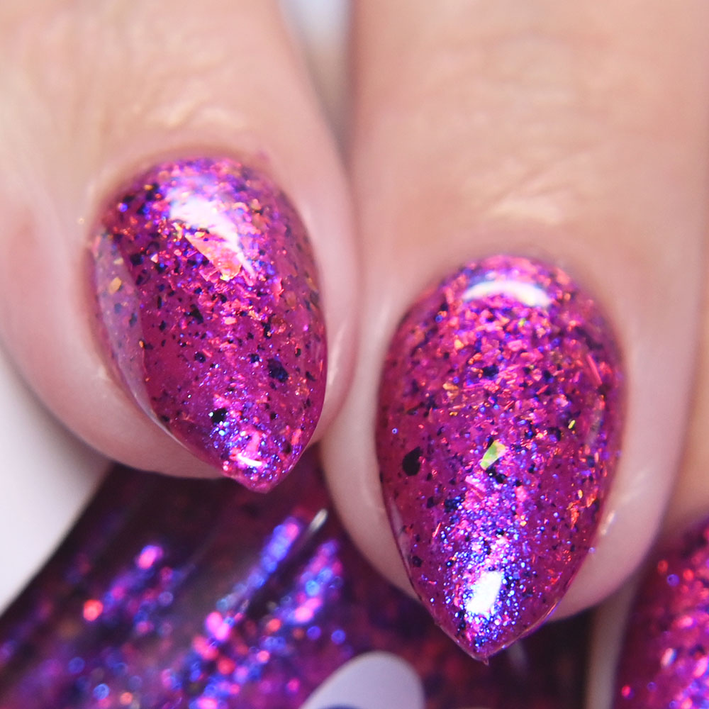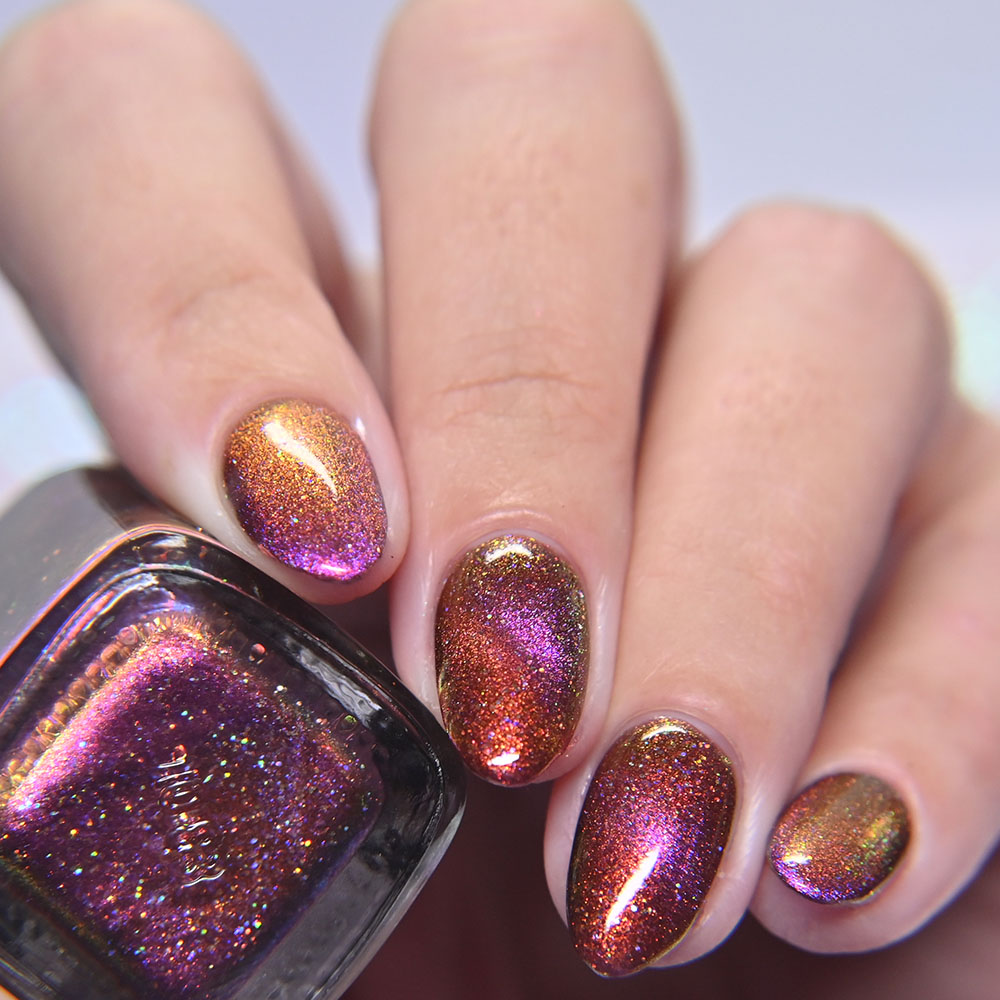 Description: Self-Reflection is a magnetic polish with a deep berry base with magnetic chroma color shifting flakes and holo glitter sparkle