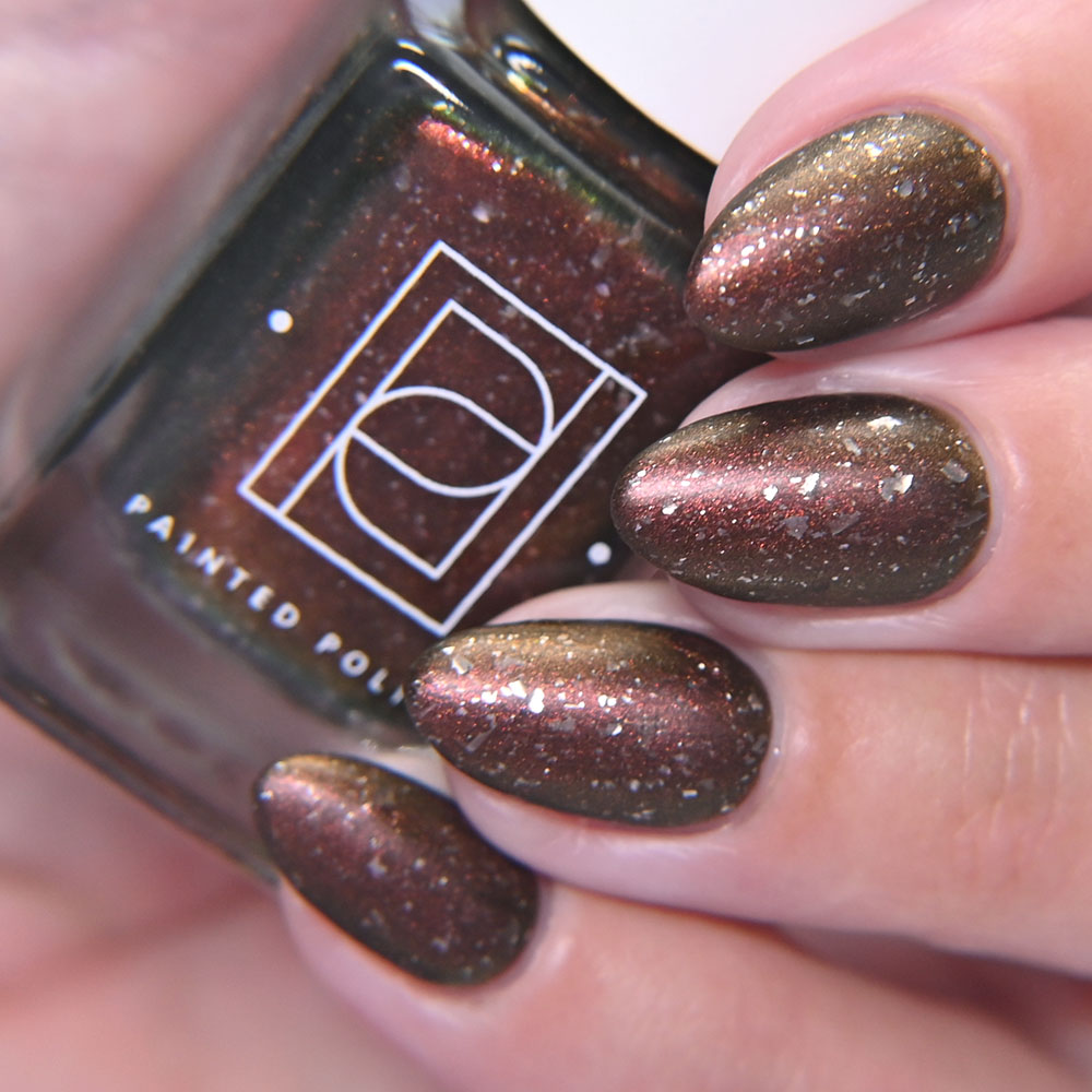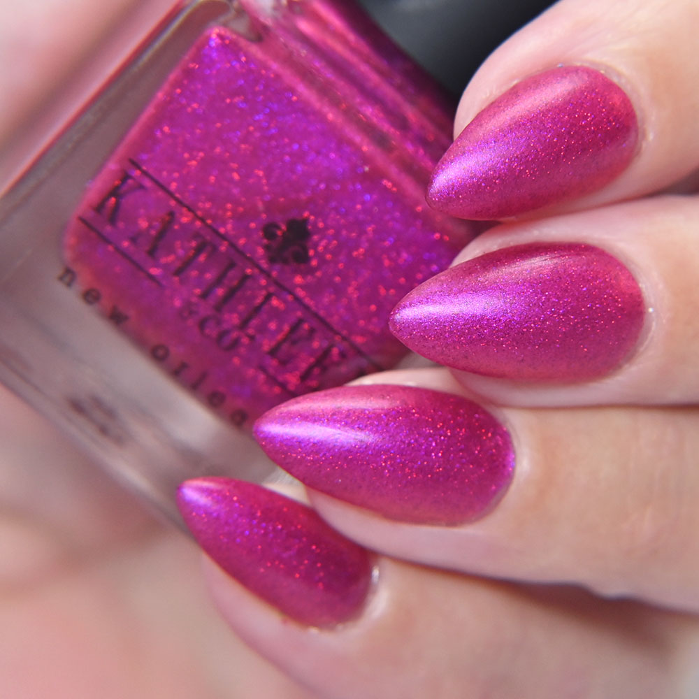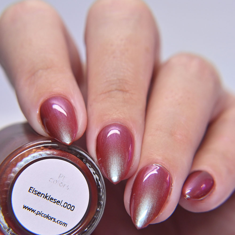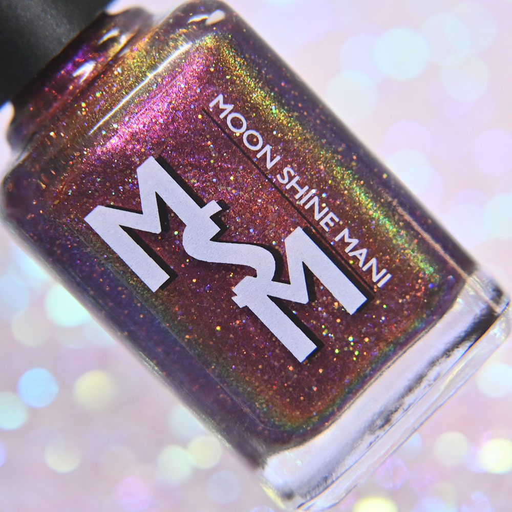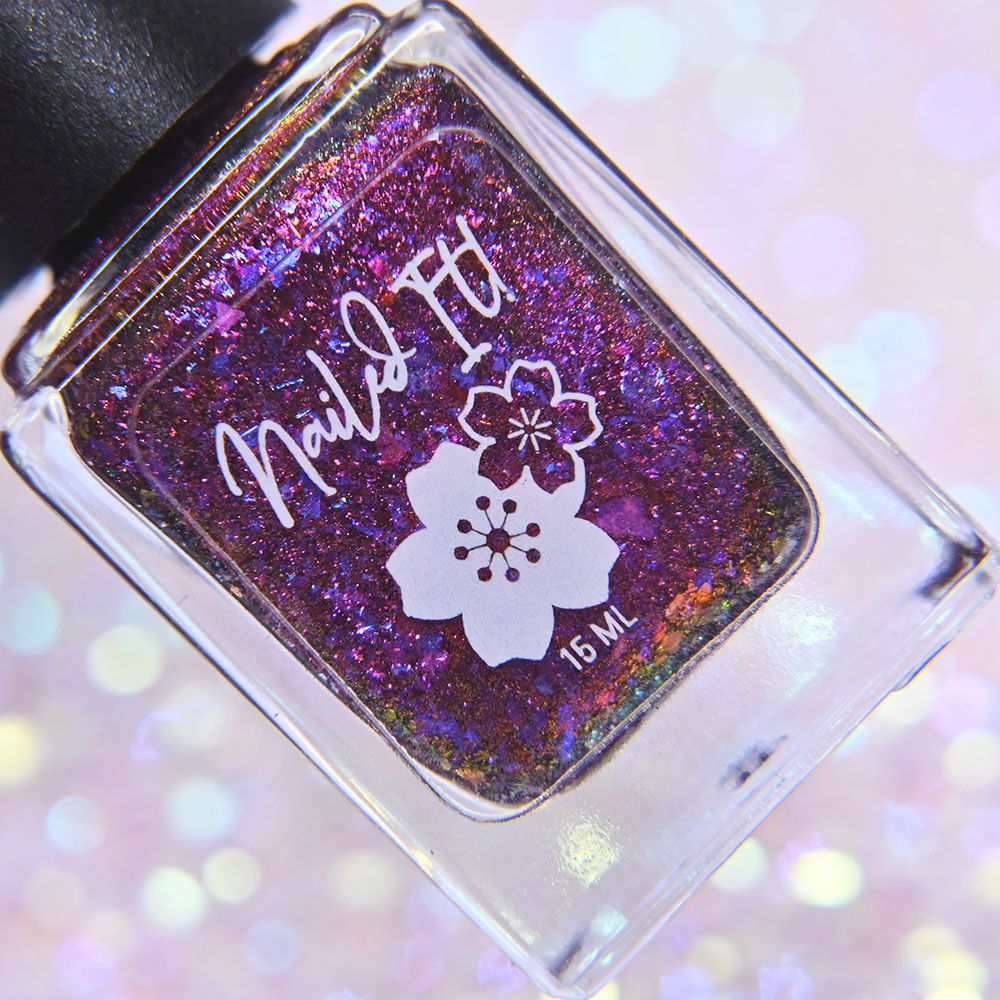 Description: Self-Reflection is a magnetic polish with a deep berry base with magnetic chroma color shifting flakes and holo glitter sparkle