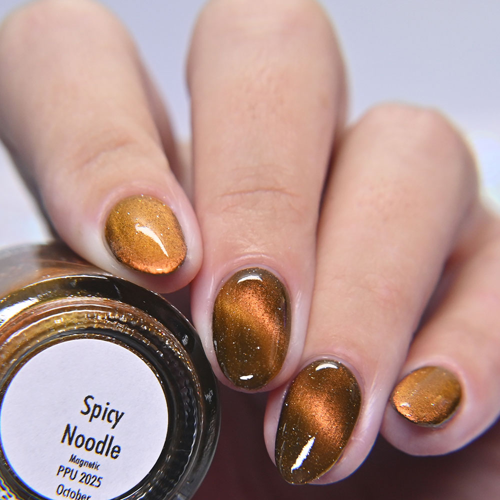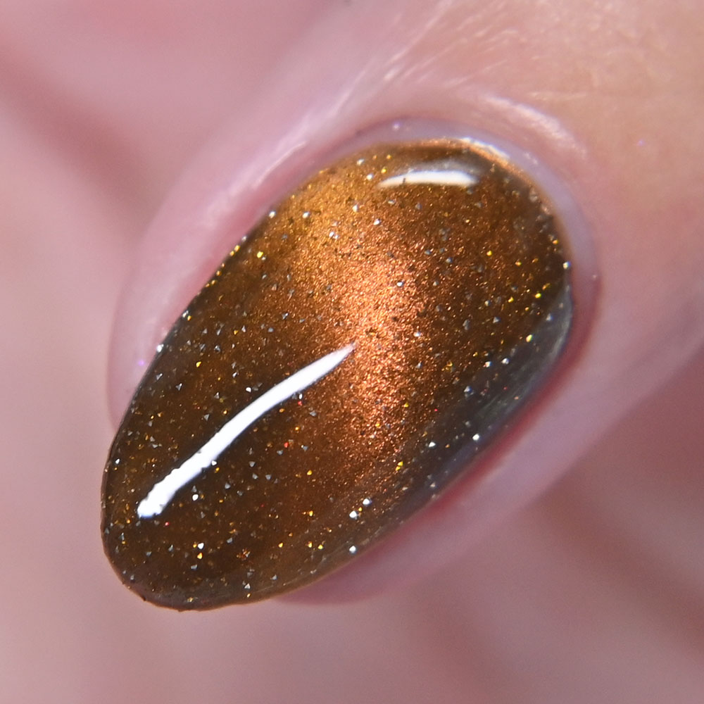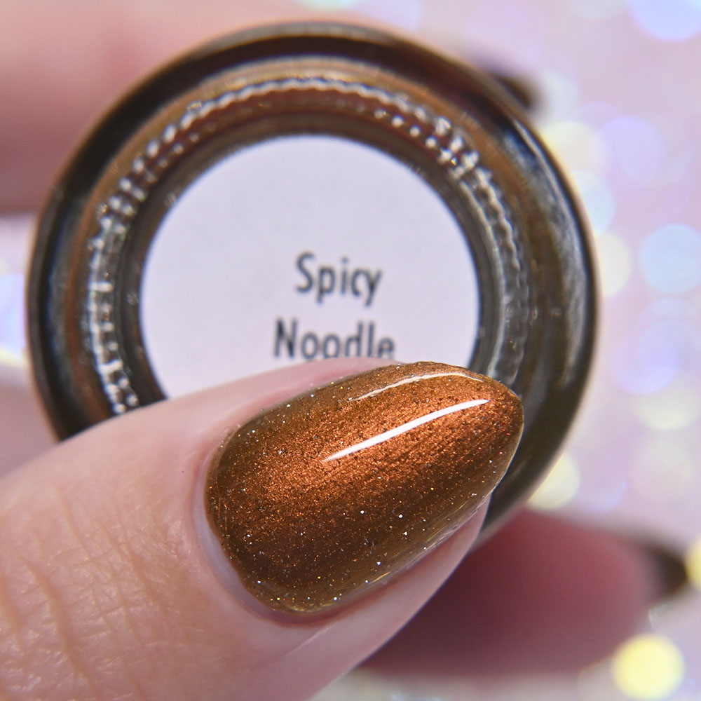 Description: Spicy Noodle is a deep brown jelly base with copper magnetic pigment and gold light reflective glitter.