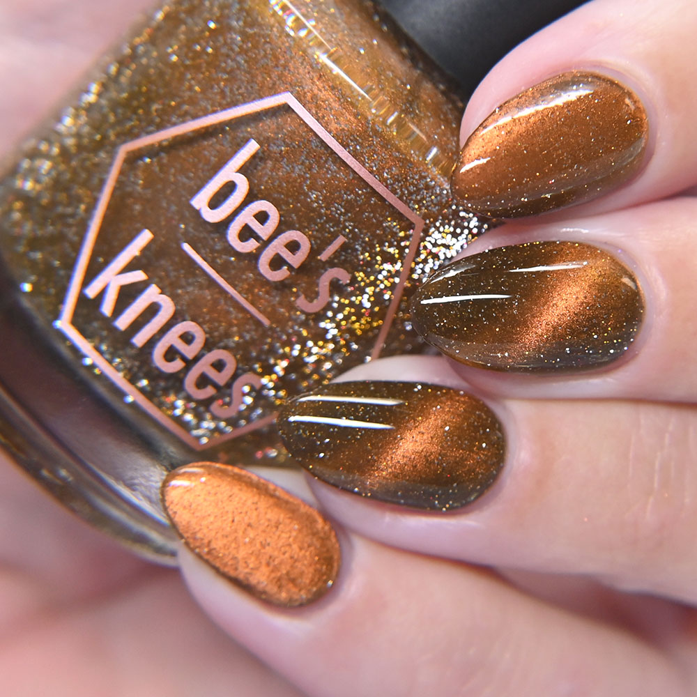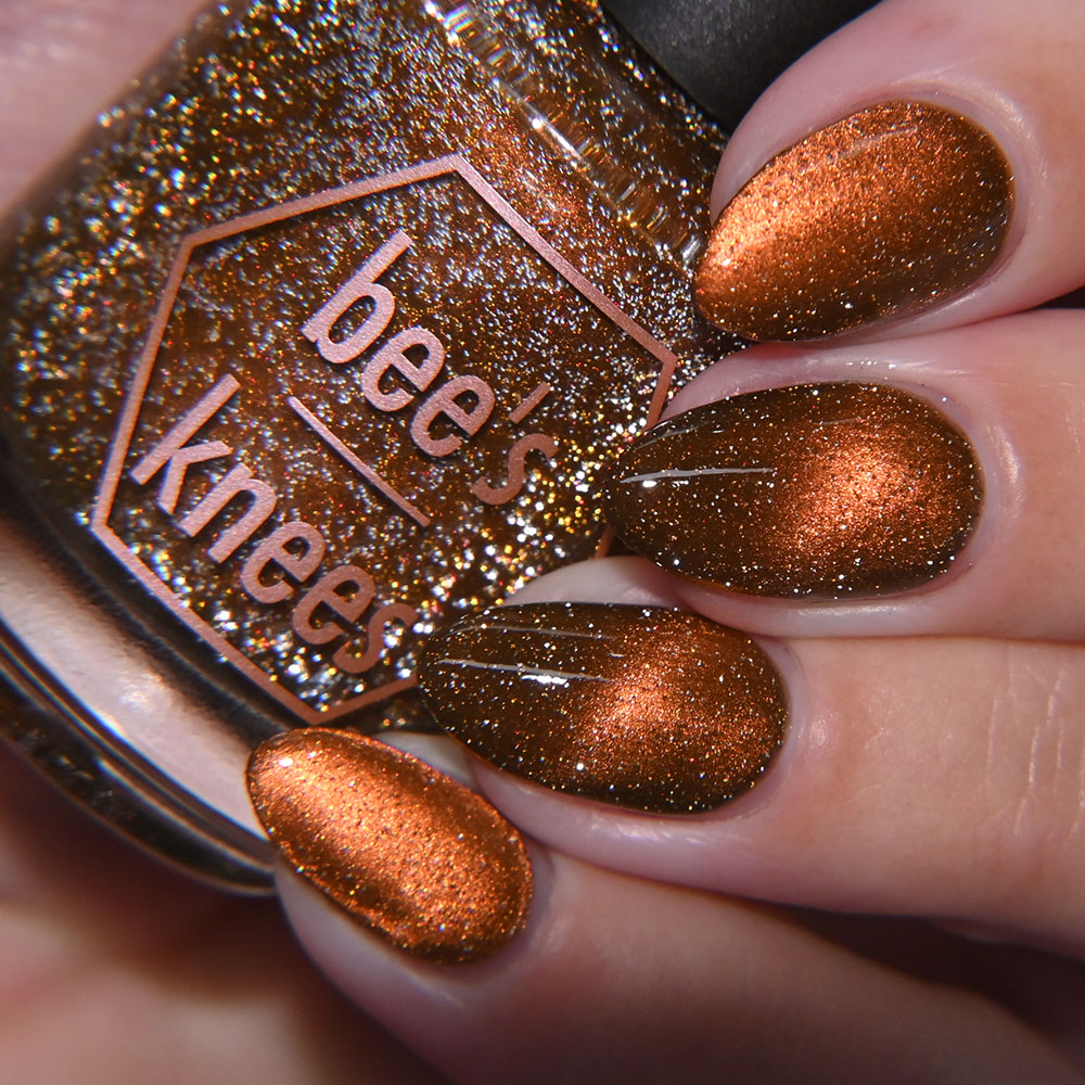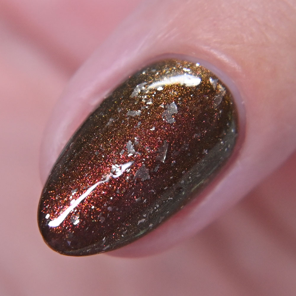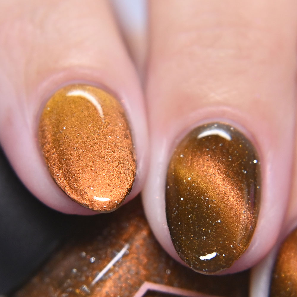 Description: Spicy Noodle is a deep brown jelly base with copper magnetic pigment and gold light reflective glitter.
