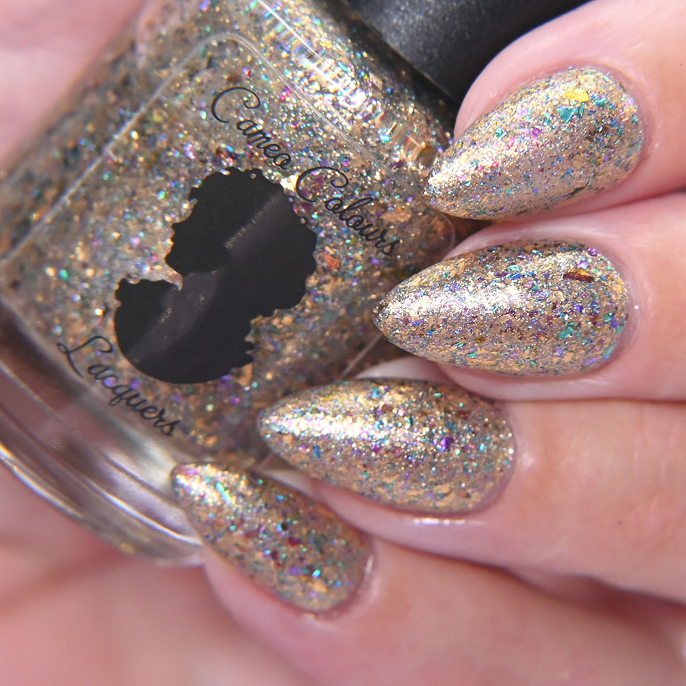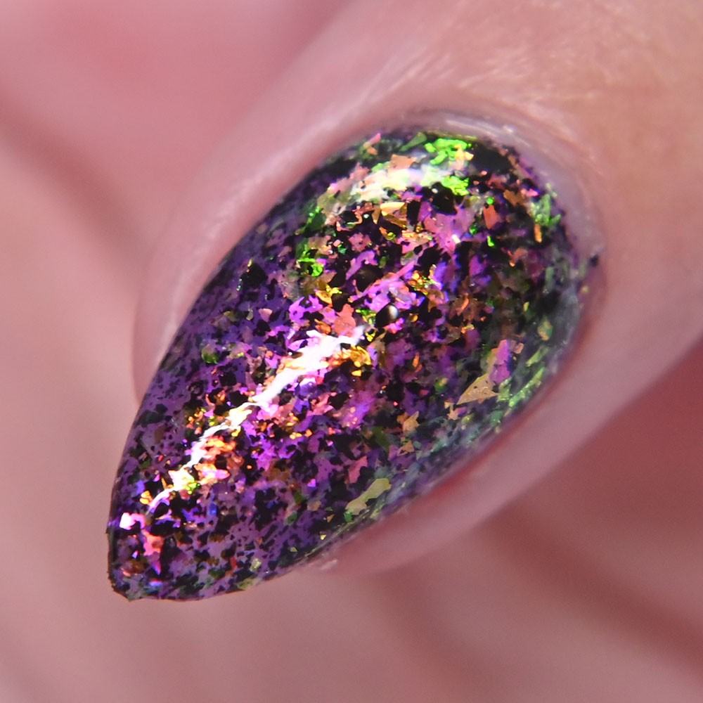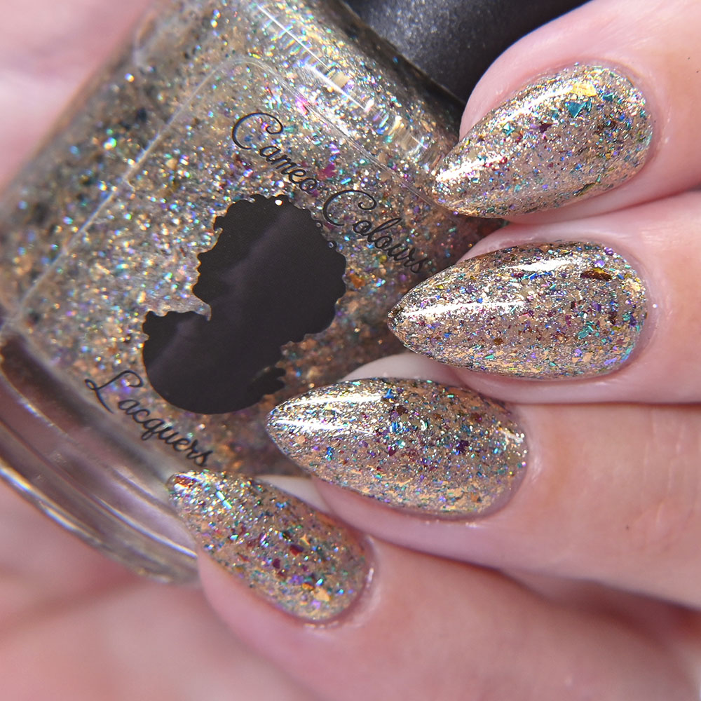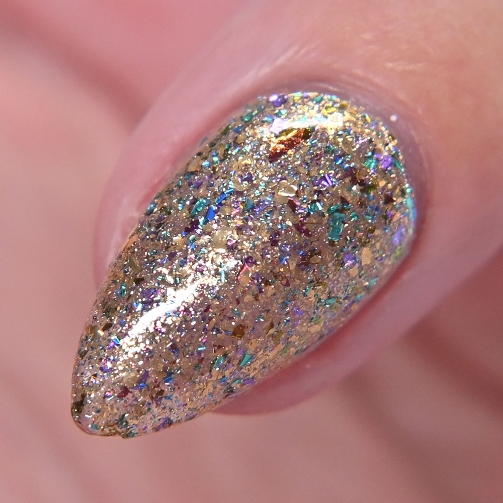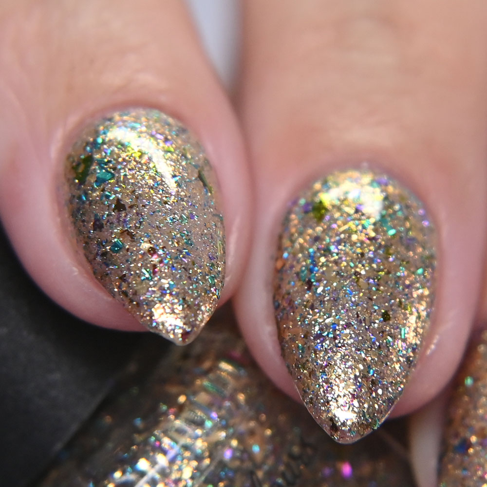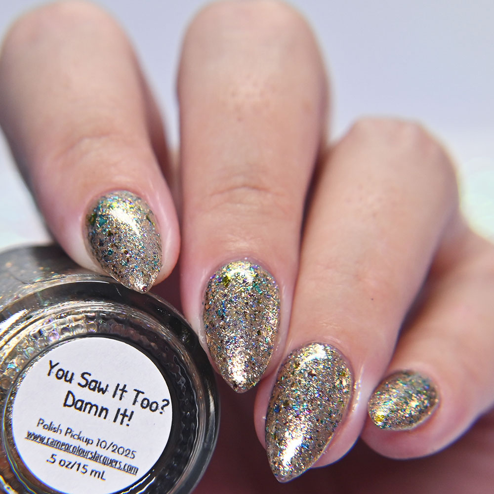 Description: You Saw It Too? Damn It! is a gold flake base with a slight holo sparkle, multicolor metallic flakes, and silver holo micro flakes.