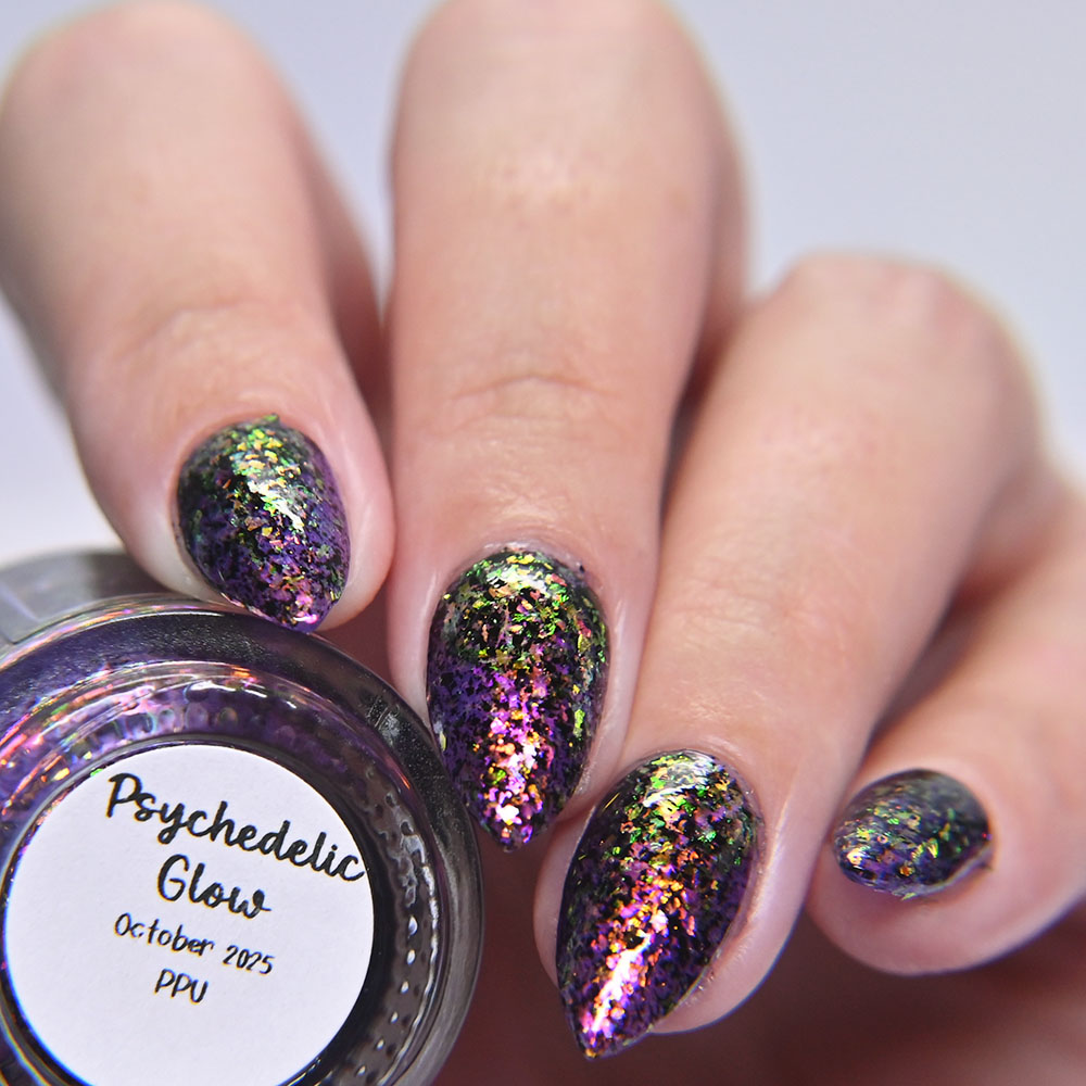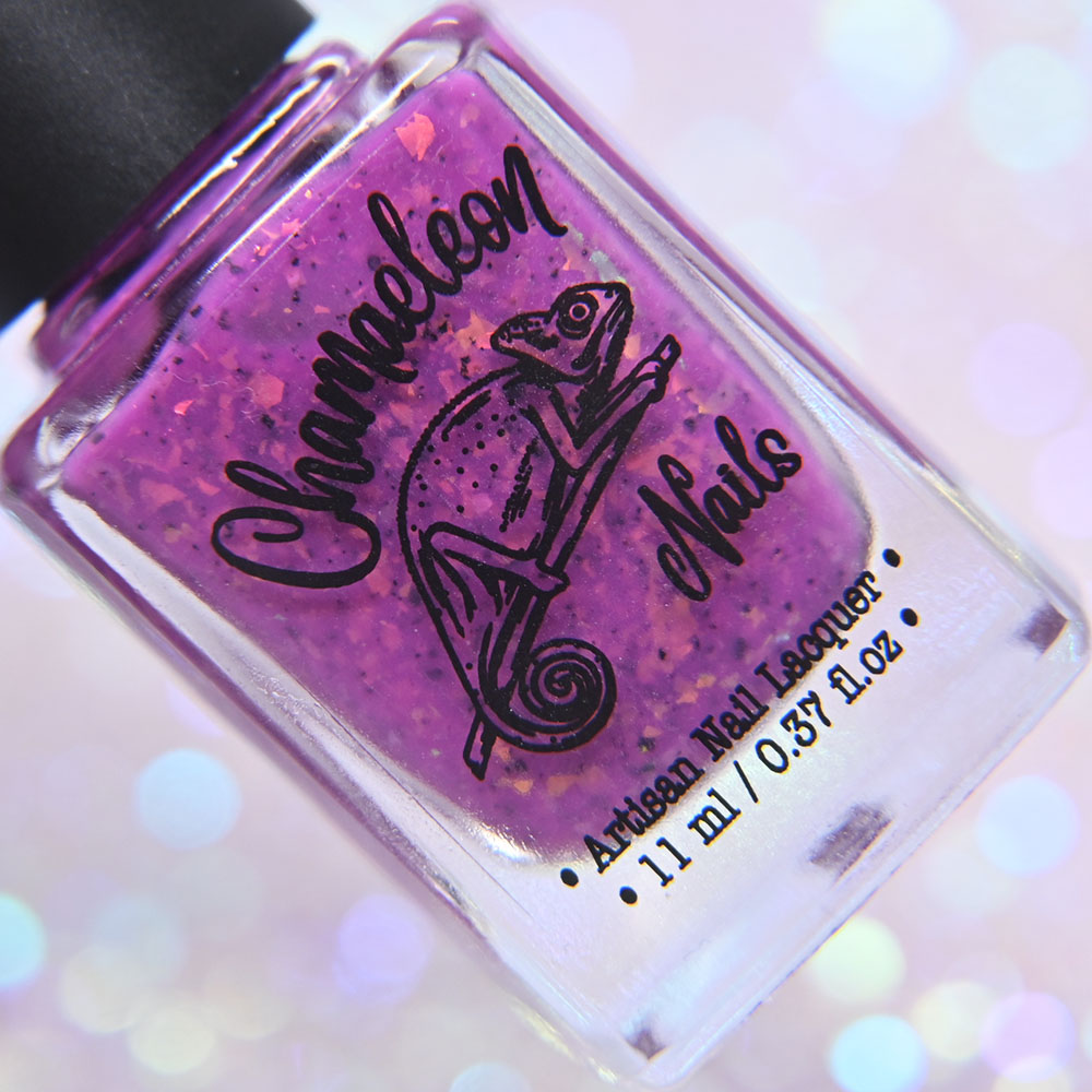 Description: Psychedelic Glow a purple jelly base with pink to green to yellow to lime shifting crystal flakes, and black flakes.