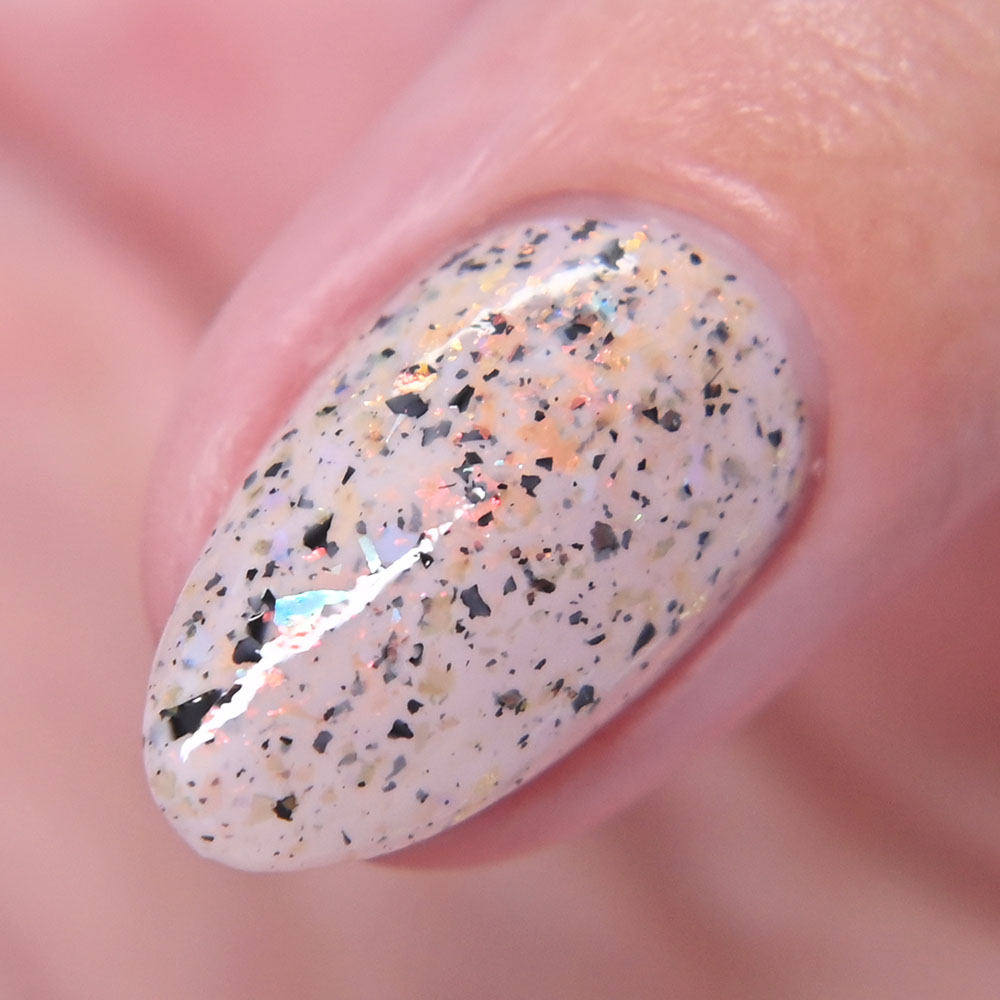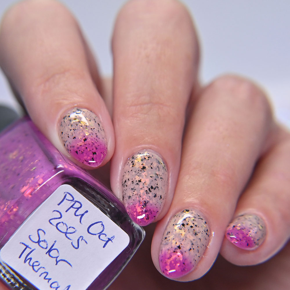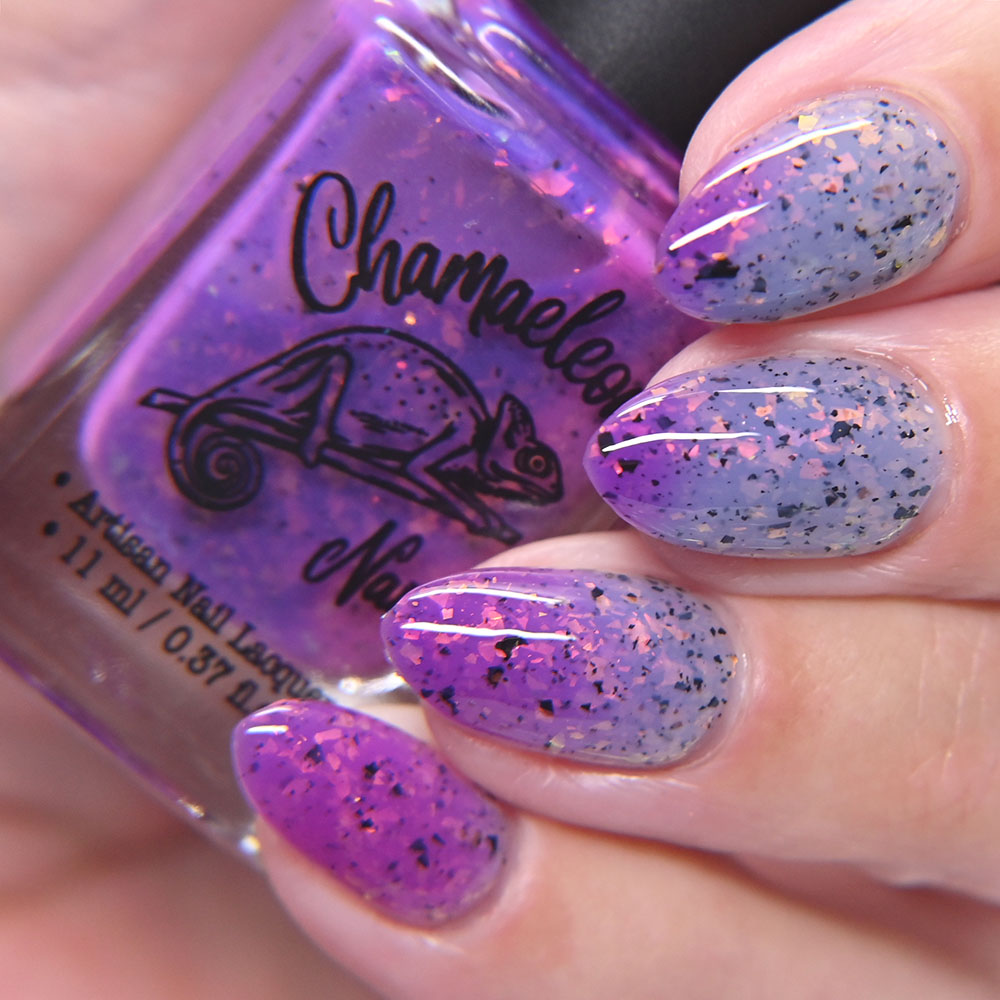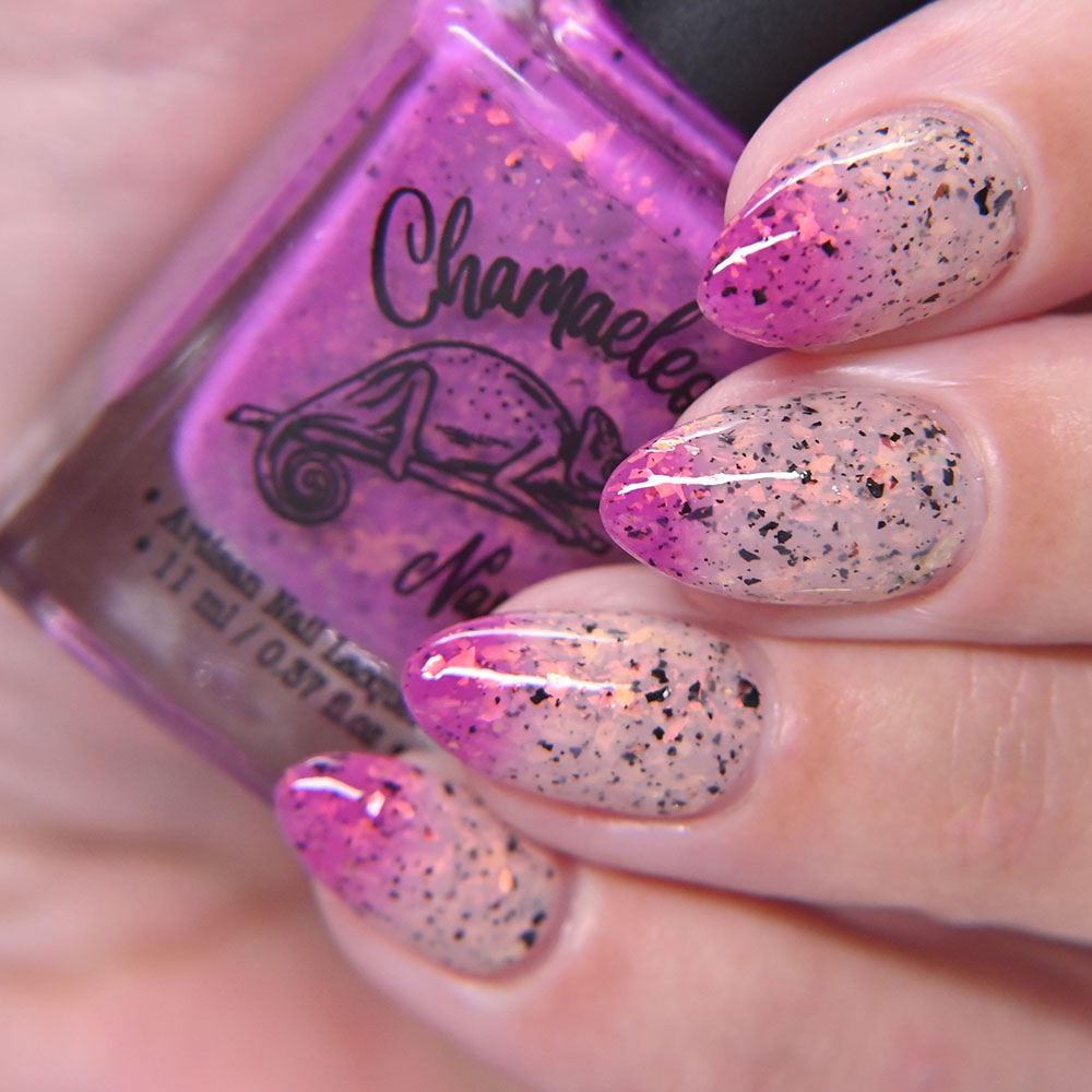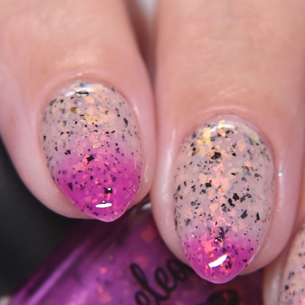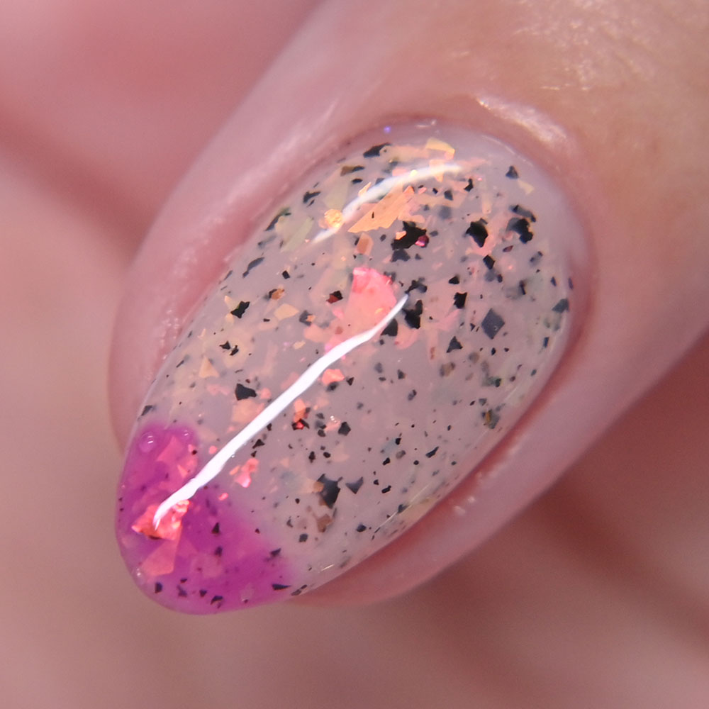 Description: Phantom Shoreline is a thermal and solar polish. This shade goes from sheer white (warm with no UV) to fuchsia pink (cold, no UV) to purple (cold with UV) to lilac blue (warm, with UV) plus it has black matte flakes and iridescent orange to gold flakes.