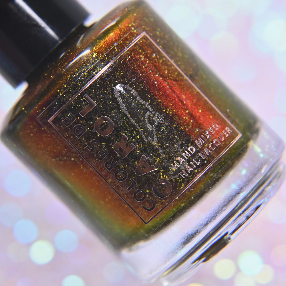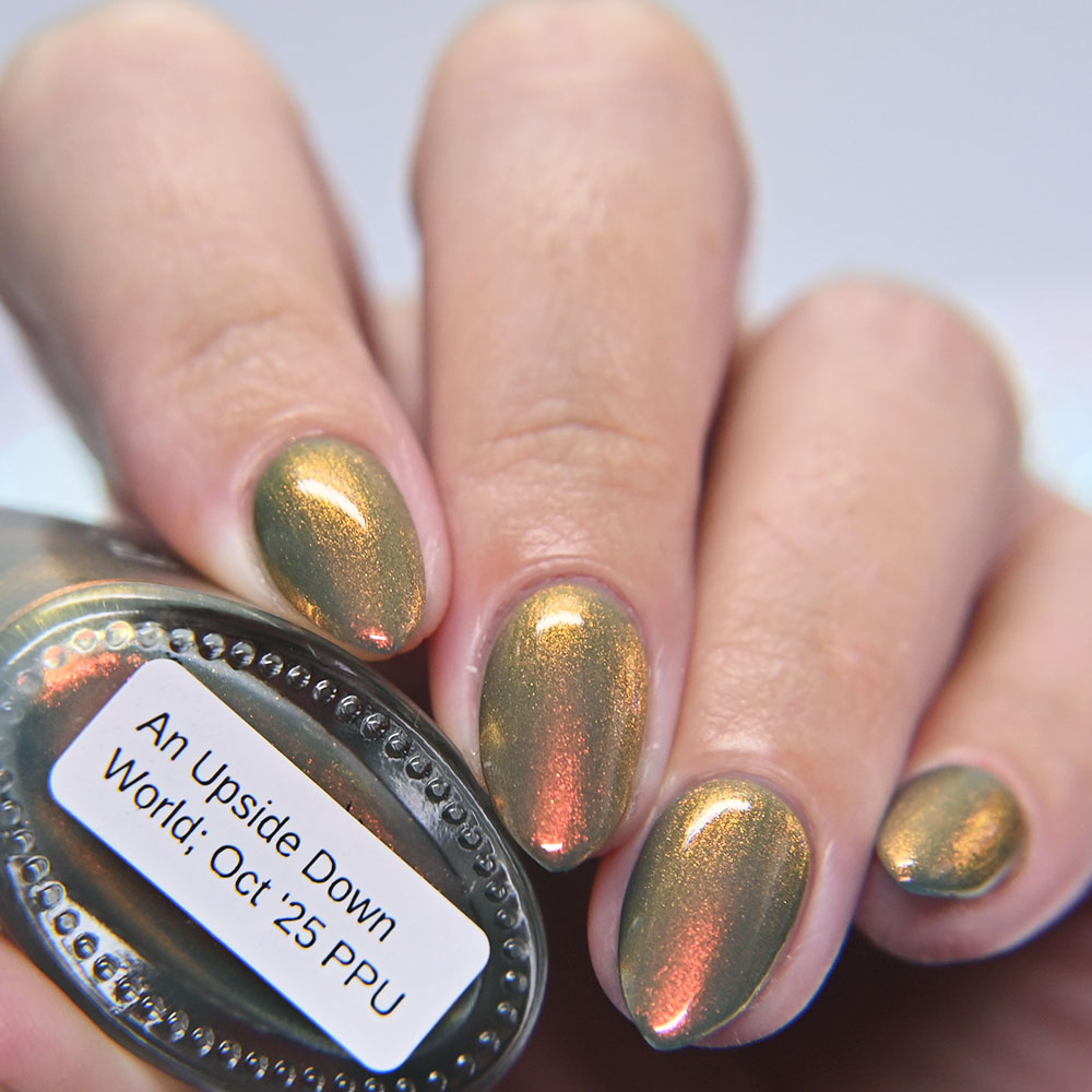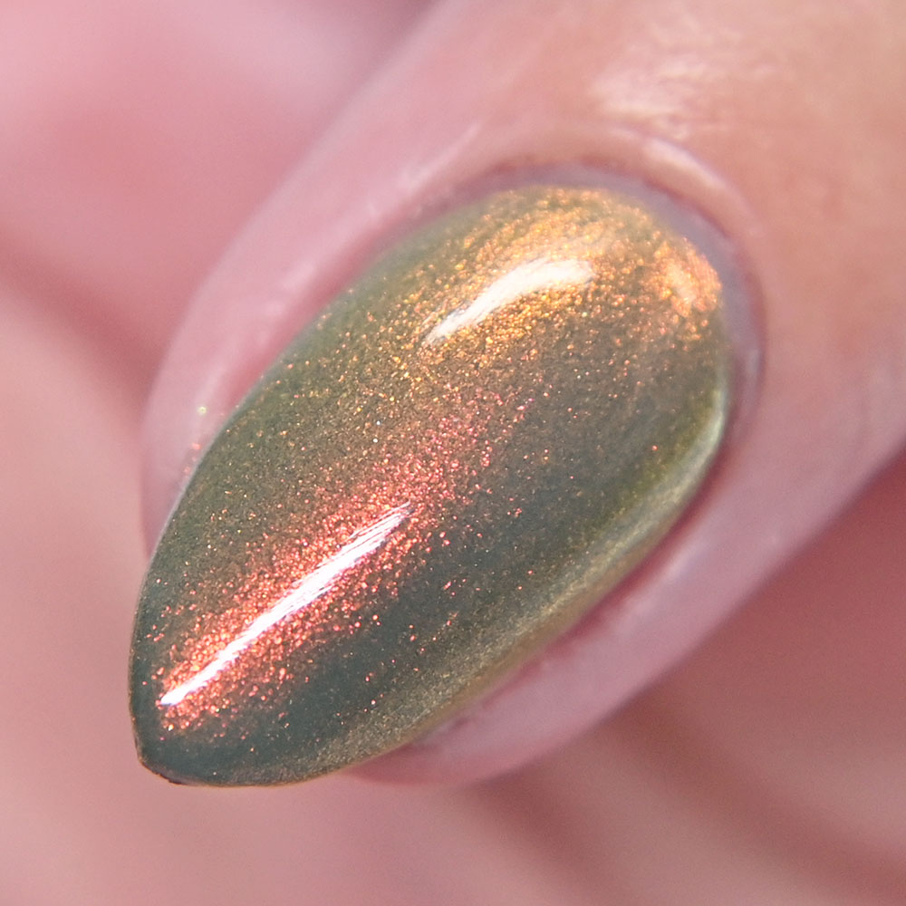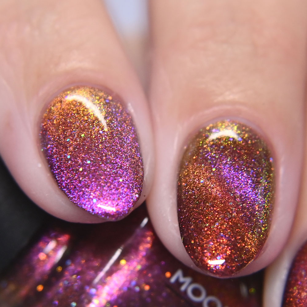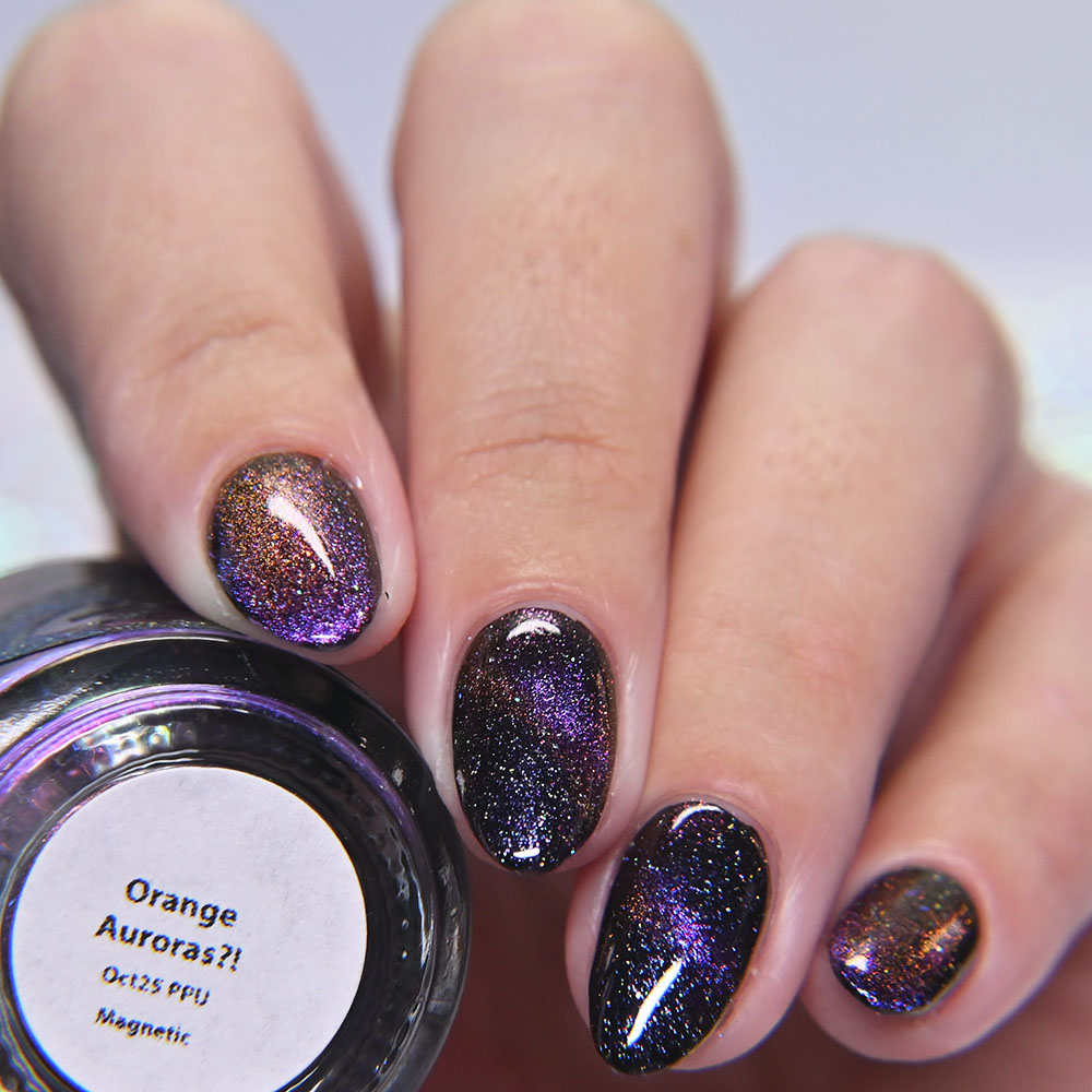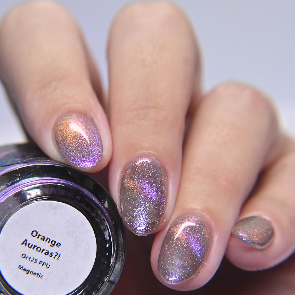Description: Orange Auroras?! is a shimmery magnetic topper. It shifts through the rainbow starting at green, gold, orange, pink, and purple with holo micro flakes and pink to purple shifting magnetic pigment.
