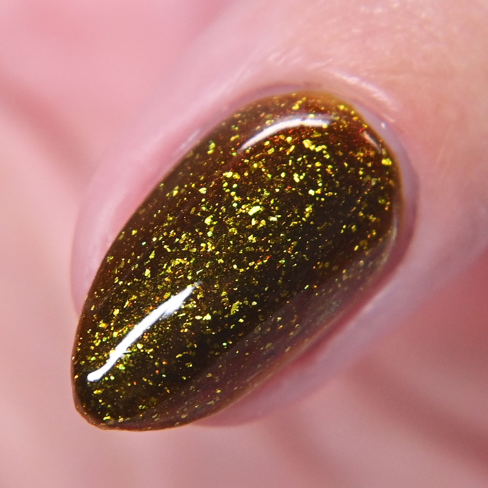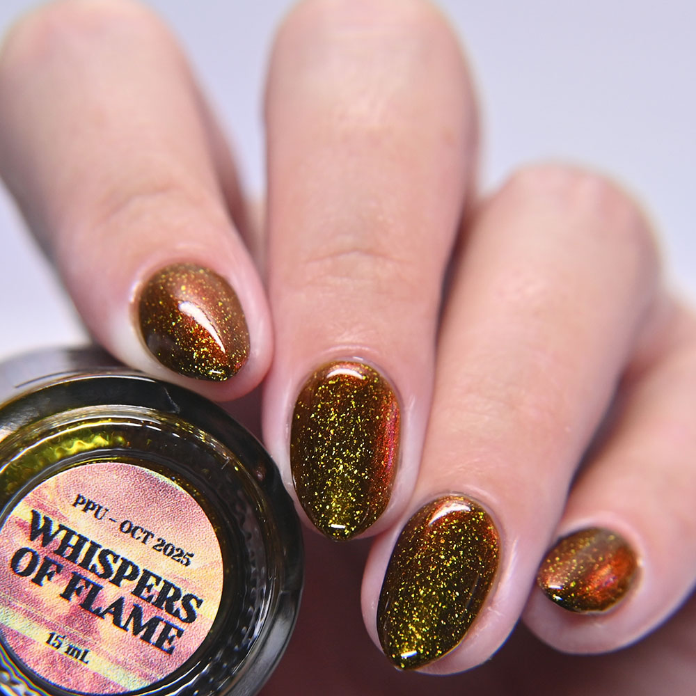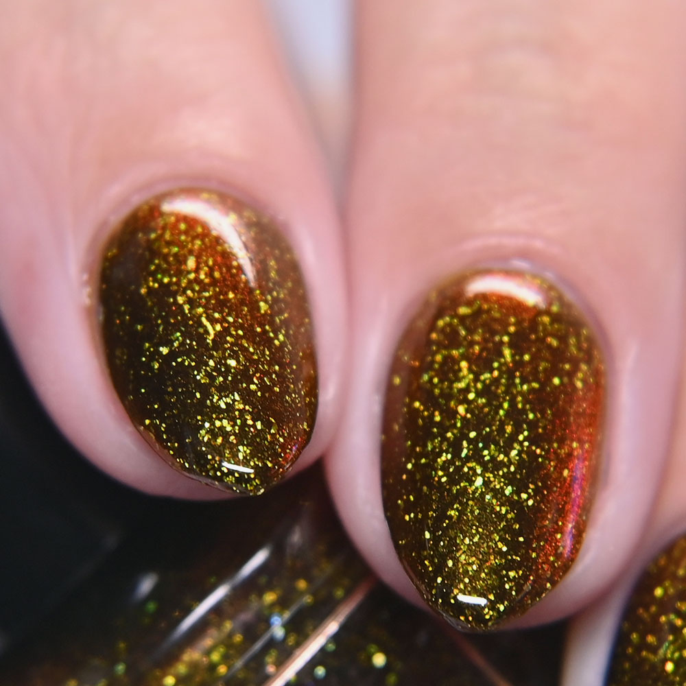 Description: Whispers of Flame is an amber golden yellowish olive base with red to black shifting shimmer and holo flakes.