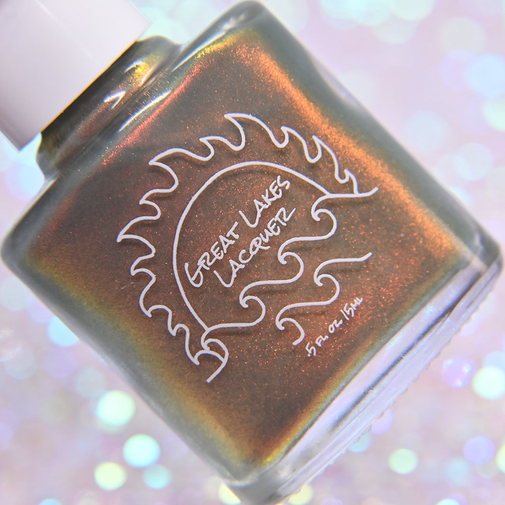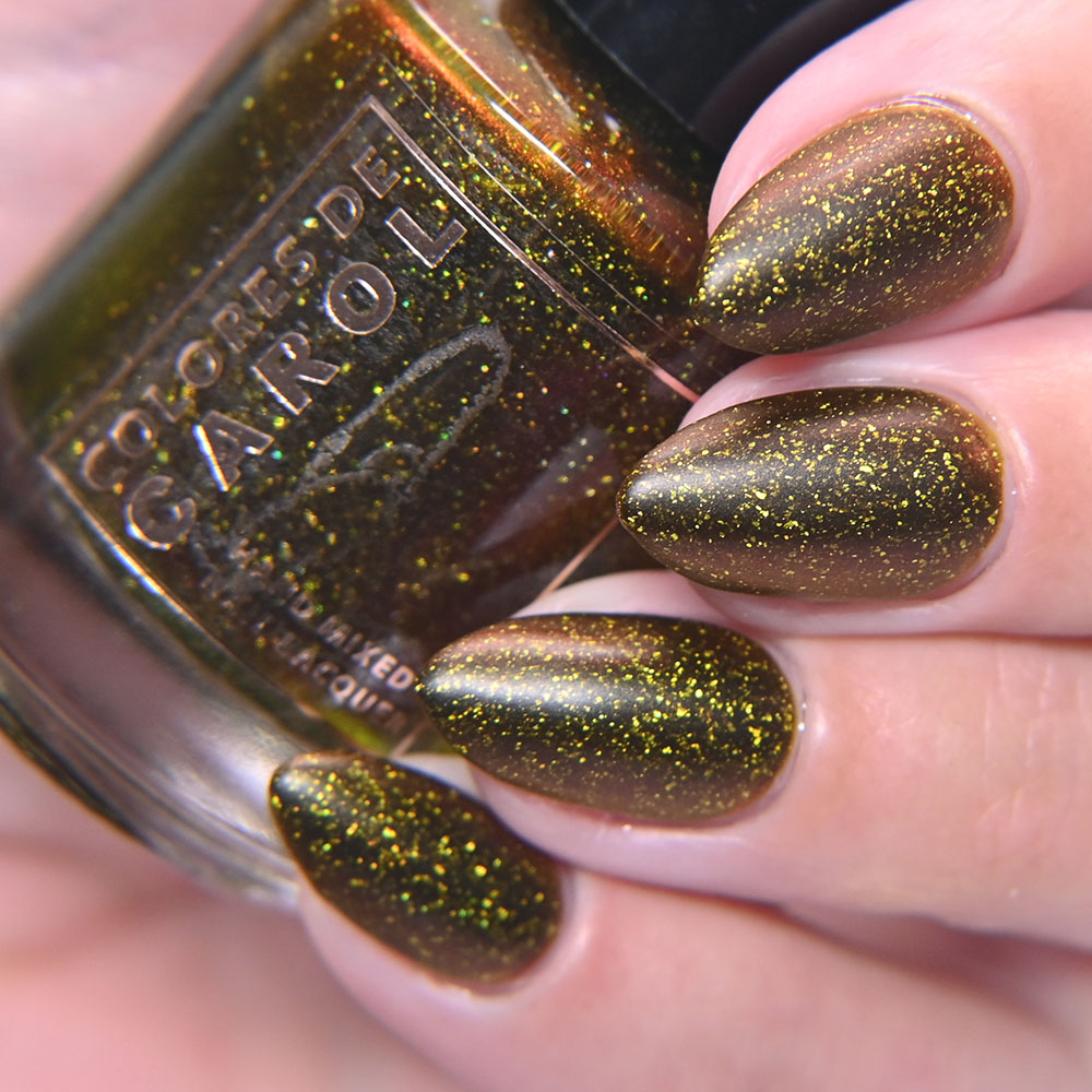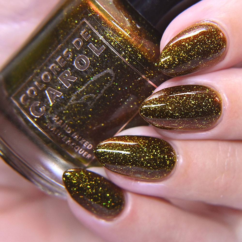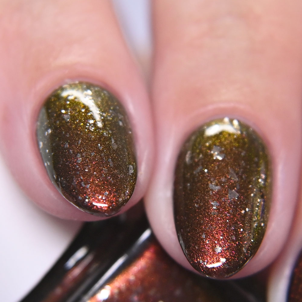 Description: Whispers of Flame is an amber golden yellowish olive base with red to black shifting shimmer and holo flakes.