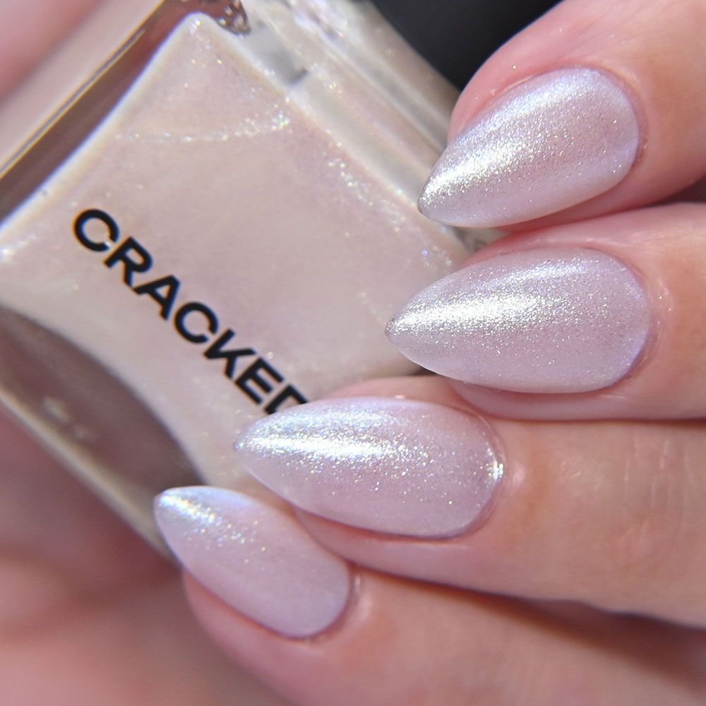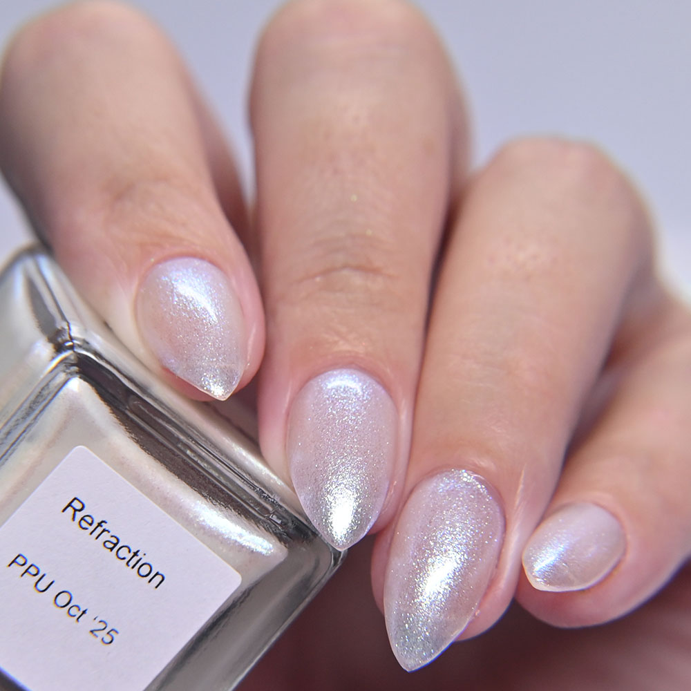 Description: Refraction is a sheer white base with soft green, silver and blue shimmers.