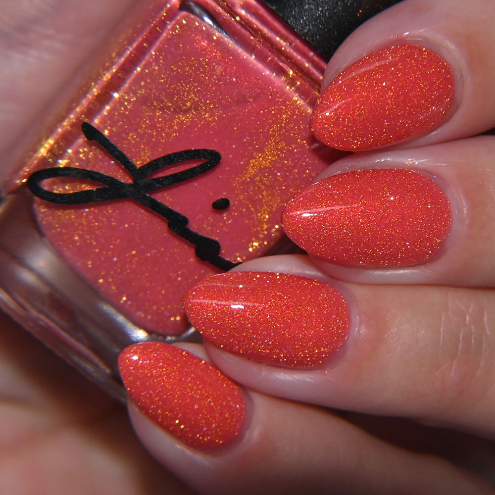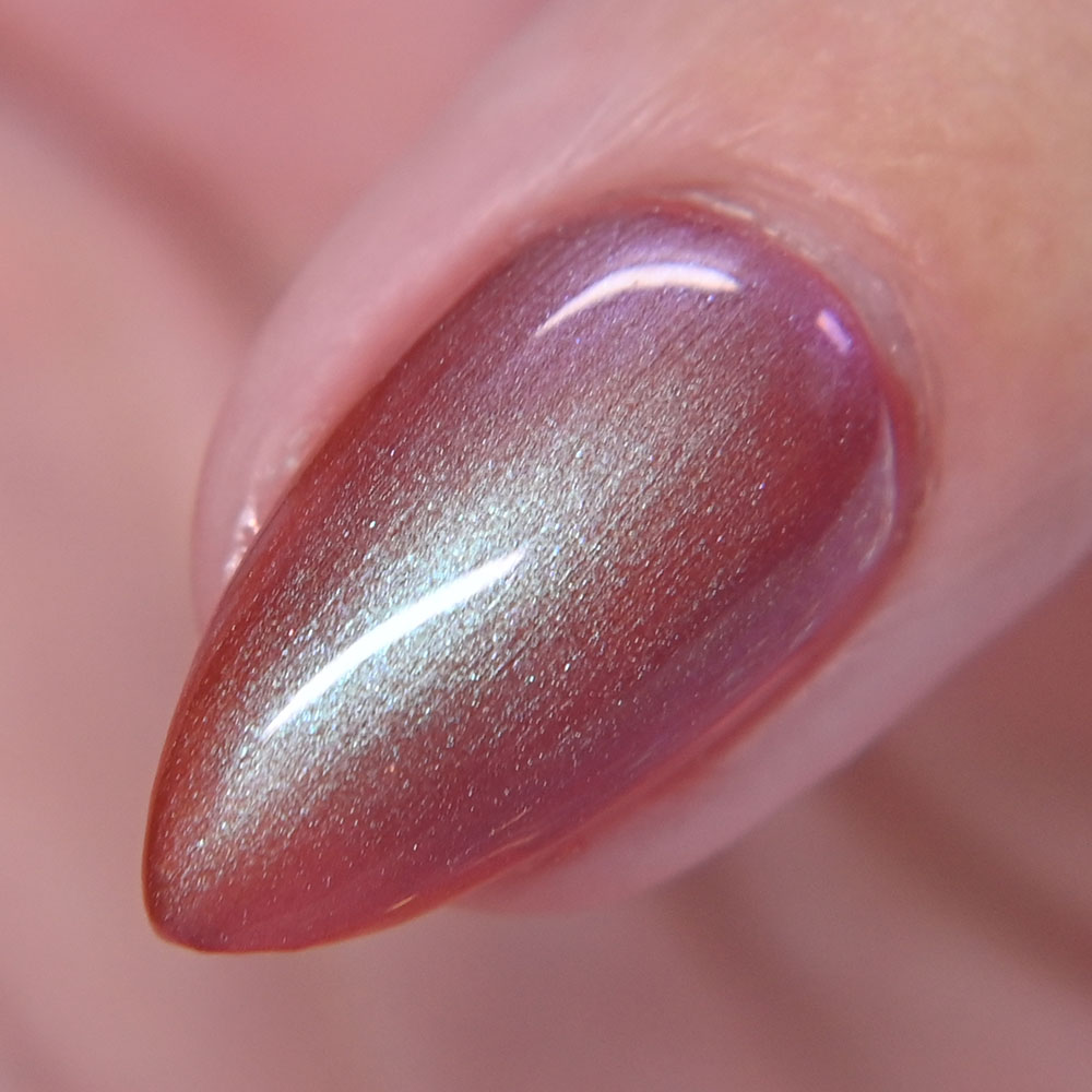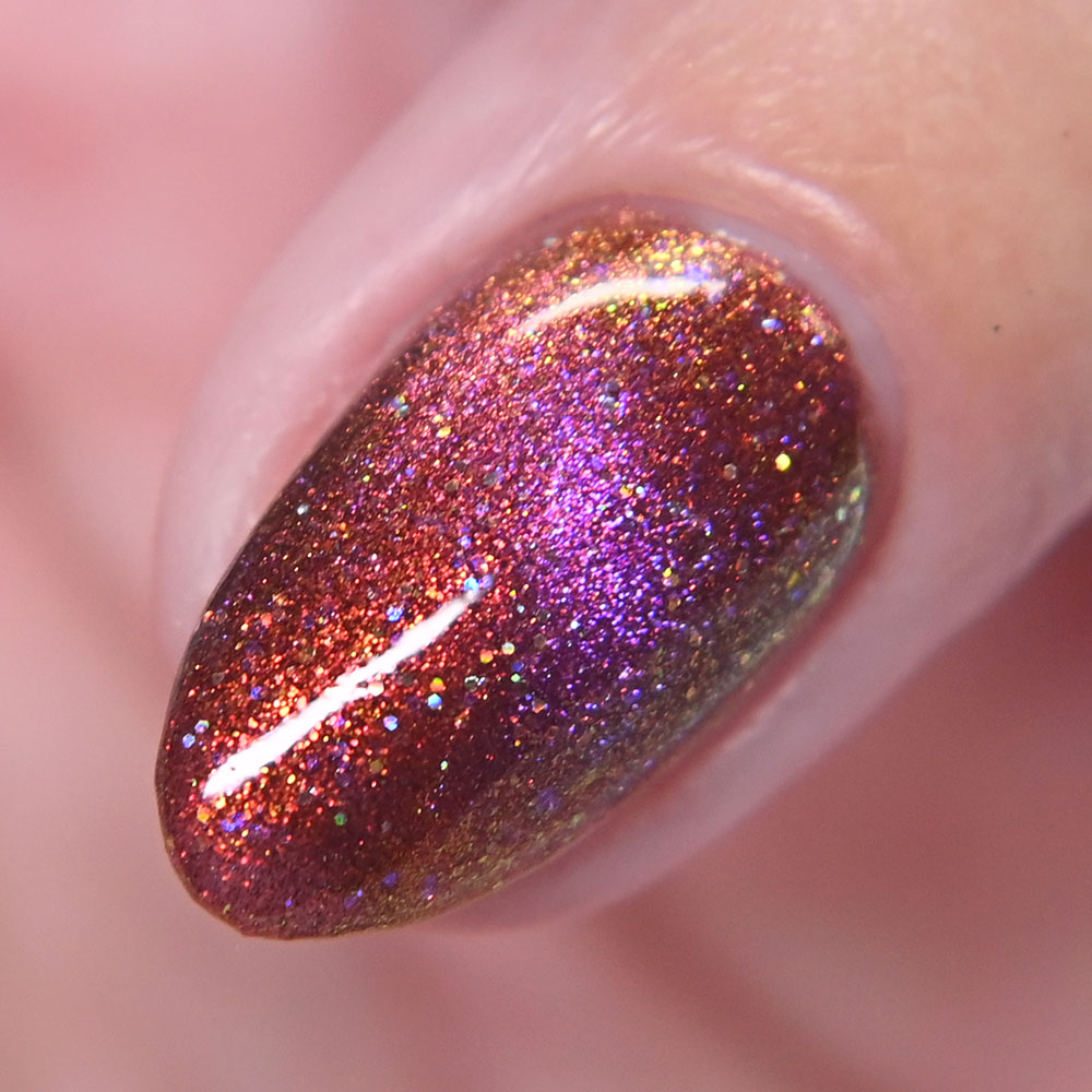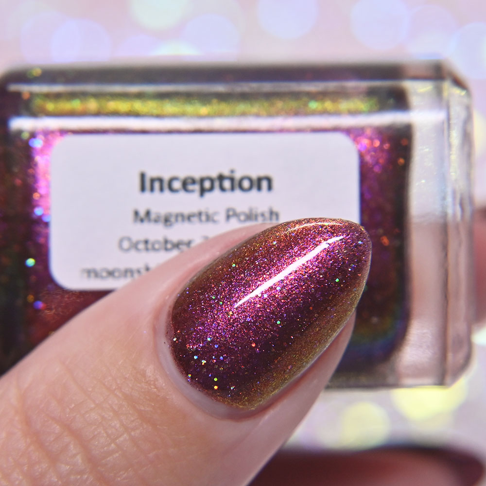 Description: Inception is a brick red jelly base with red to gold to green iridescent shimmer, fuchsia. to red to gold to green magnetic shimmer, gold holo microglitters, and red to blue twinkling microglitters.