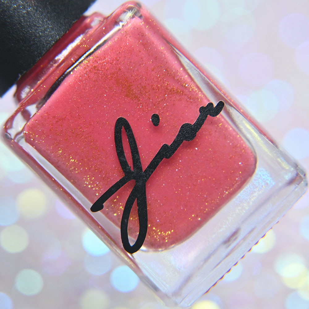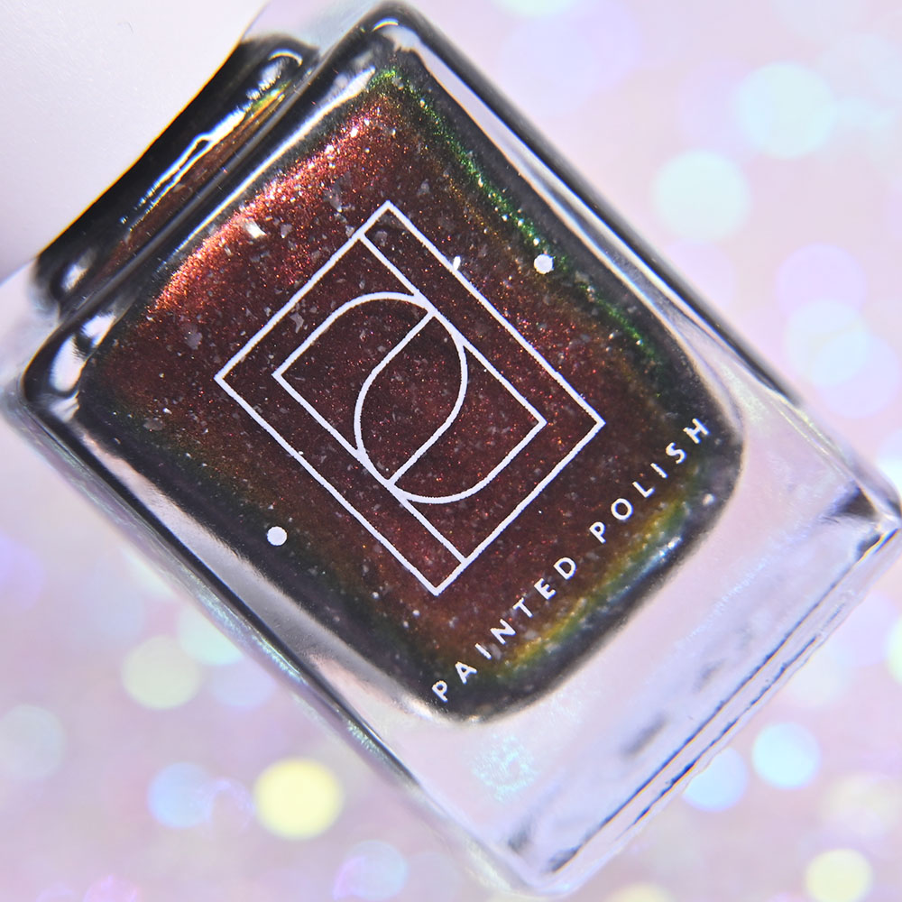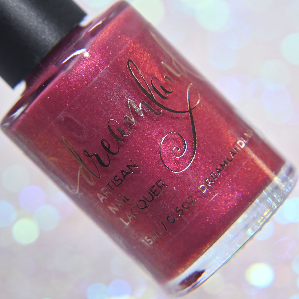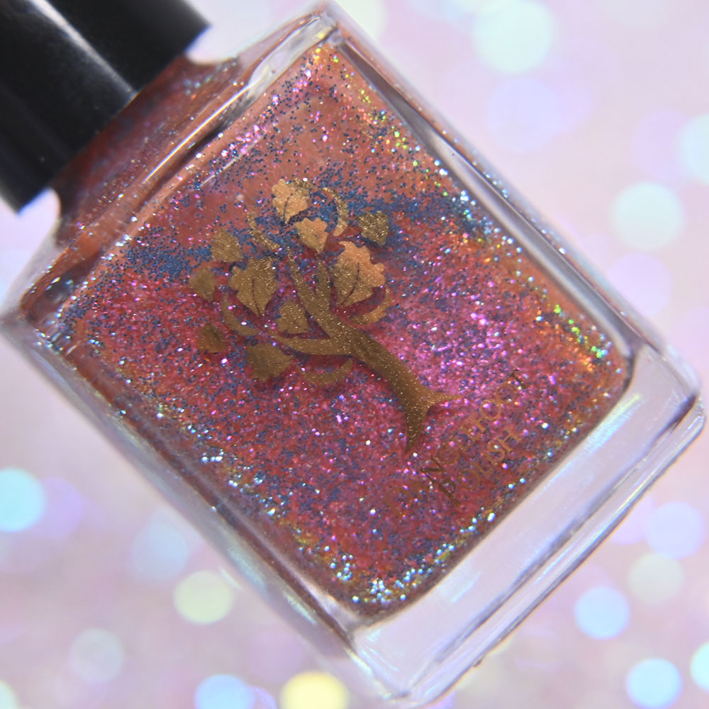 Description: Inception is a brick red jelly base with red to gold to green iridescent shimmer, fuchsia. to red to gold to green magnetic shimmer, gold holo microglitters, and red to blue twinkling microglitters.